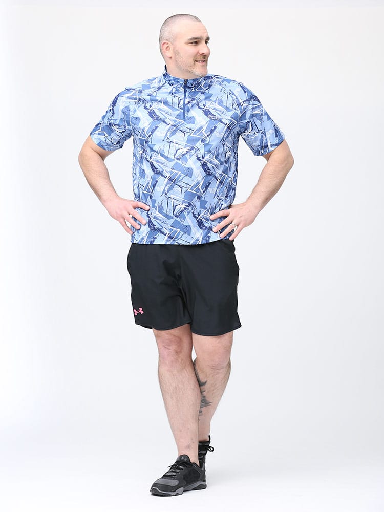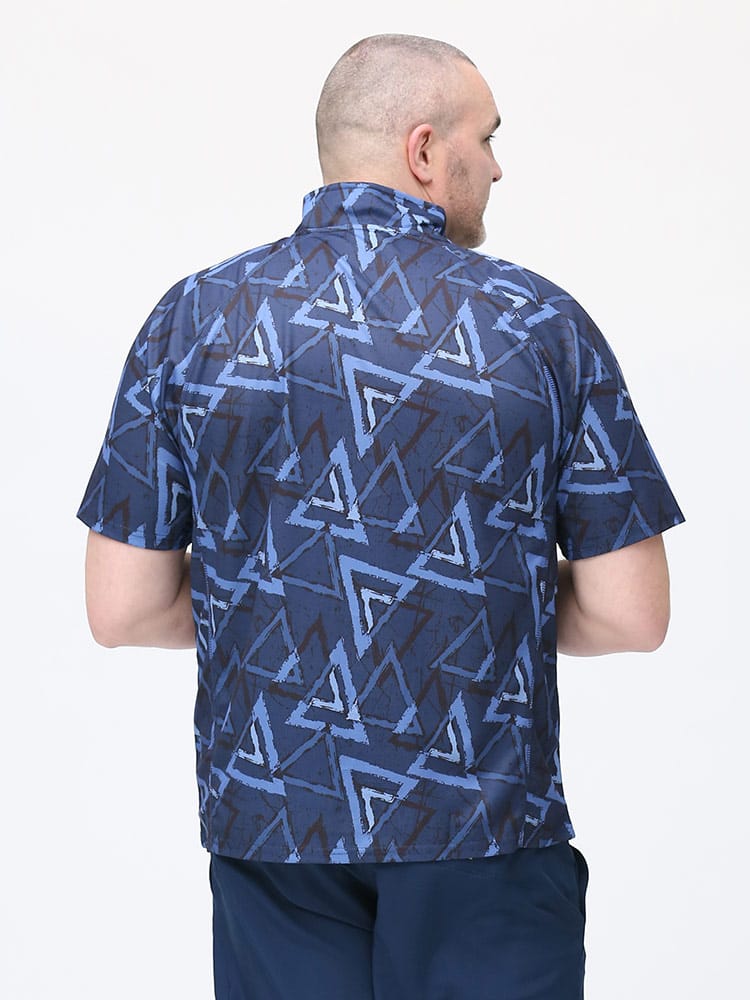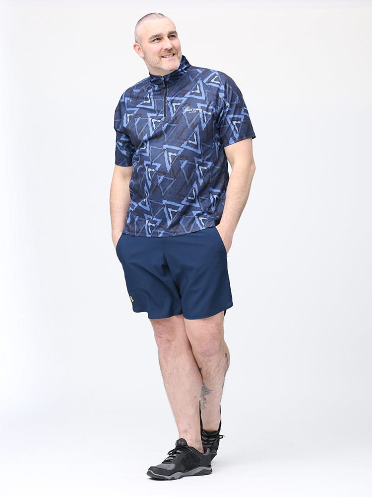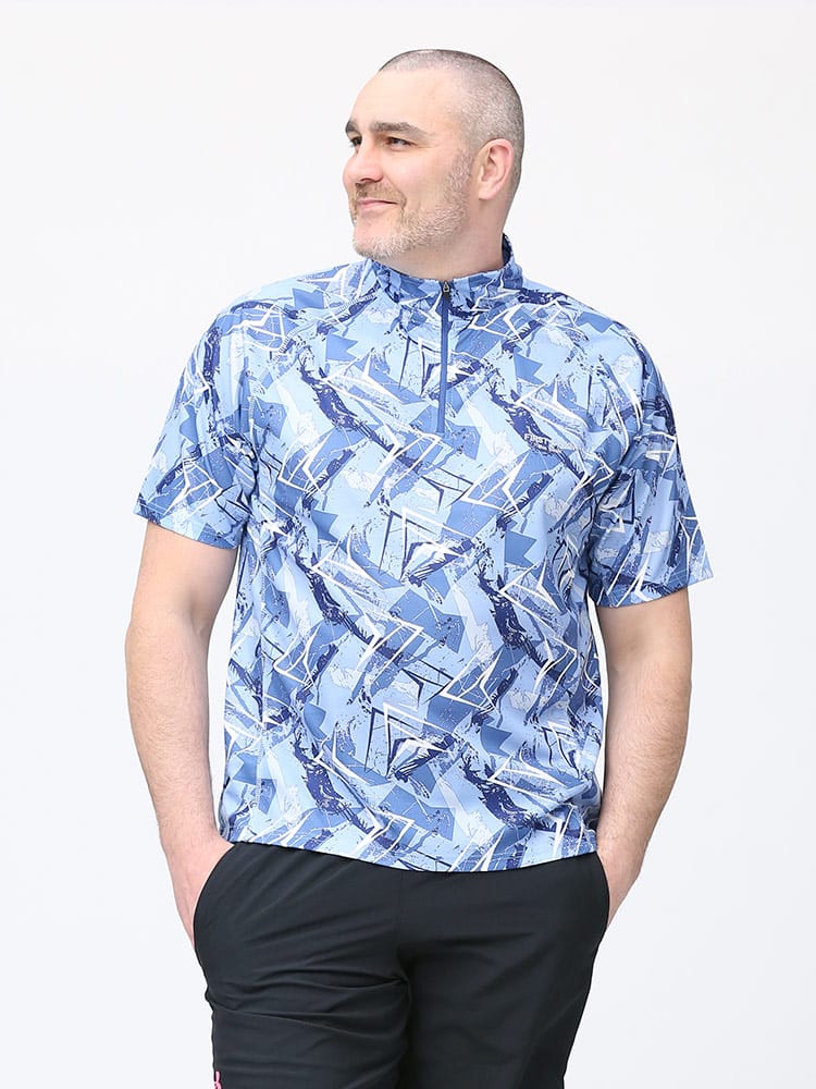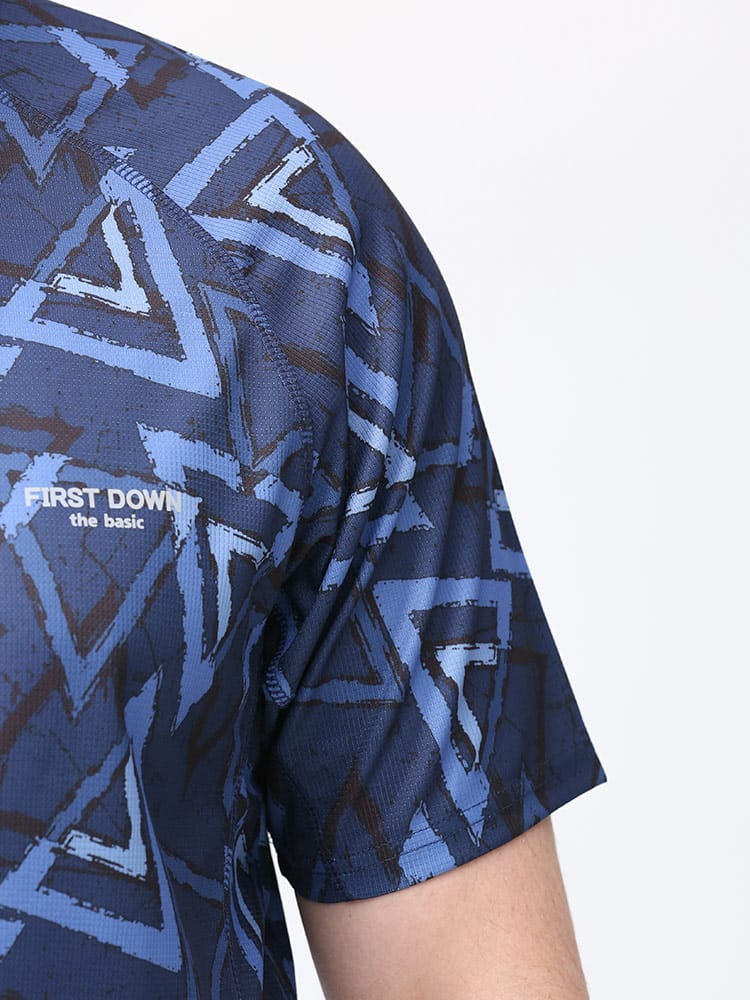吸水速乾が付いたFIRST DOWN BASICの総柄プリント ハーフジップ 半袖 シャツ。総柄プリントに左胸のロゴがポイント。吸水速乾、紫外線対策、通気性、裏側ドライタッチで快適な着心地です。首元は着脱が楽なハーフジップデザイン。アウトドアやアクティブシーンにおすすめの一枚です。