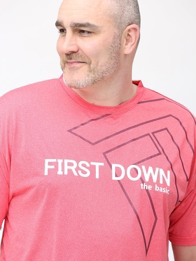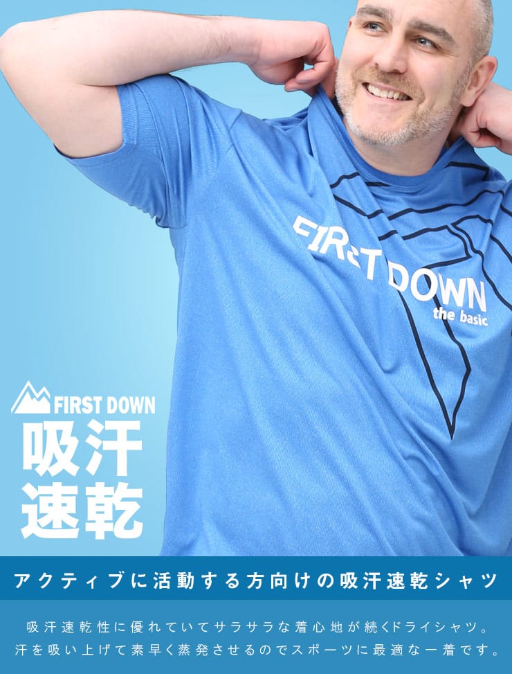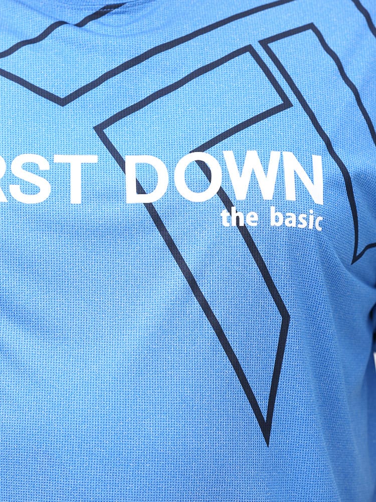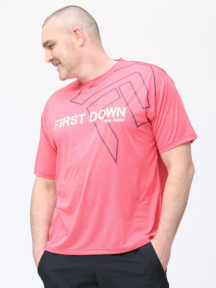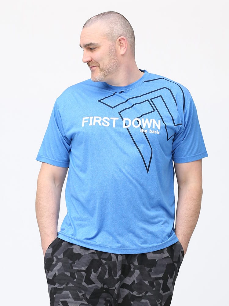 吸水速乾が付いたFIRST DOWN BASICのカチオン ワッフル クルーネック 半袖 Tシャツ。フロントに大きくロゴをプリントした目を引くデザイン。首元はベーシックなクルーネック。アウトドアやアクティブシーンにおすすめの一枚です。