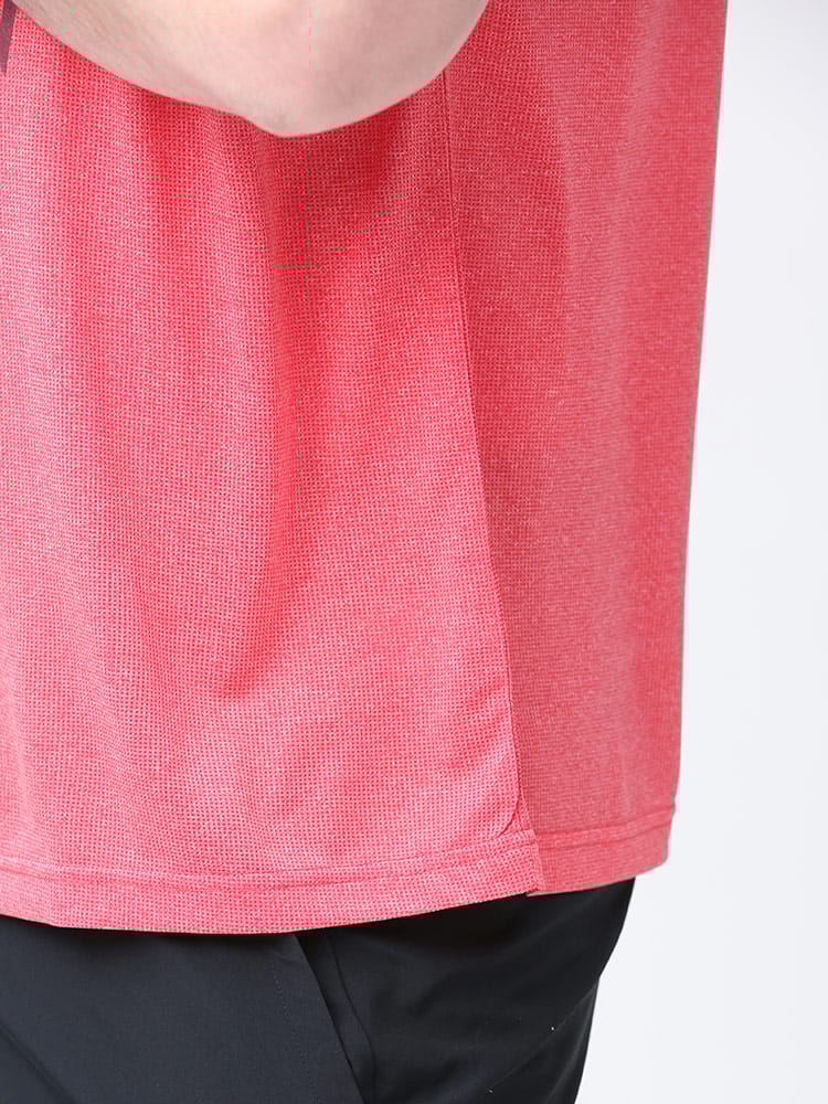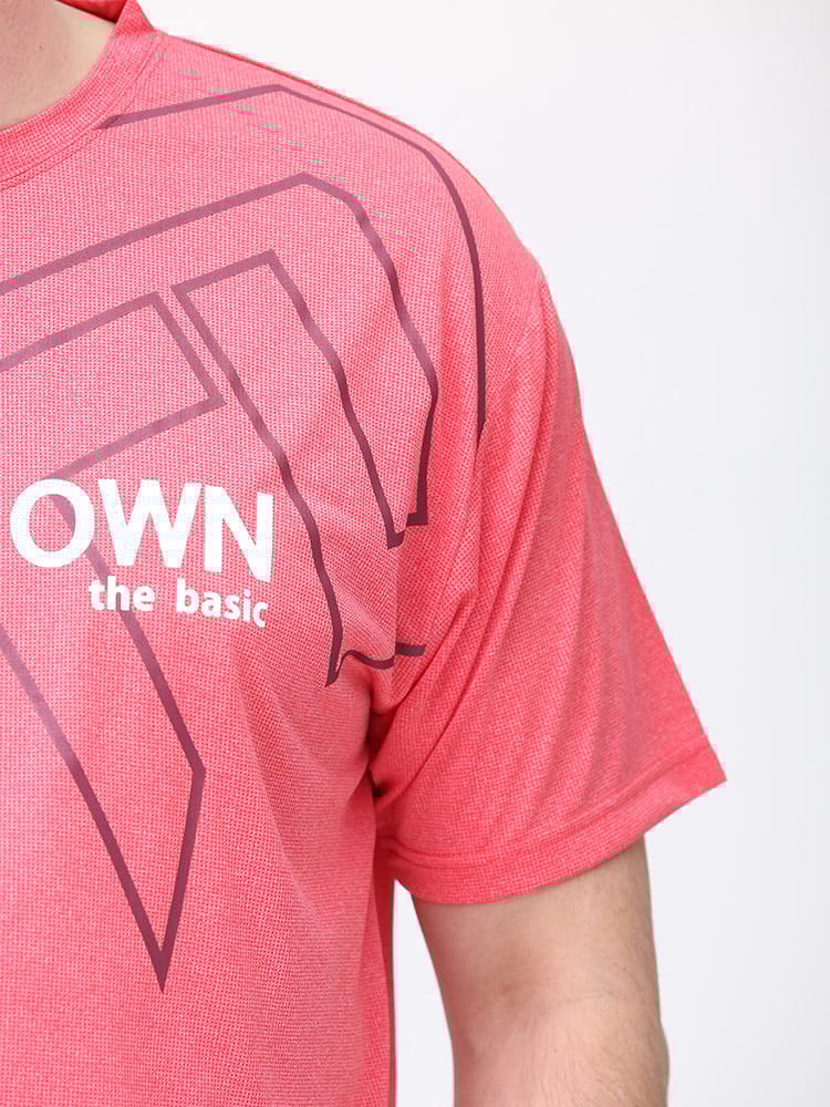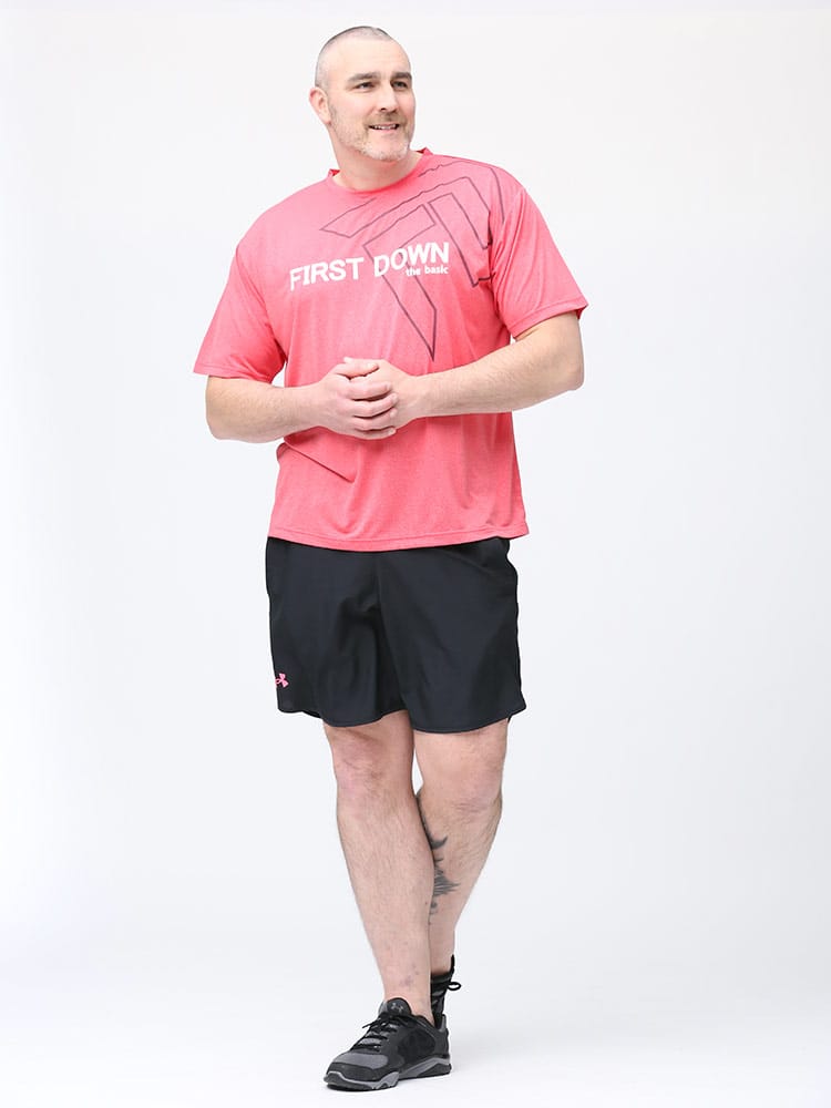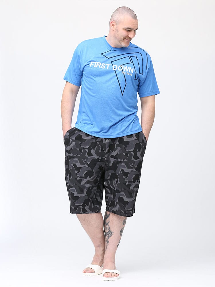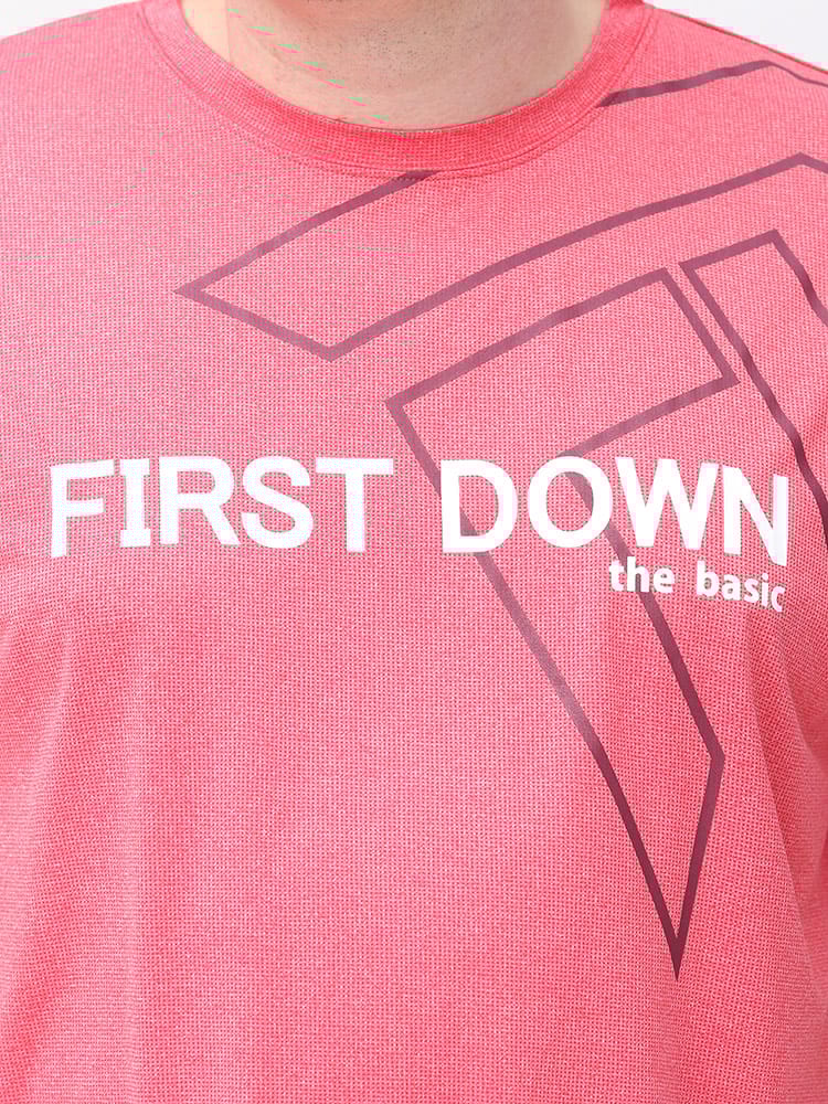 吸水速乾が付いたFIRST DOWN BASICのカチオン ワッフル クルーネック 半袖 Tシャツ。フロントに大きくロゴをプリントした目を引くデザイン。首元はベーシックなクルーネック。アウトドアやアクティブシーンにおすすめの一枚です。