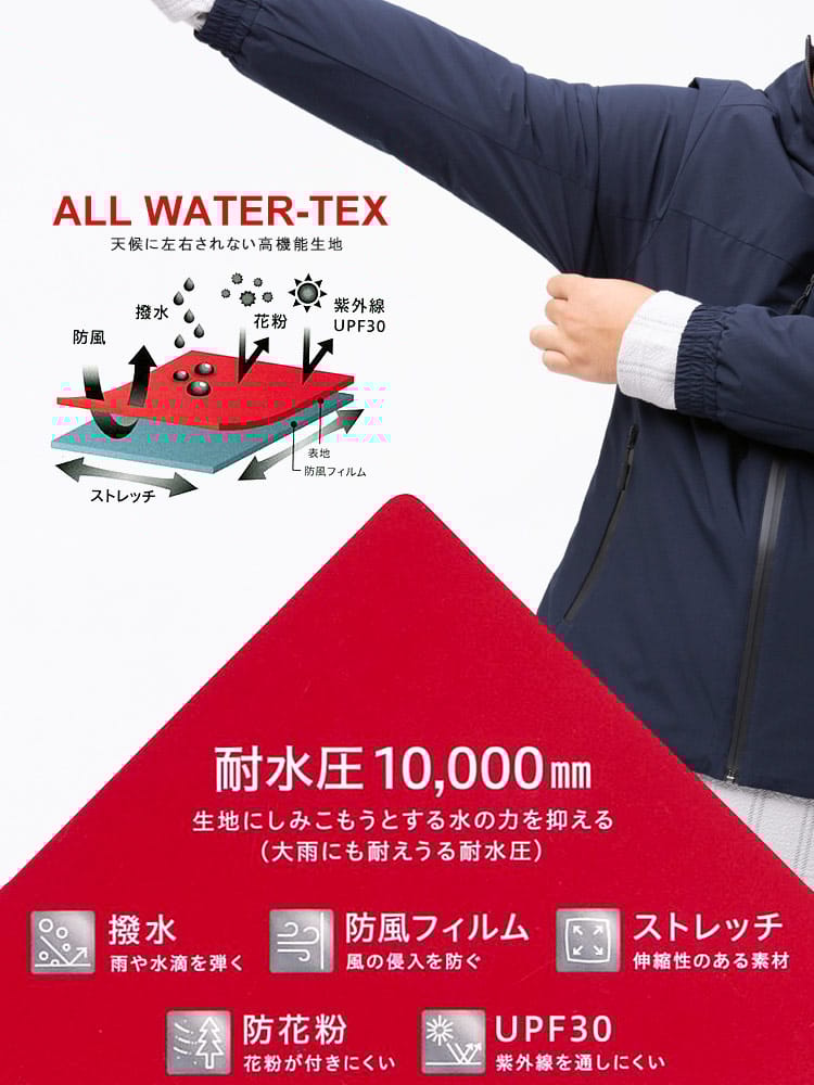 仕様 :外側ポケット数×2つ / シングルジップ / 撥水 / 防風フィルム / ストレッチ / 防花粉 / UPF30