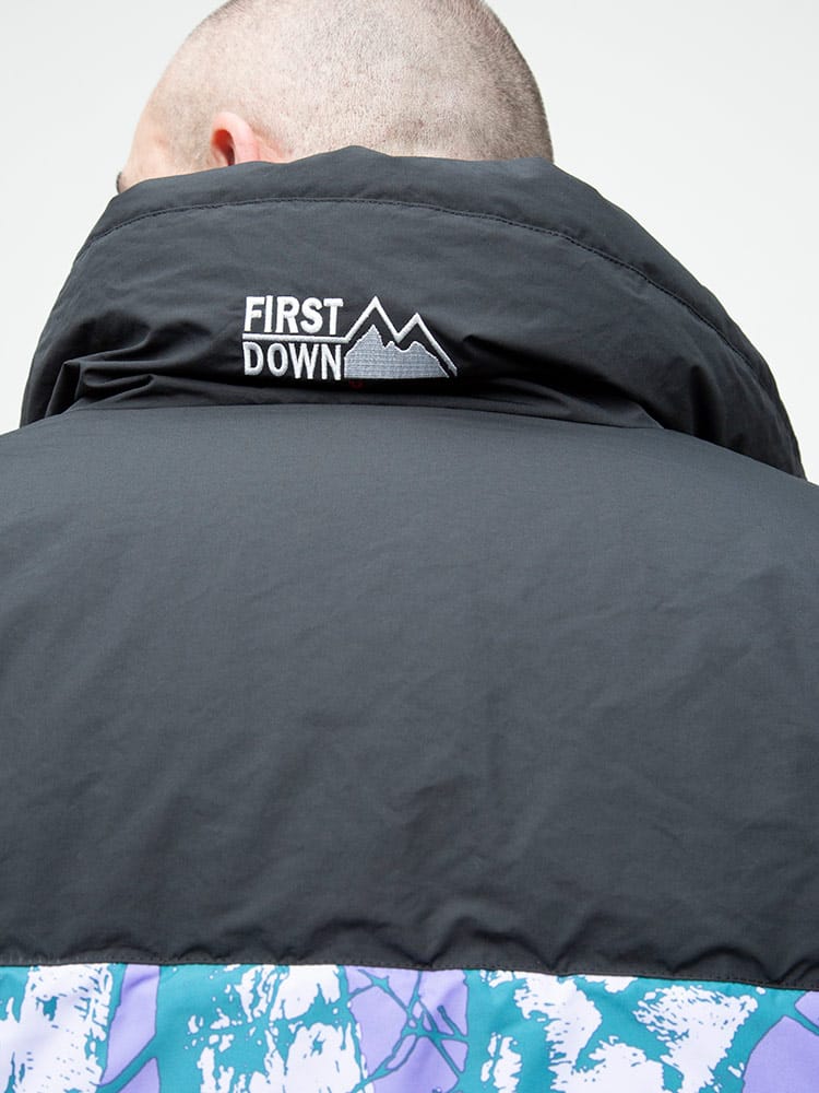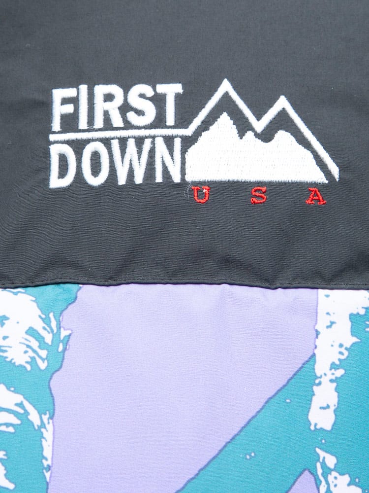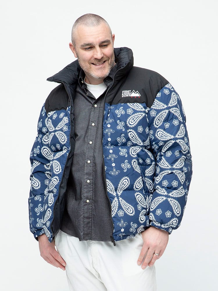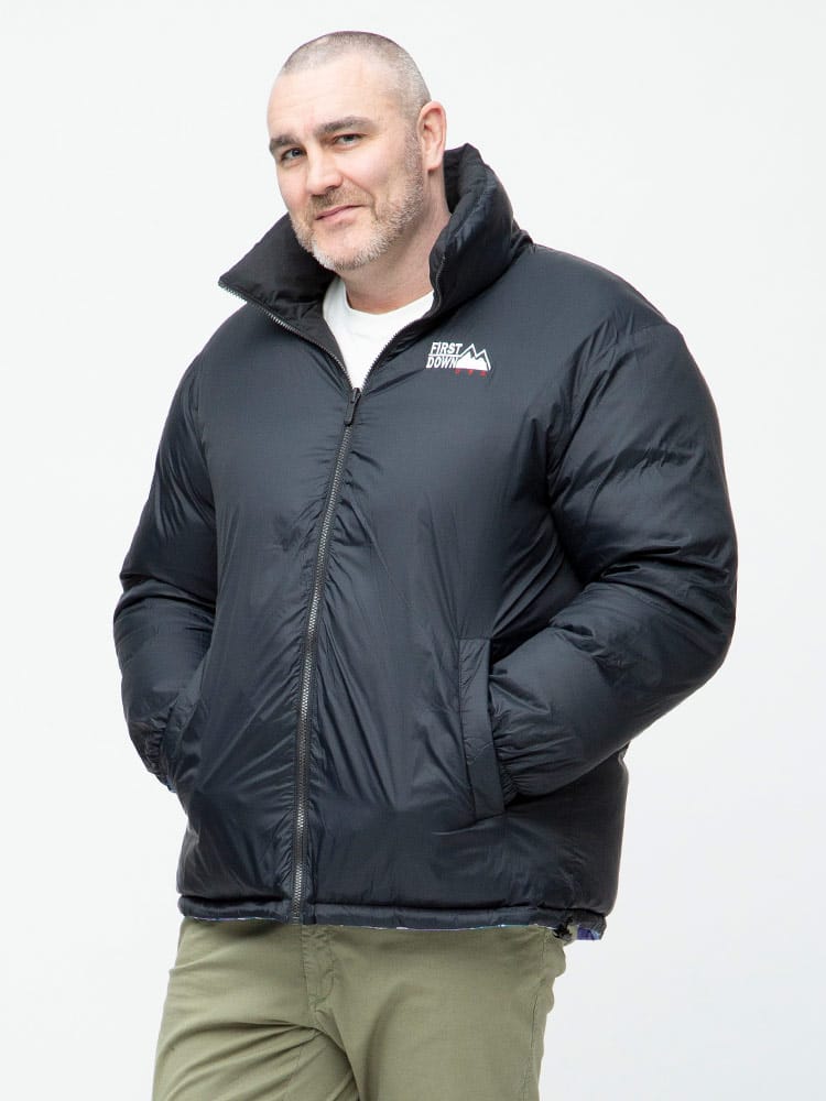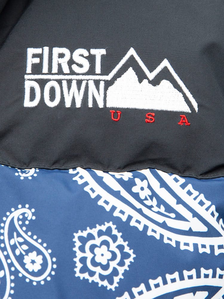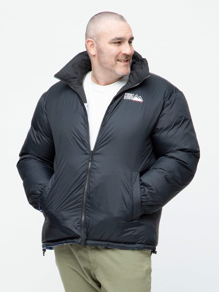FIRST DOWN USAのリバーシブル 切り替え 総柄 フルジップ スタンド ダウン ジャケット。各色、個性を感じる総柄をプリントしたデザイン性の高い一枚。上質なダウンをたっぷりと使い、保温性と適度なボリューム感のあるシルエットが魅力的な一着。裾はコードでサイズ調整が出来ます。リバーシブルデザインで二通りのデザインをお楽しみいただけます。リバーシブル側は各色同様、ブラックとなっています。確かな機能性と優れたデザイン性を持ったスペシャルなアウターです。