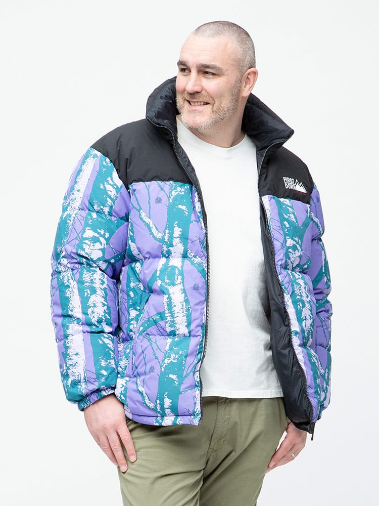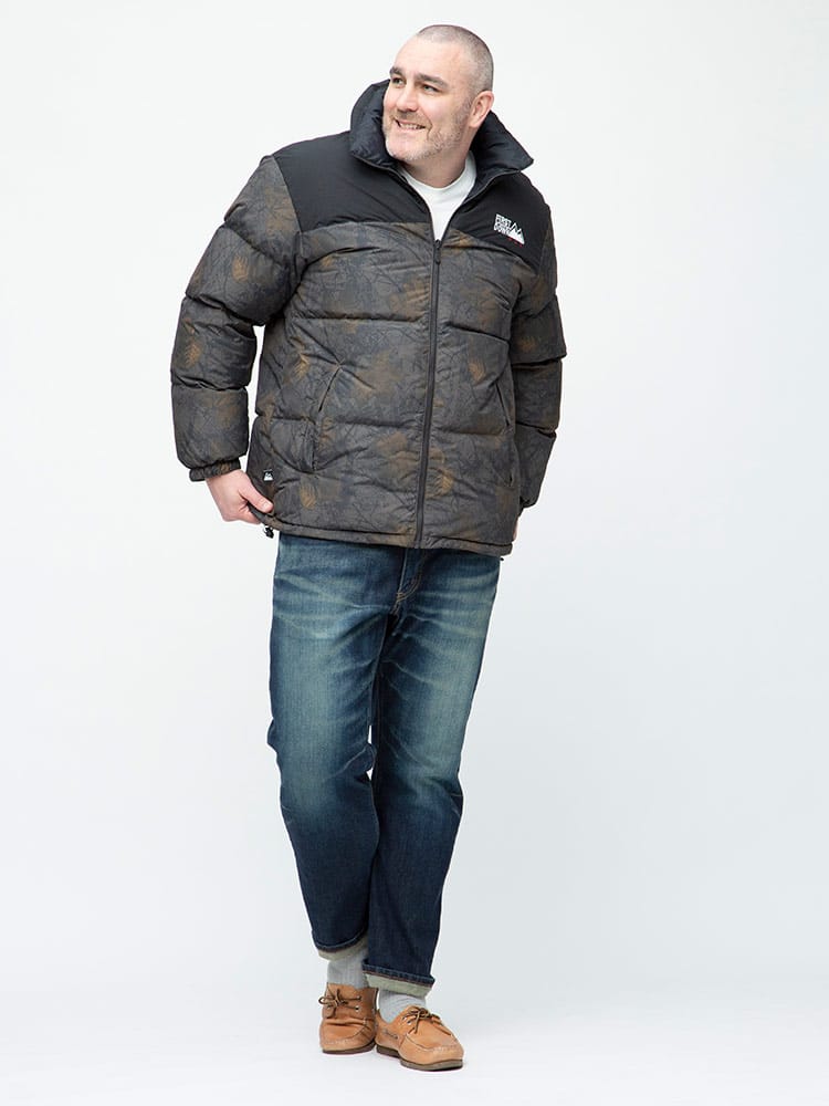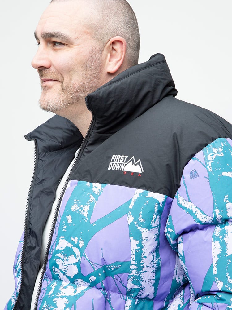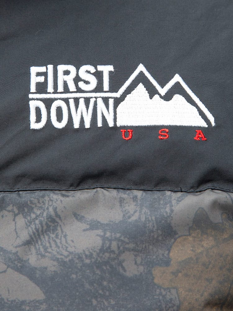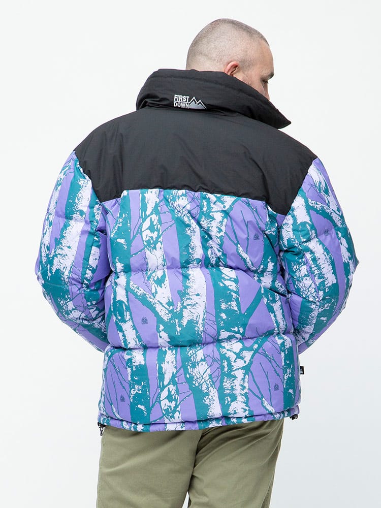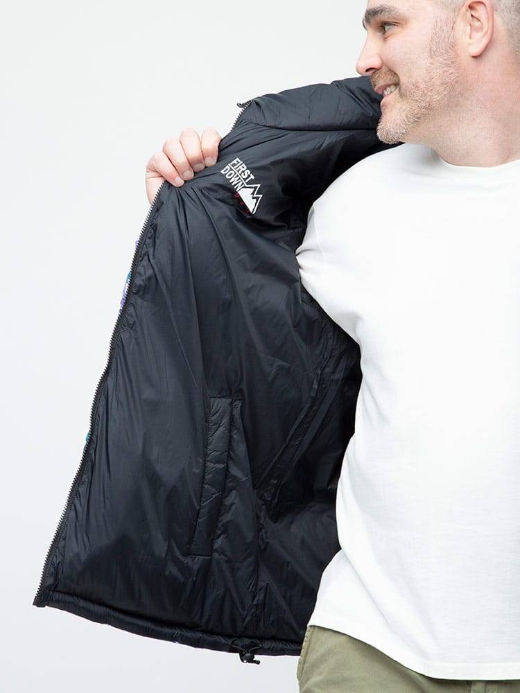 FIRST DOWN USAのリバーシブル 切り替え 総柄 フルジップ スタンド ダウン ジャケット。各色、個性を感じる総柄をプリントしたデザイン性の高い一枚。上質なダウンをたっぷりと使い、保温性と適度なボリューム感のあるシルエットが魅力的な一着。裾はコードでサイズ調整が出来ます。リバーシブルデザインで二通りのデザインをお楽しみいただけます。リバーシブル側は各色同様、ブラックとなっています。確かな機能性と優れたデザイン性を持ったスペシャルなアウターです。