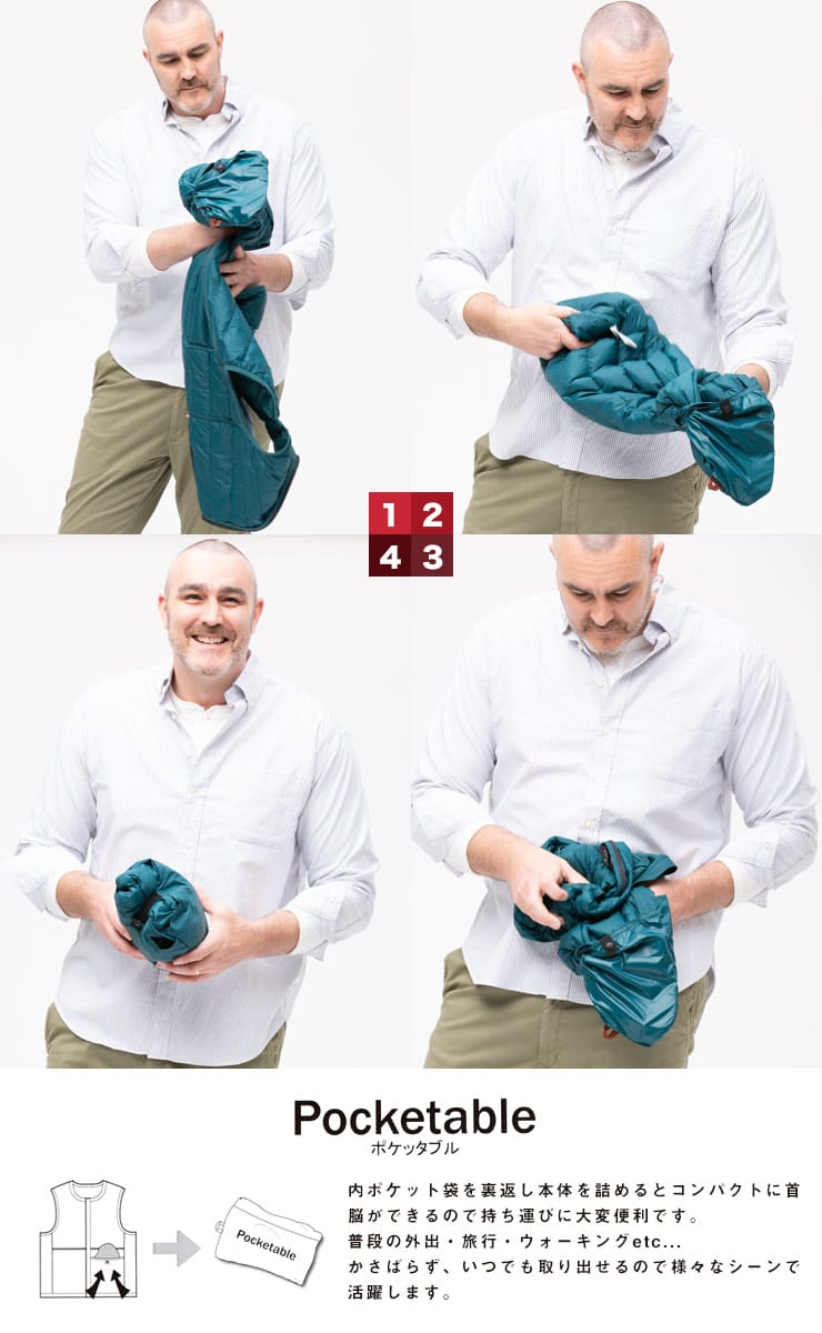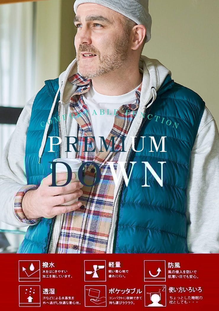 5つの機能を兼ね備えたフルジップ スタンド ライトダウン ベスト。撥水、軽量、汗などを外へ逃がす透湿性、防風性を搭載。また、ポケッタブル仕様でコンパクトに収納でき持ち運びも簡単。ダウンには優れた弾力性、保温性を持った高級羽毛のプレミアム ダウンを使用。無地のシンプルなスタイルで落ち着いたスタイルにマッチするアウターです。