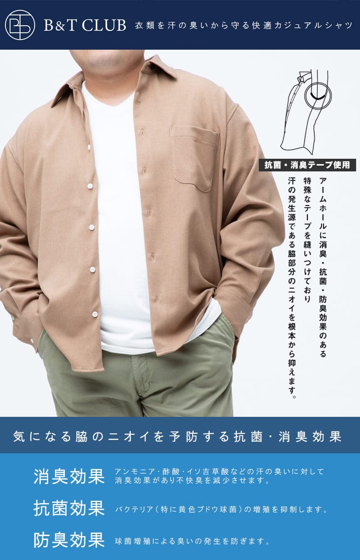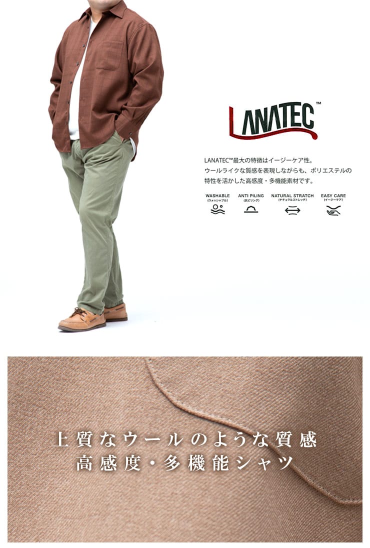 ナチュラルストレッチで快適な着心地の無地&柄 長袖 シャツです。素材に高いイージーケア性があり、ウールライクな質感を表現した高感度、多機能素材のLANATEC(ラナテック)を使用しています。脇下の備えた抗菌消臭テープで【消臭】【抗菌】【防臭】の3つの効果を発揮してくれます。外出の際の汗の臭いを抑えて、人込みでの周囲への気遣いによるストレスを軽減してくれます。大人のカジュアルスタイルにおすすめのアイテムです。