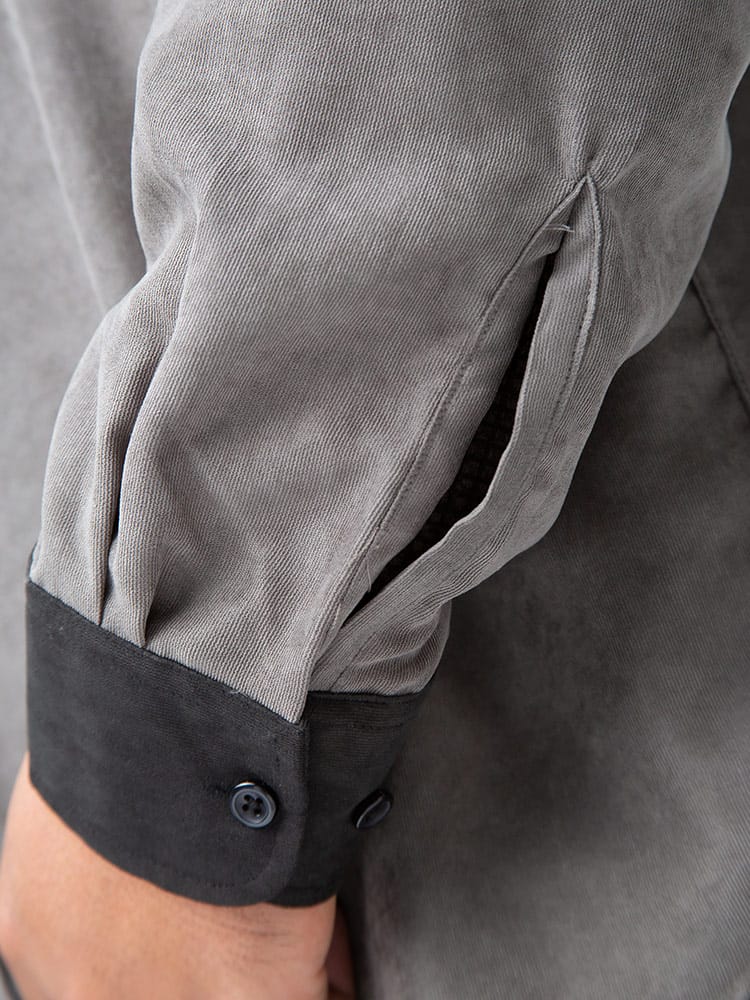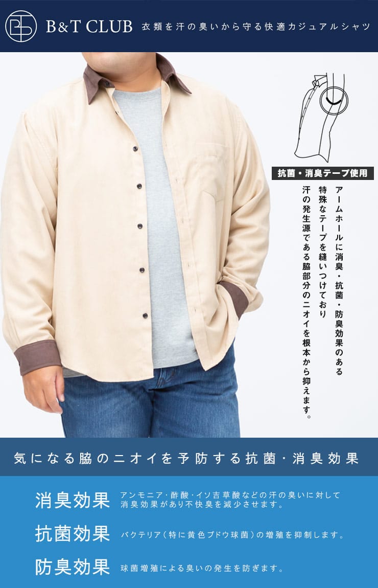 細コーデュロイで品のある襟切り替え 長袖 シャツです。襟切り替えがポイント。脇下の備えた抗菌消臭テープで【消臭】【抗菌】【防臭】の3つの効果を発揮してくれます。外出の際の汗の臭いを抑えて、人込みでの周囲への気遣いによるストレスを軽減してくれます。ベーシックデザインで大人のカジュアルスタイルにおすすめのアイテム。