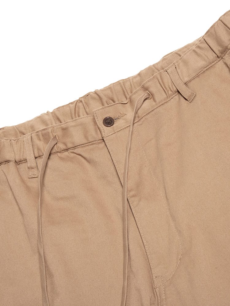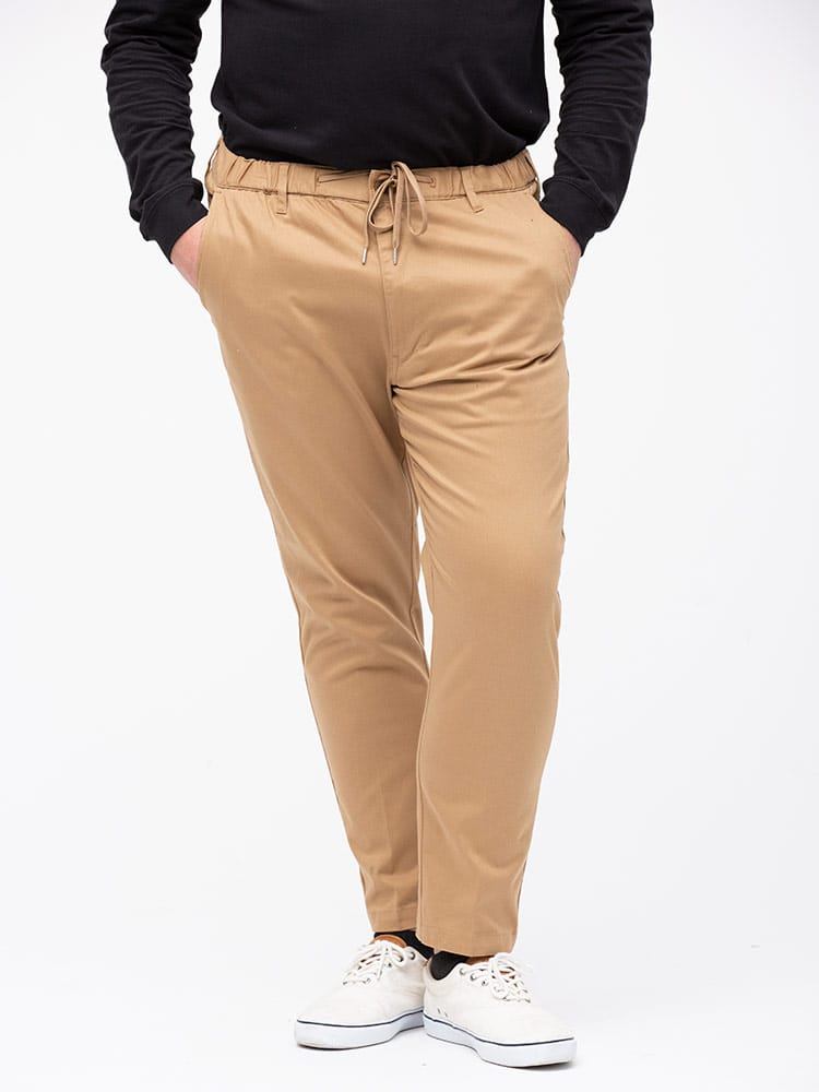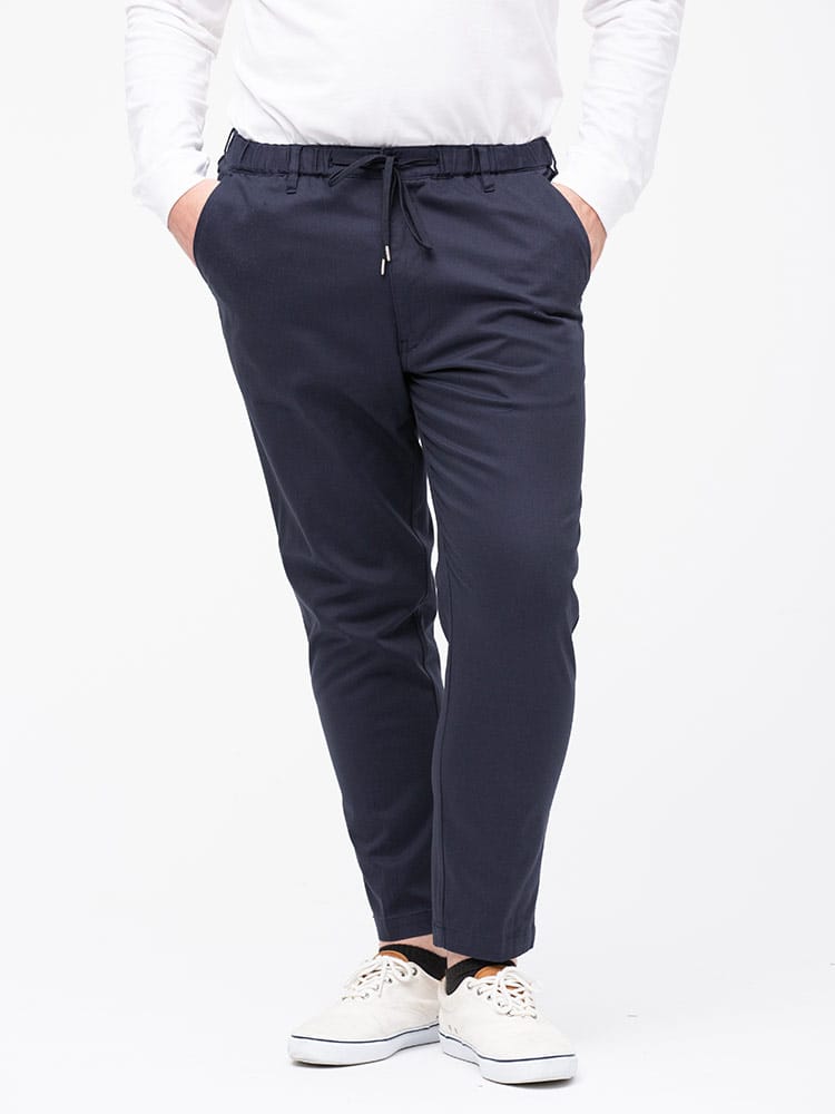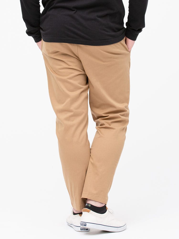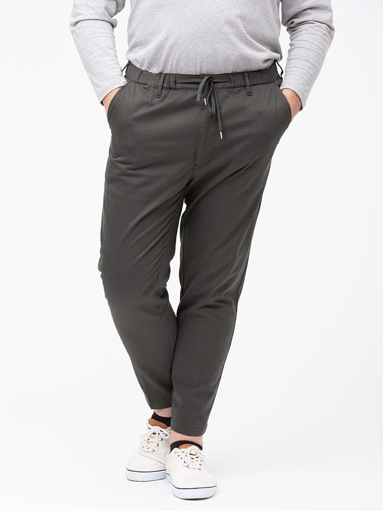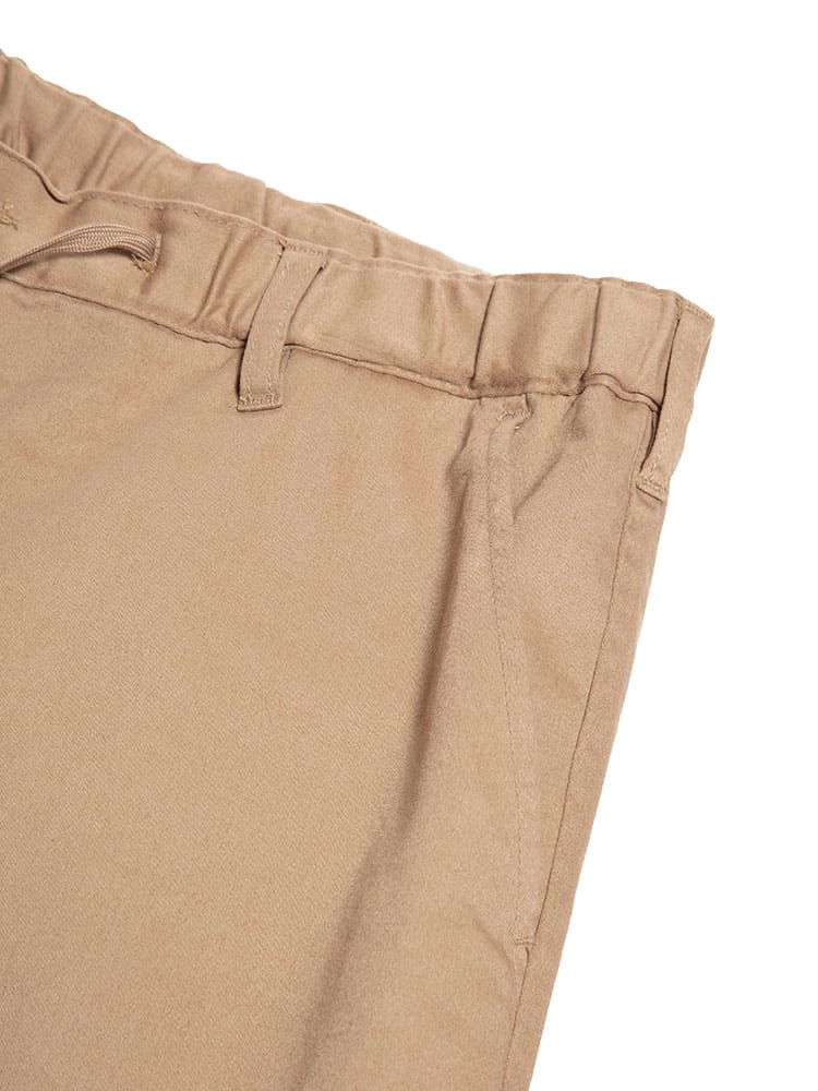 シンプルなデザインのストレッチコットン 無地 ウエストコード イージーパンツ。ウエストはゴムとドローコード付きで調整が可能。伸びる生地を配合しているので、動きやすく、デイリーユースで活躍する使い勝手の良い一本。