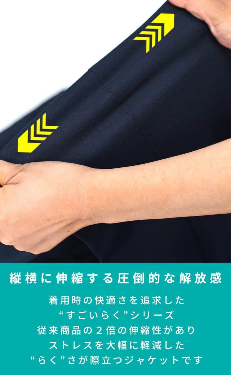 従来の商品より2倍伸びるすごいらくストレッチシングル 2つ釦 ニットジャケットです。上品なデザインで幅広いパンツと相性抜群でスラックスと合わせたジャケパンスタイルにもおすすめです。