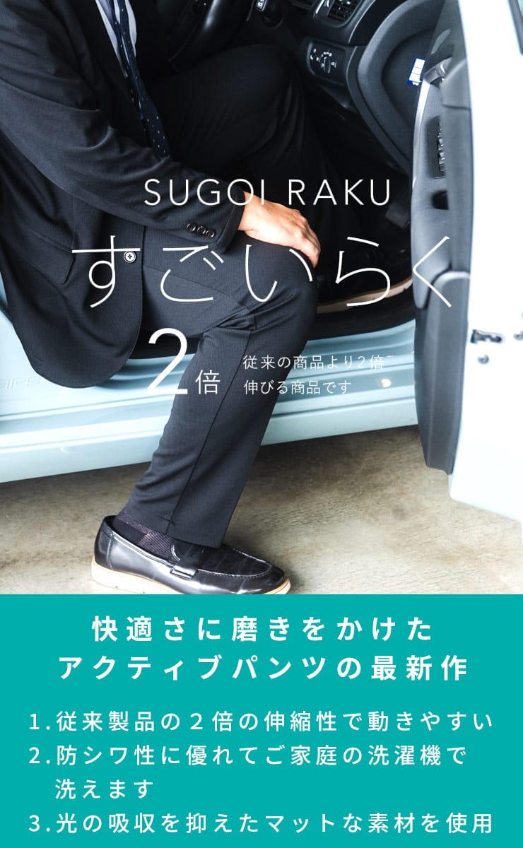 従来の商品より2倍伸びる「すごいらくシリーズ」すごいらくサイドゴム ノータックニットパンツは、快適さとスタイルを両立させた究極のボトムウェアです。このパンツは、ストレッチ素材が使用されており、どんな動きにもフレキシブルに対応。ウエスト部分にはサイドゴムとドローコードにより緩和機能が備わっており、長時間の着用でも締め付け感を感じずに過ごせます。ストレスフリーな着心地は、ビジネスシーンから普段使いまで幅広いシーンで活躍します。