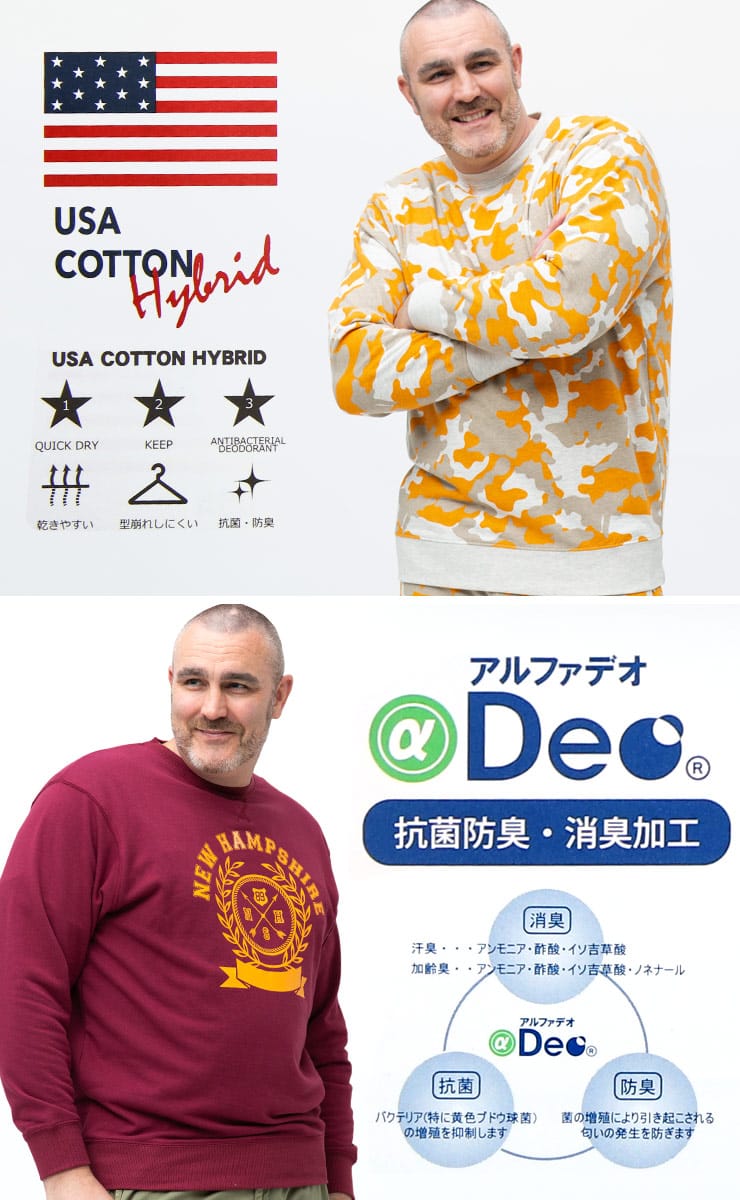 USAコットンを使用した柄&無地クルーネックトレーナー。通常の綿100%商品に比べ上質なアメリカ産のコットンを使用しているため、型崩れしにくく、乾きやすい素材です。アルファデオ加工テープを使用しており、抗菌防臭・消臭効果を発揮。首回りはベーシックなクルーネック。衿、裾部分はリブ仕様。裏地はサラッとした肌触りの裏毛使用。スタンダードなシルエットで普段のコーディネートに取り入れやすいアイテムです。
