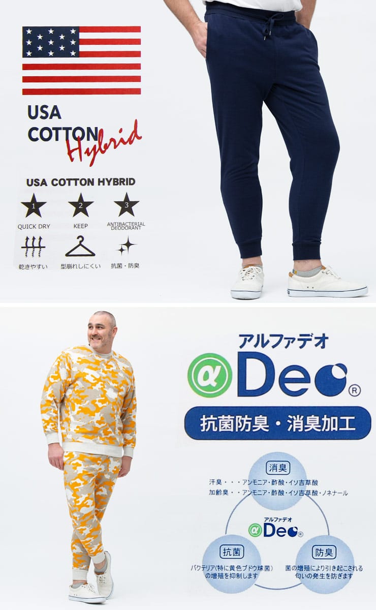 USAコットンを使用した迷彩&無地スウェットロングパンツ。通常の綿100%商品に比べ上質なアメリカ産のコットンを使用しているため、型崩れしにくく、乾きやすい素材です。アルファデオ加工テープを使用しており、抗菌防臭・消臭効果を発揮。ウエスト部分はゴムとドローコード付きでゆったりと着用可能。裾はリブ仕様。ルームウェアとしても気軽に履ける一枚。