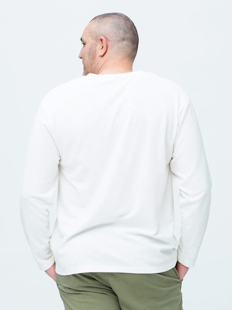 凹凸のあるリップボーダーで仕上げたVネック 長袖 Tシャツです。ベーシックなカラーにリップボーダーがポイントです。首元はスッキリとしたVネックデザイン。シンプルデザインで大人のカジュアルスタイルにおすすめの一枚です。