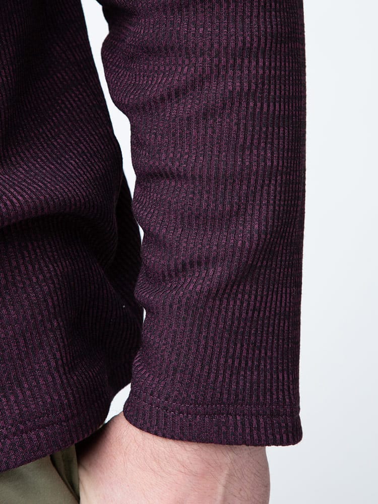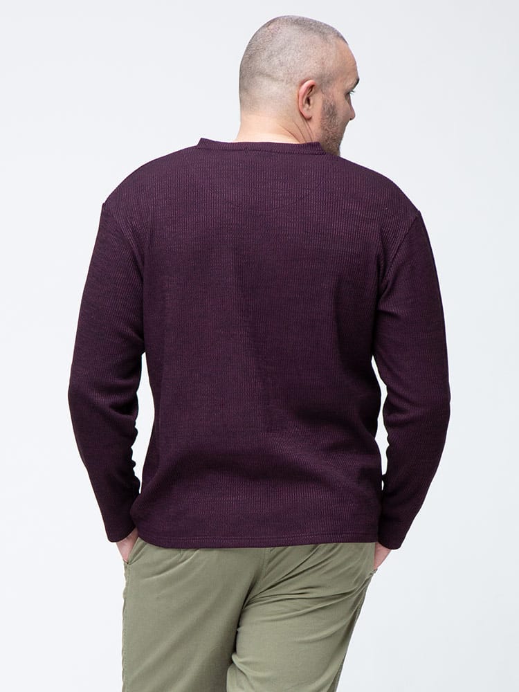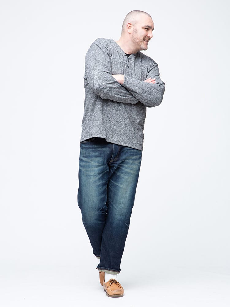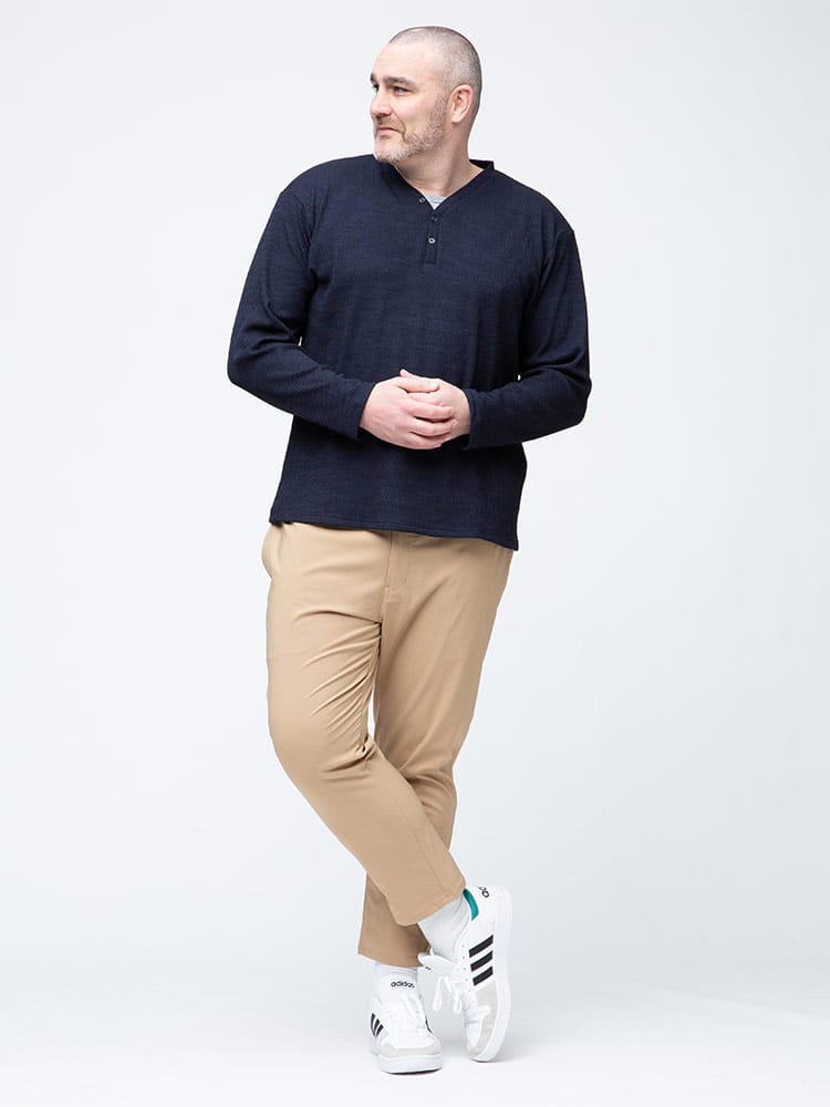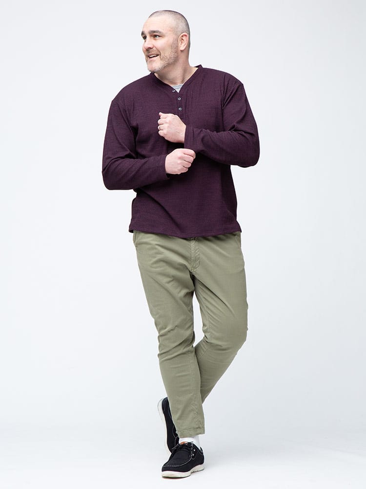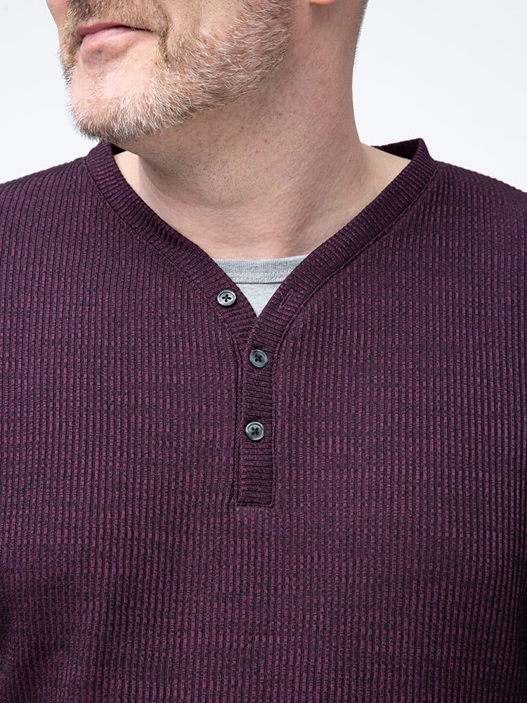 リブニットで仕上げたフェイクレイヤード ヘンリーネック 長袖 Tシャツです。首元はフェイクレイヤードのヘンリネックでアクセントをプラス。フェイクレイヤードデザインでお手軽にレイヤードスタイルをお楽しみいただけます。ベーシックなカラーリングで幅広いアイテムとマッチします。