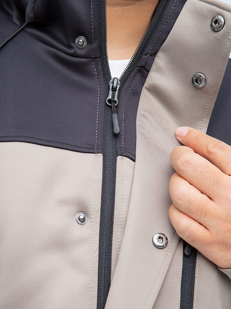 ポンチ生地に切り替えデザインがお洒落なフード フルジップ マウンテンパーカーです。ストレッチ性やハリ感のあるポンチ生地がポイントです。フロントはボタンジップで開閉出来ます。カジュアルで幅広いスタイルに合わせていただけます。