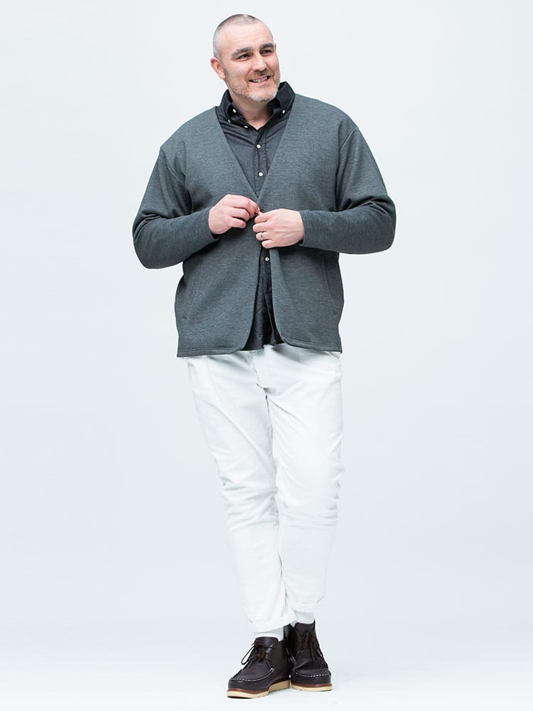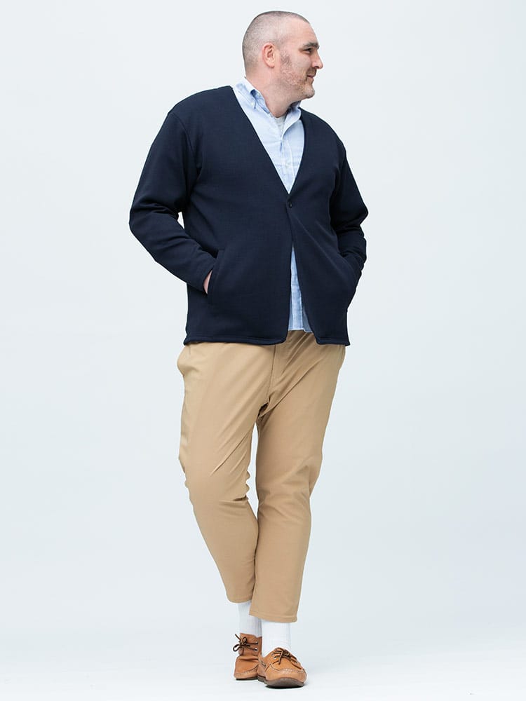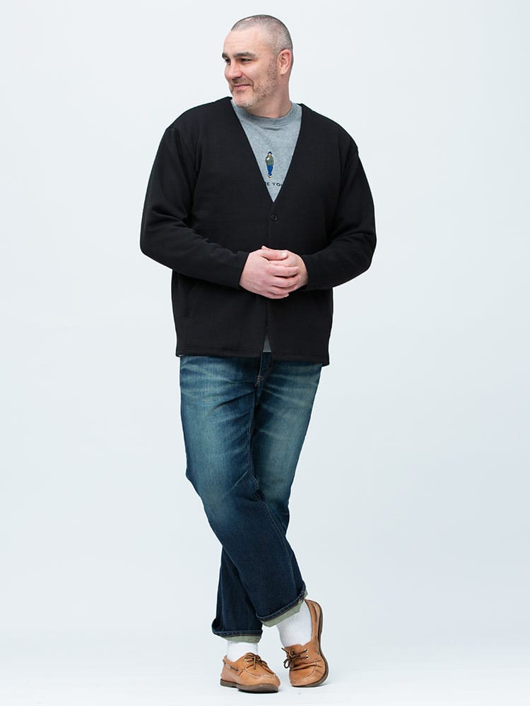 ライトダンボール生地で仕上げた一ツ釦 リラックス カーディガンです。軽量性のあるライトダンボール生地で着心地抜群のアイテム。一つ釦デザインでシンプルなデザイン。ベーシックな無地デザインで大人のカジュアルスタイルにおすすめのアイテム