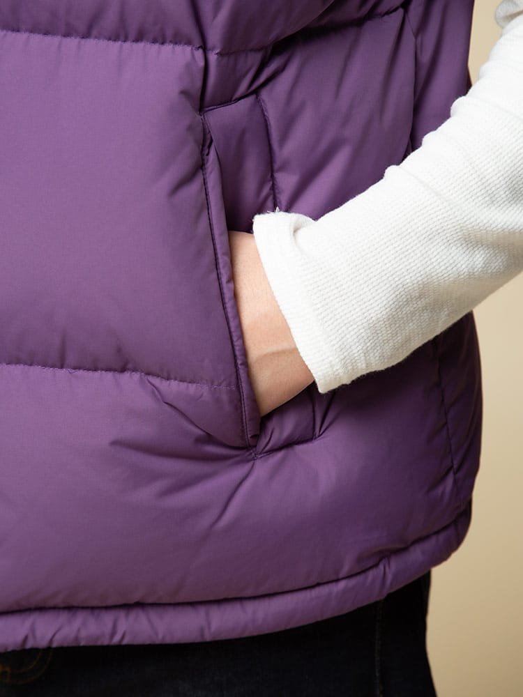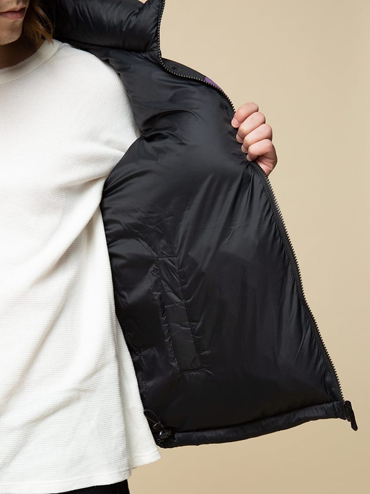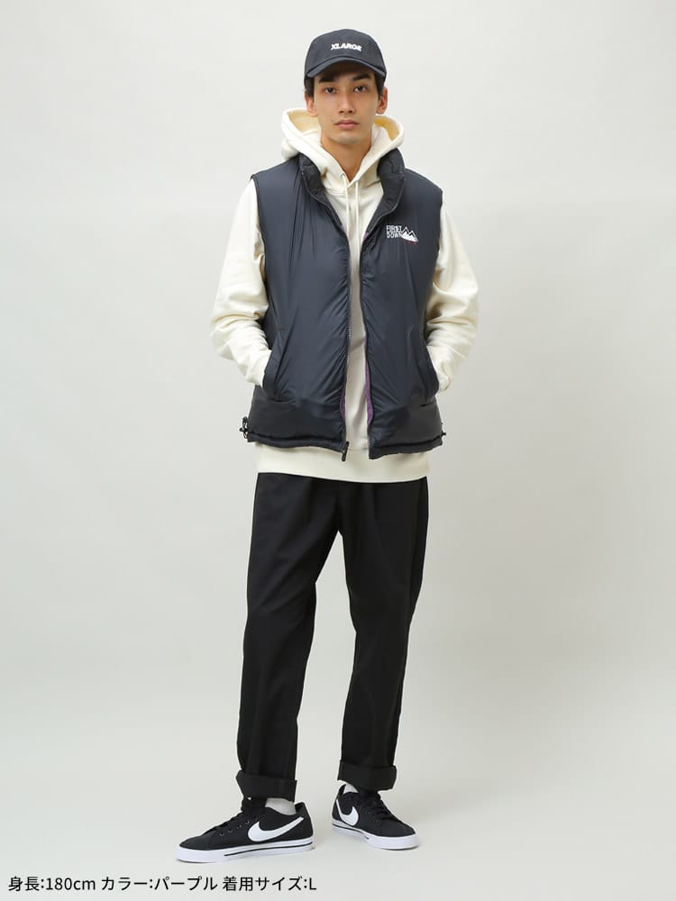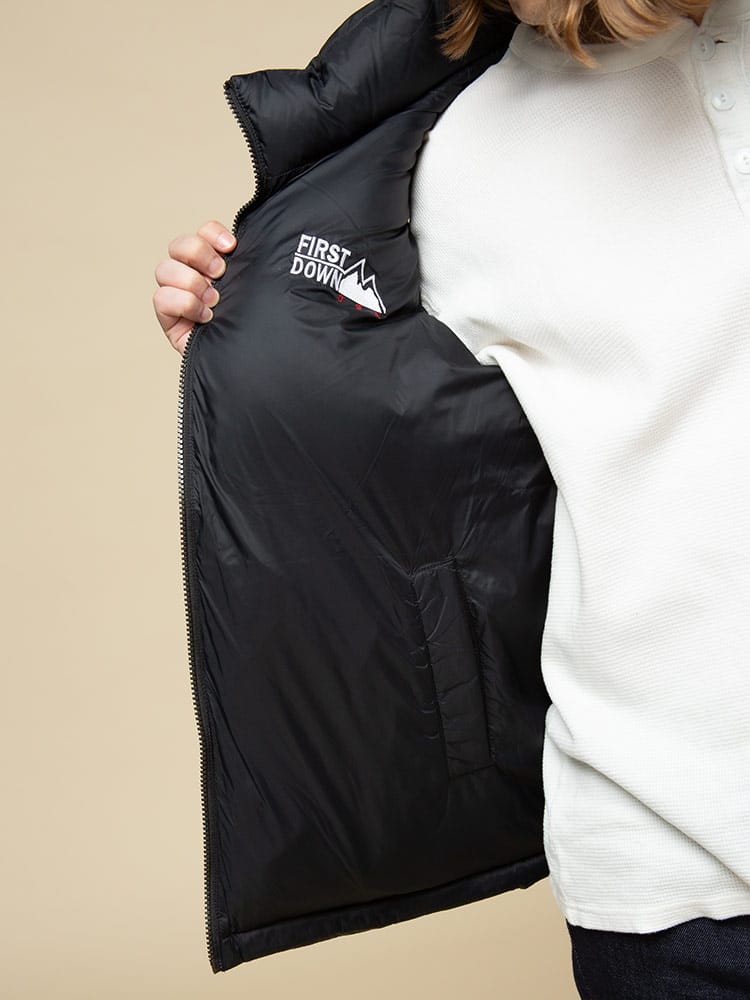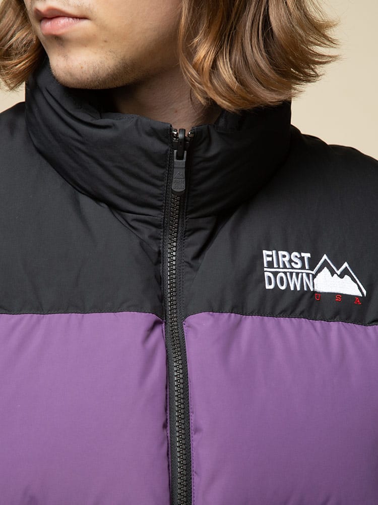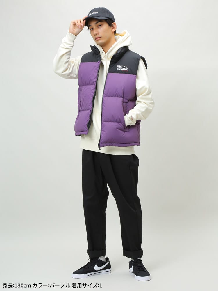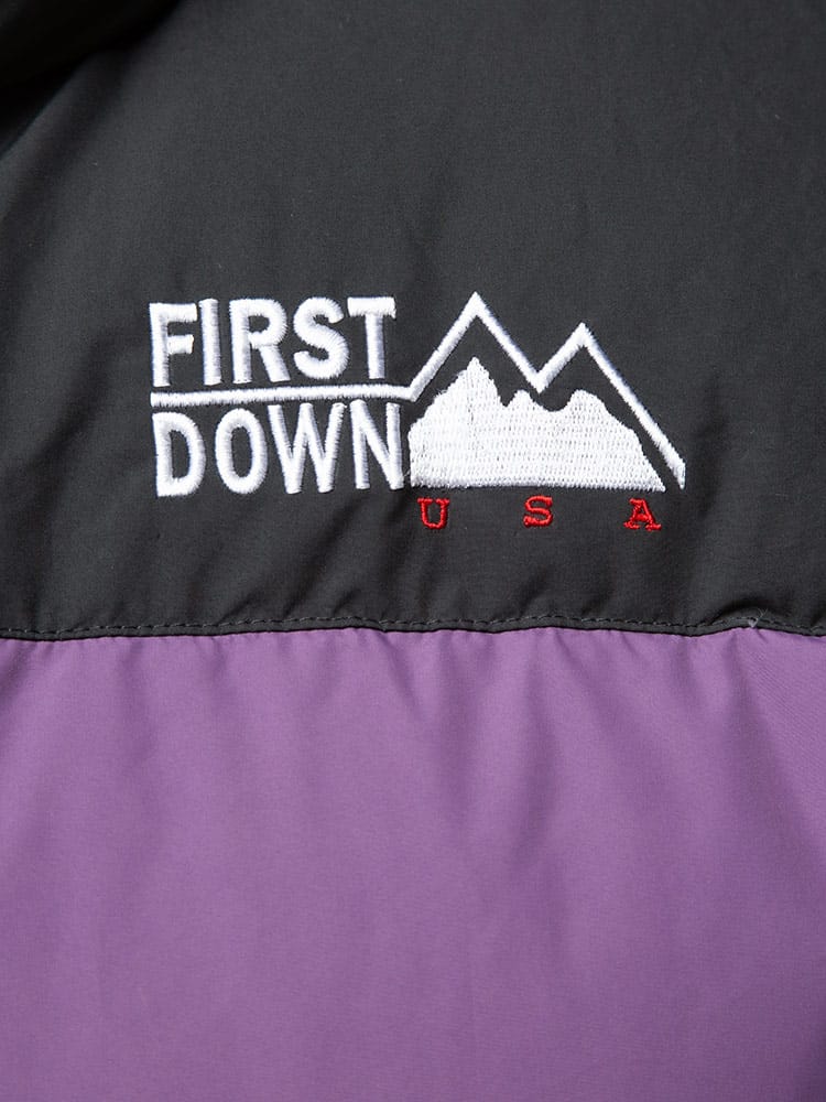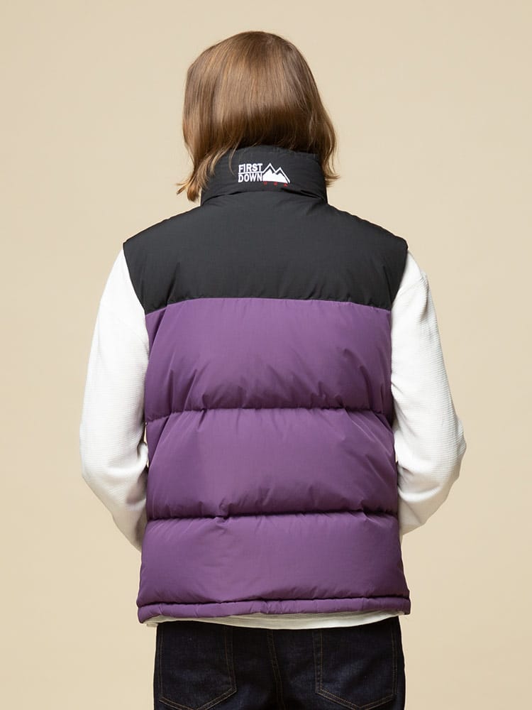 リバーシブルでお使いいただけるFIRST DOWN USAのフルジップ ダウンベスト BUBBLE DOWN VEST。クラシカルなボックス型のシルエットに、すっきりとしたスタンドカラーを組み合わせた「バブルジャケット」のファーストダウンを代表する定番モデルのベスト版。左胸とバックネックのロゴ刺繍がポイント。高密度で織り上げ、はっ水性を持たせて光沢を抑えた帝人製のポリエステル地を表側のシェルに採用した、軽量かつ機能的な仕上がりです。反対の面には20デニールの糸を使った高密度ナイロンを使っていて、こちらを表側にしても着られるリバーシブル仕様。豊富なカラーバリエーションと、700フィルパワーの高品質ダウンによる高い保温性が特徴です。裾にはサイズ調整出来るドローコード付き。