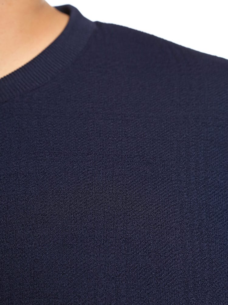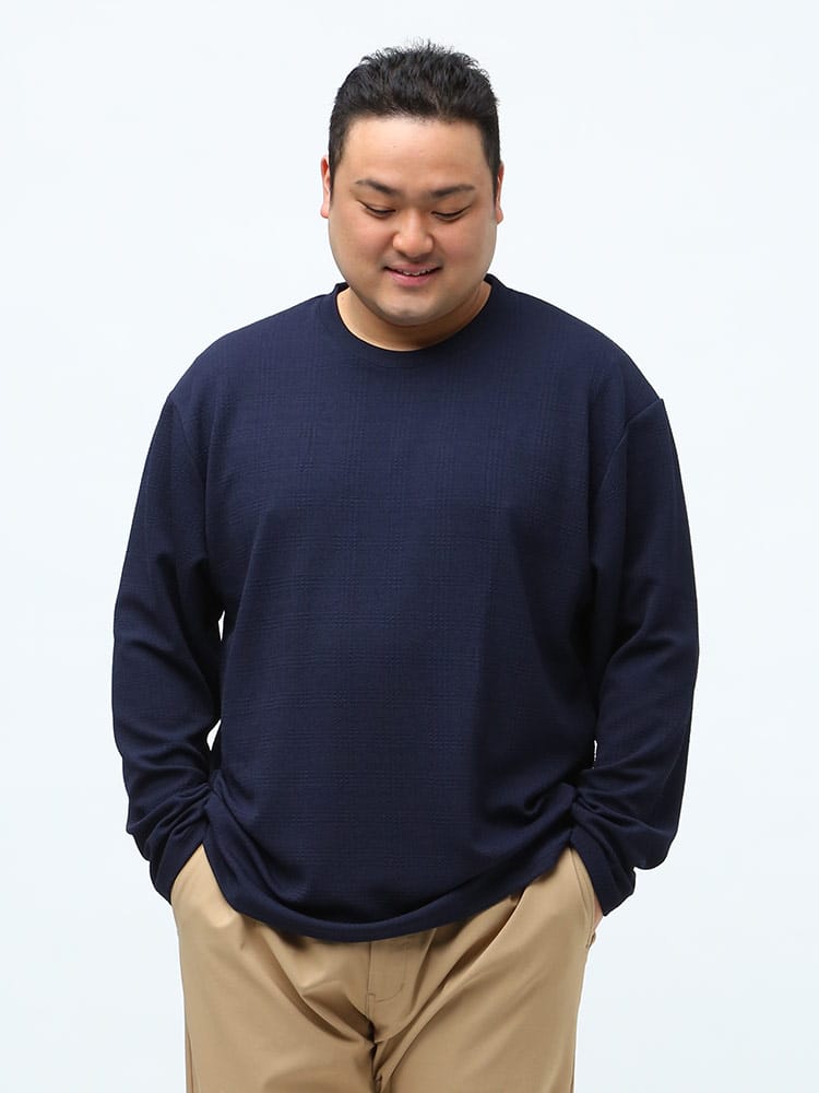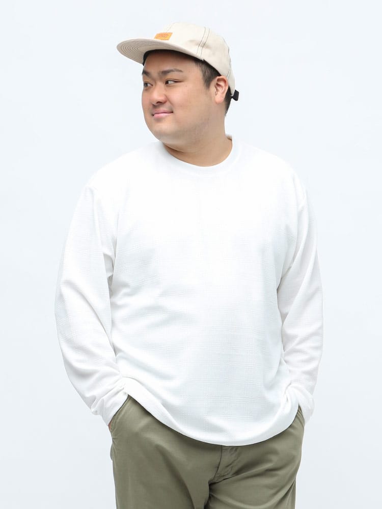 ジャガード織のチェック柄が雰囲気のあるクルーネック 長袖 Tシャツです。ベーシックなカラーで着回し抜群のアイテム。首元はシンプルなクルーネックデザイン。カジュアルながらも品のあるデザインで大人のカジュアルスタイルにおすすめです。