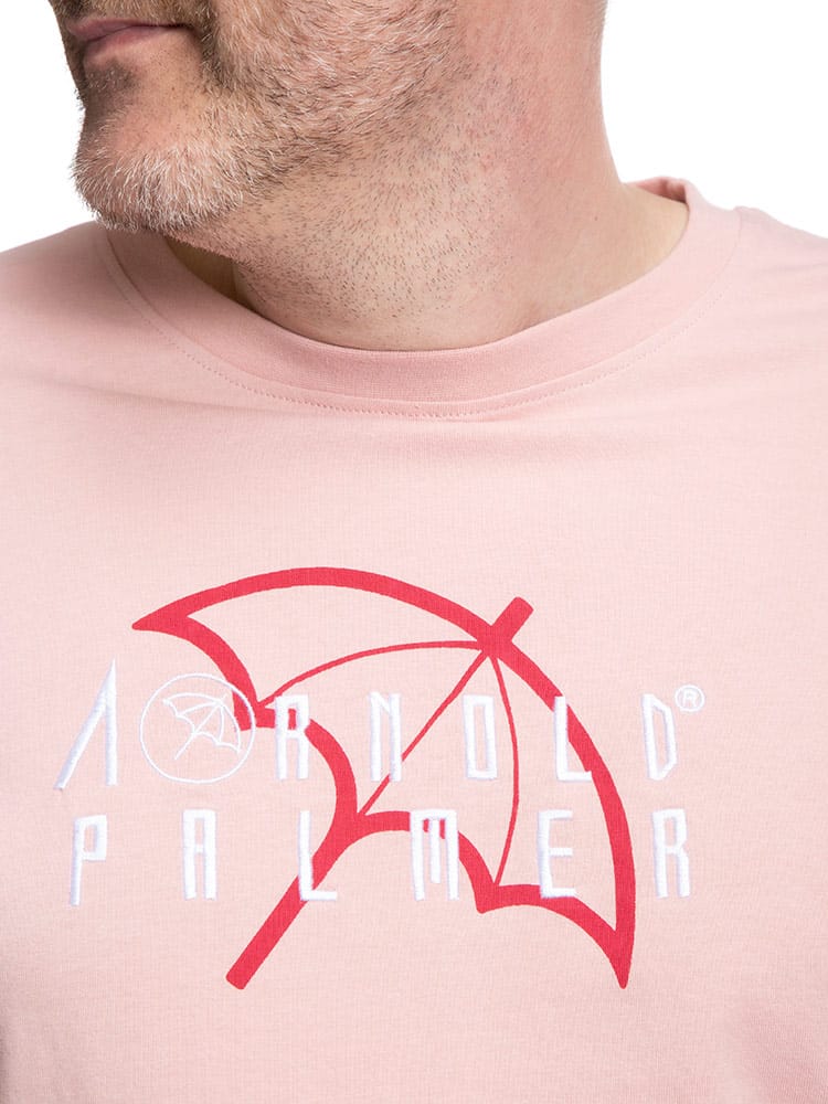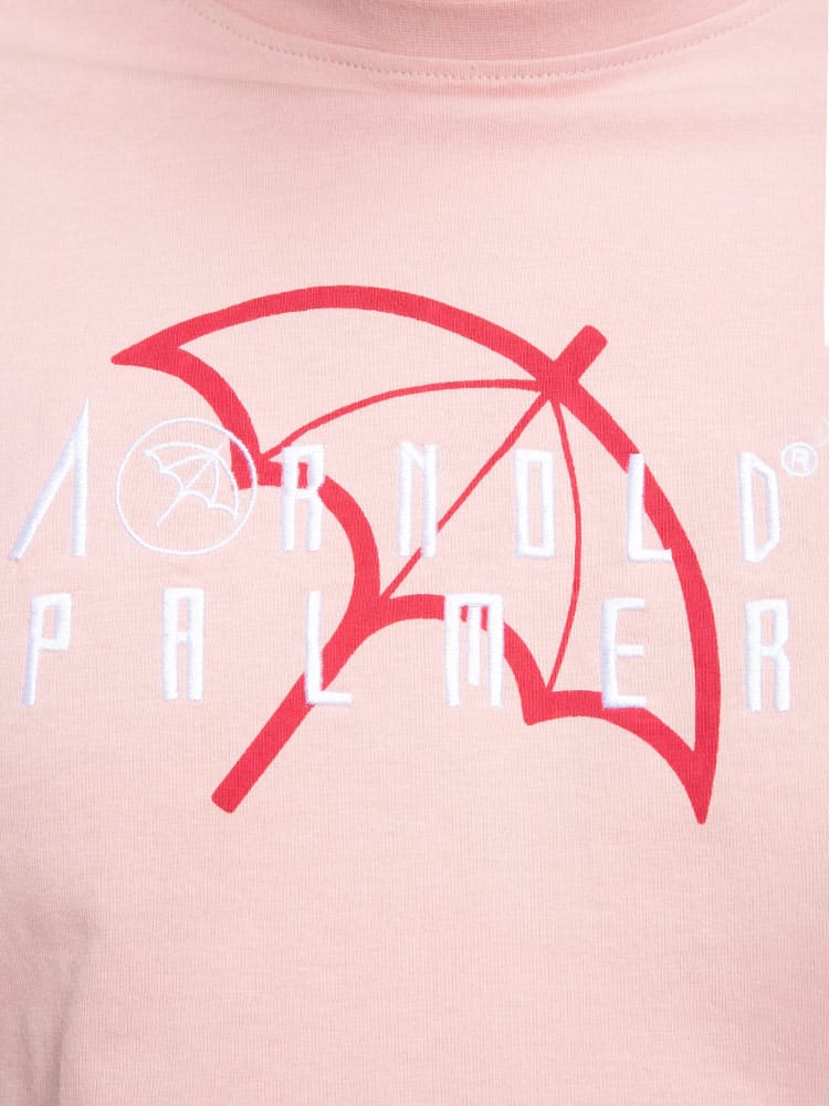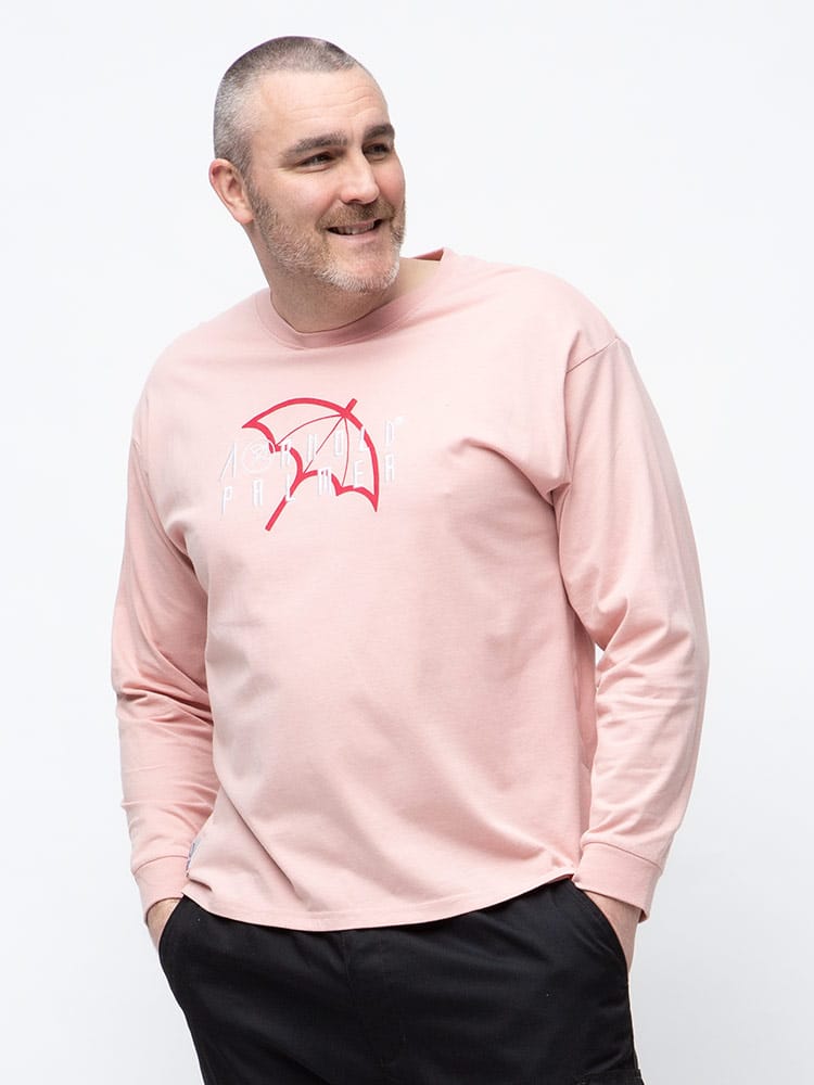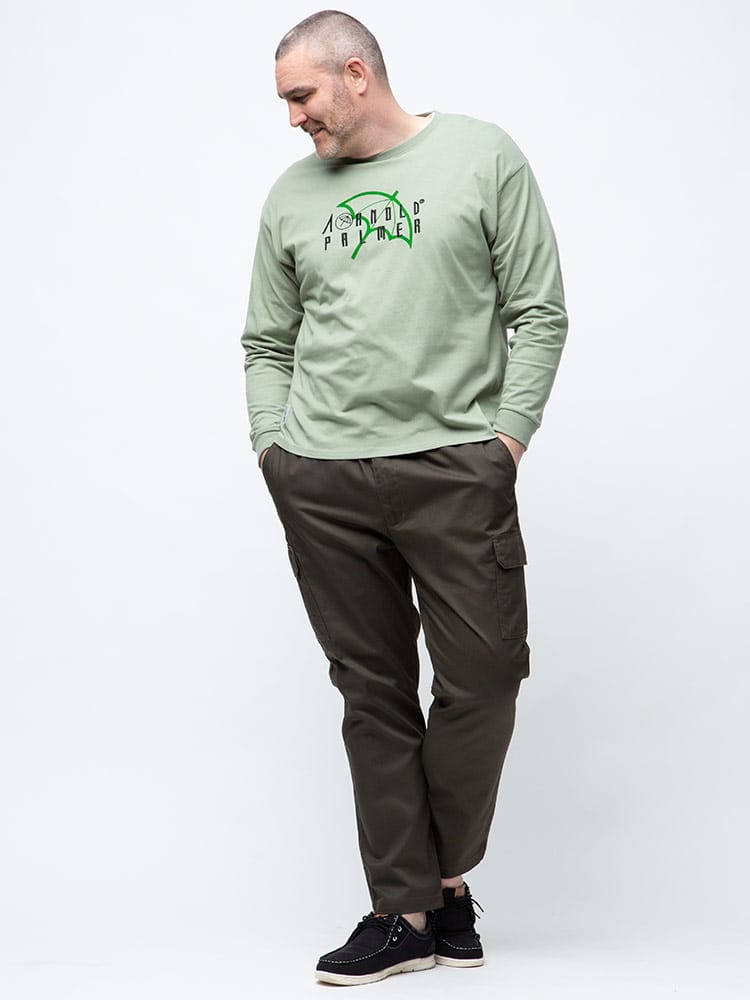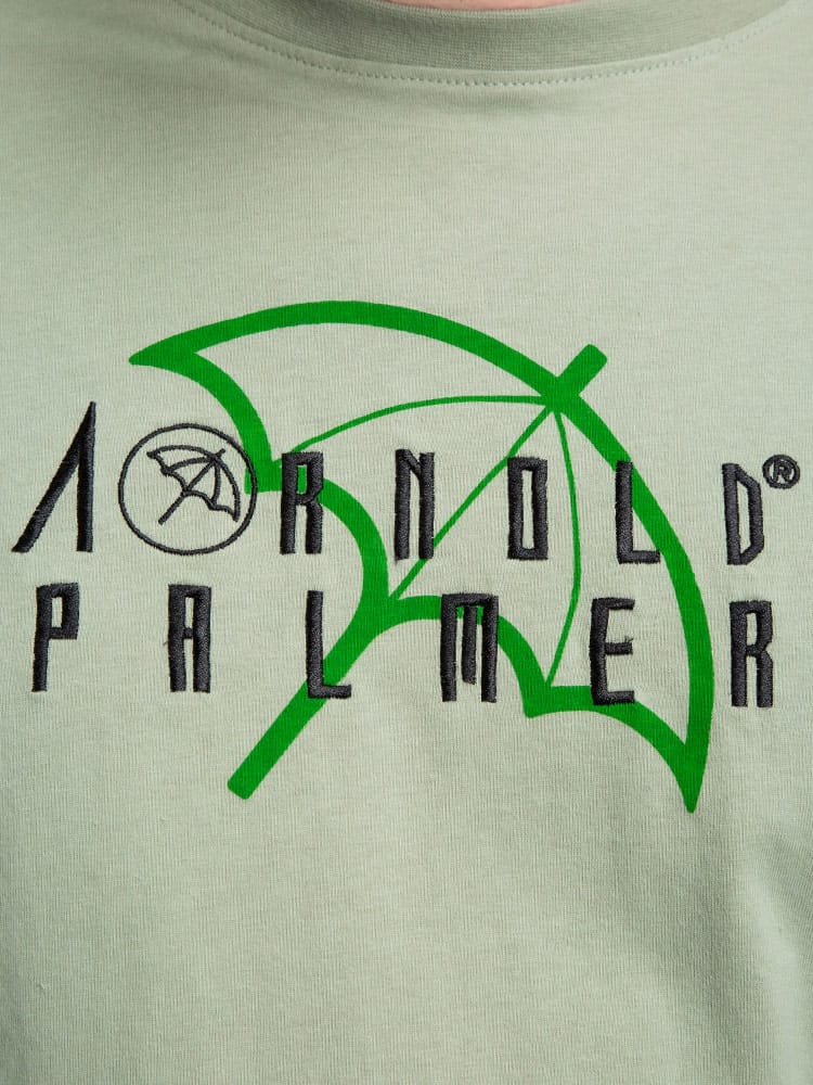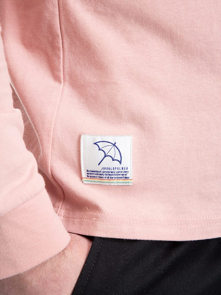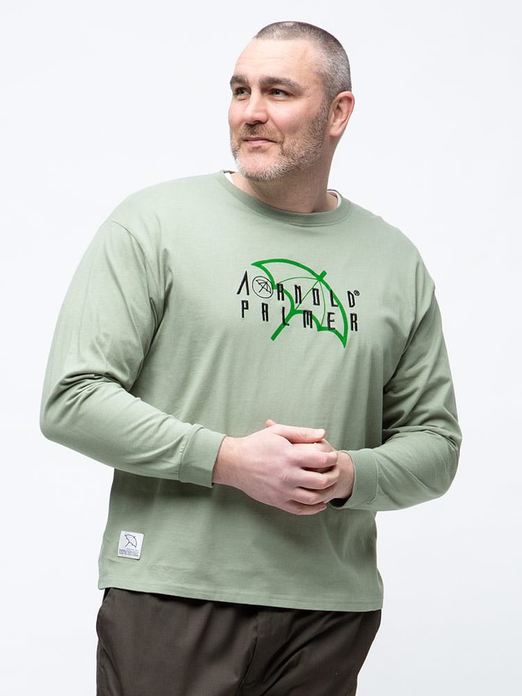 抗菌防臭効果のあるテープを使用したArnold Palmerの天竺 刺繍×プリント クルーネック 長袖 Tシャツ。フロントにロゴプリントと刺繍がポイント。首元はベーシックなクルーネックデザイン。右裾にブランドタグ付き。抗菌防臭、消臭効果のあるアルファデオテープを使用。肌触りの良いコットン生地を使用しています。
