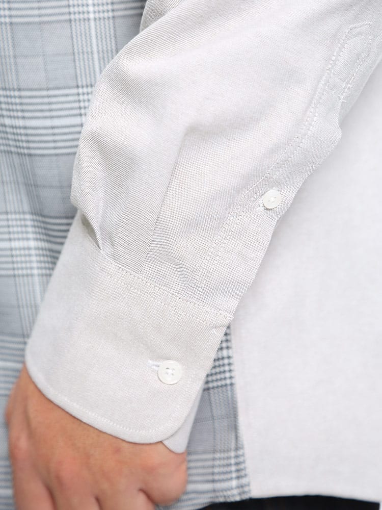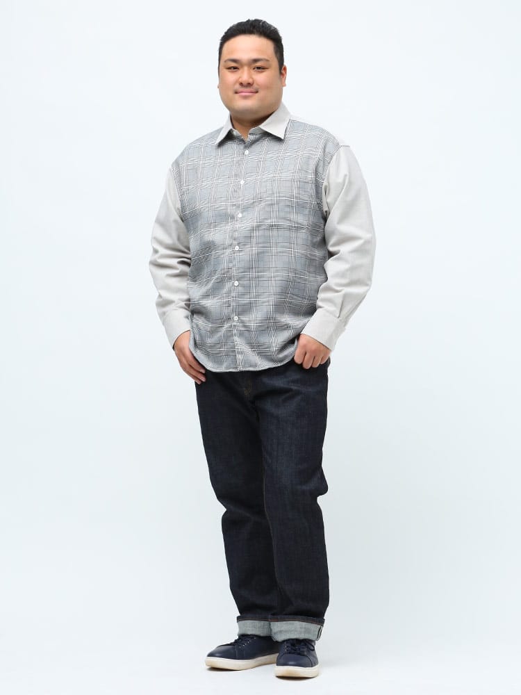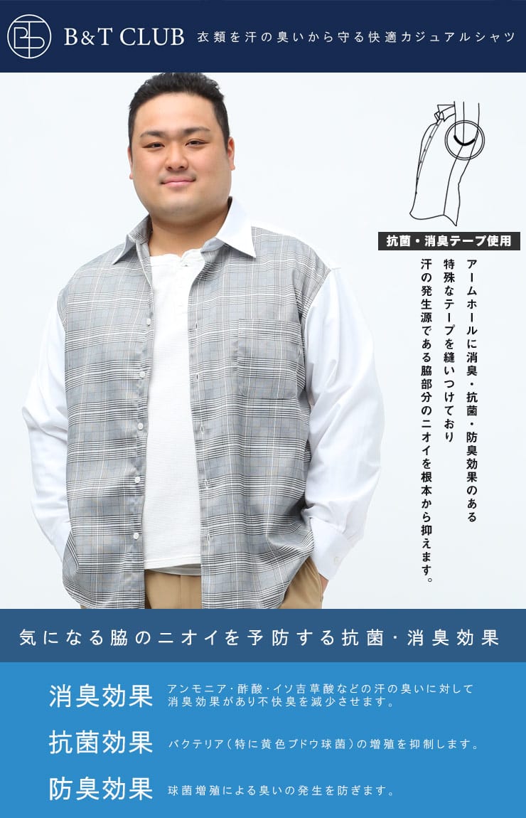 フロントのチェック切り替えデザインがお洒落な長袖 シャツです。襟はベーシックなレギュラーカラー。フロント左胸にポケット付き。脇下に備えた抗菌消臭テープで【消臭】【抗菌】【防臭】の3つの効果を発揮してくれます。外出の際の汗の臭いを抑えて、人込みでの周囲への気遣いによるストレスを軽減してくれます。大人のカジュアルスタイルにおすすめの1枚です。