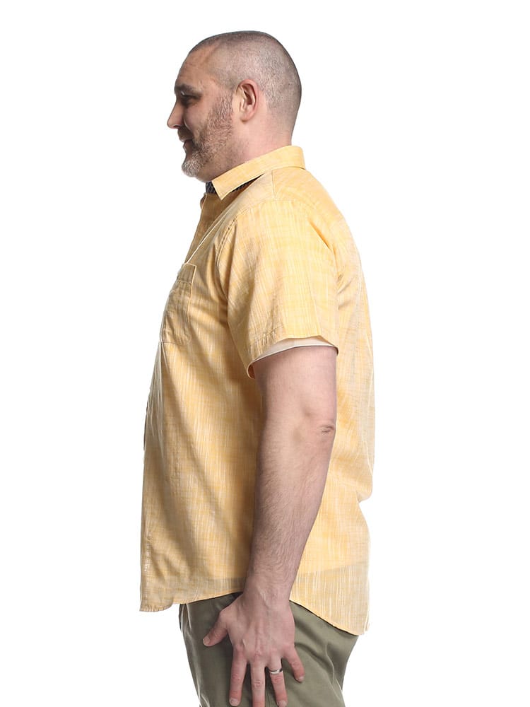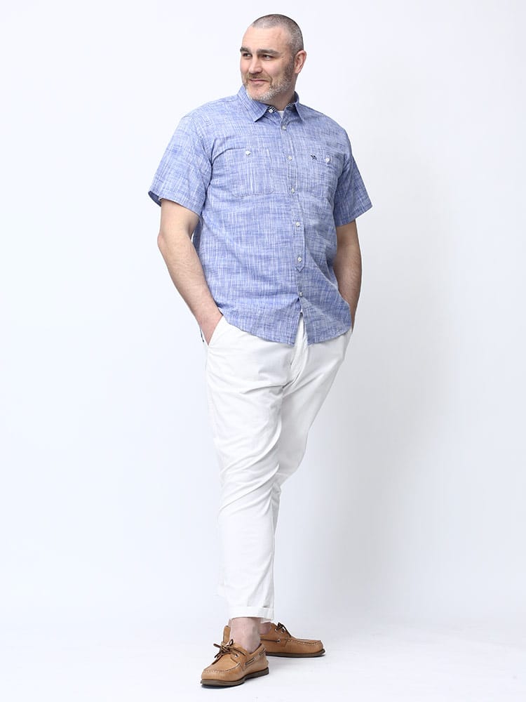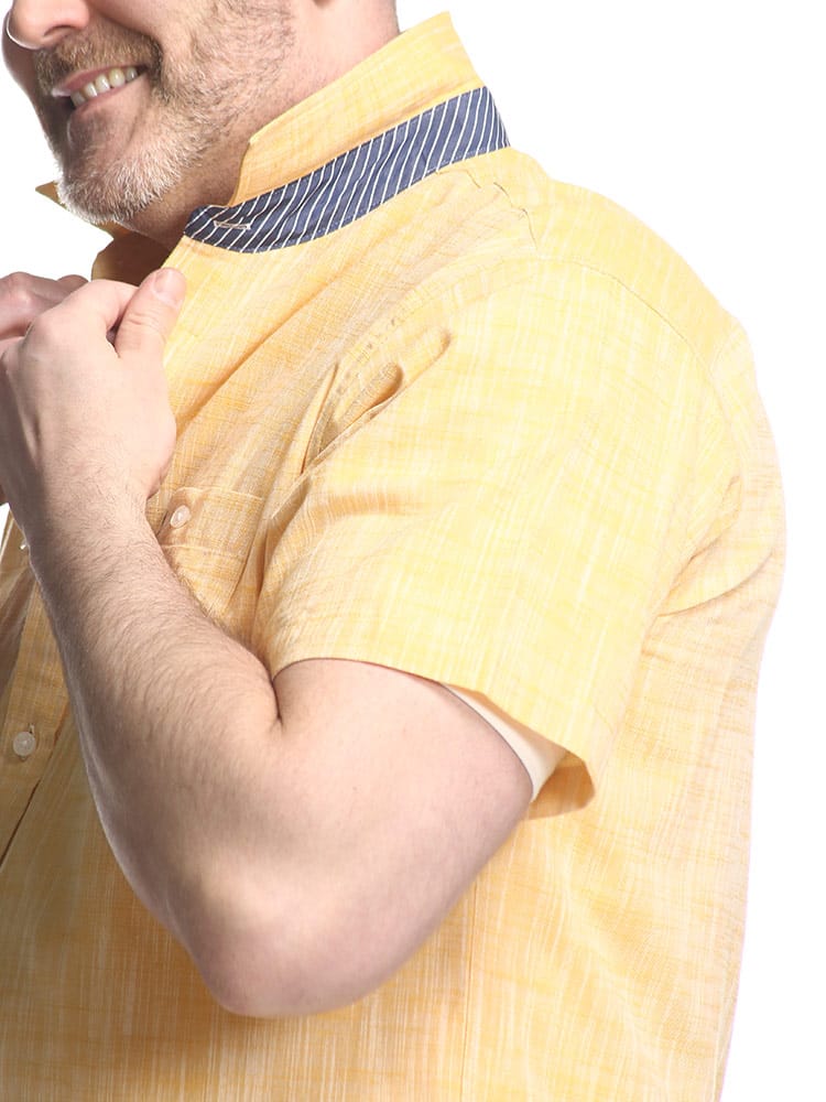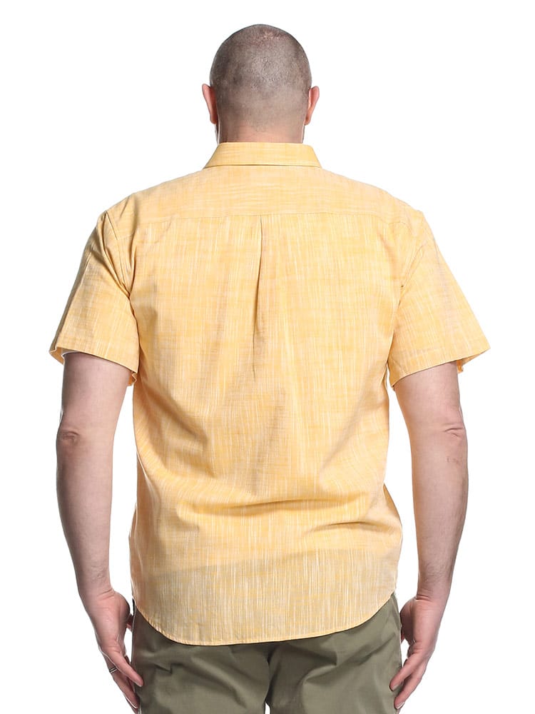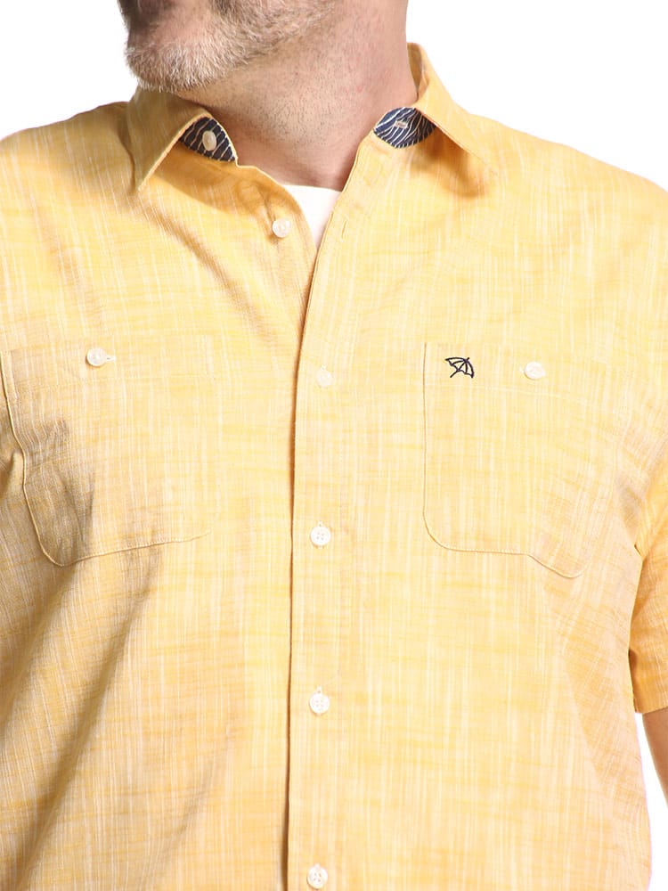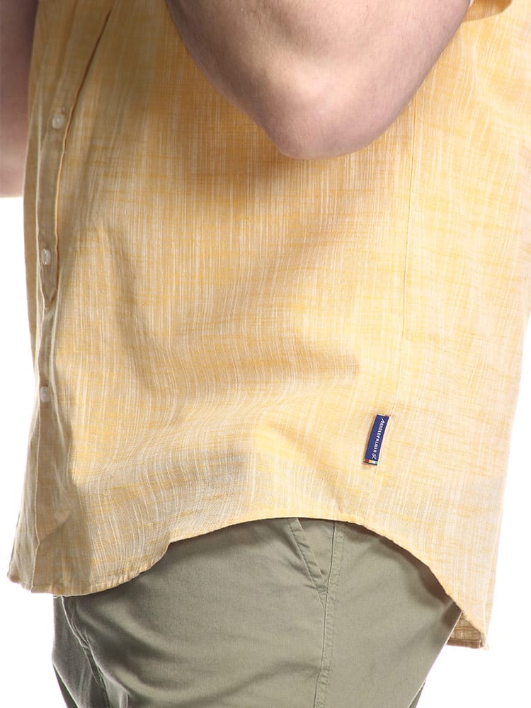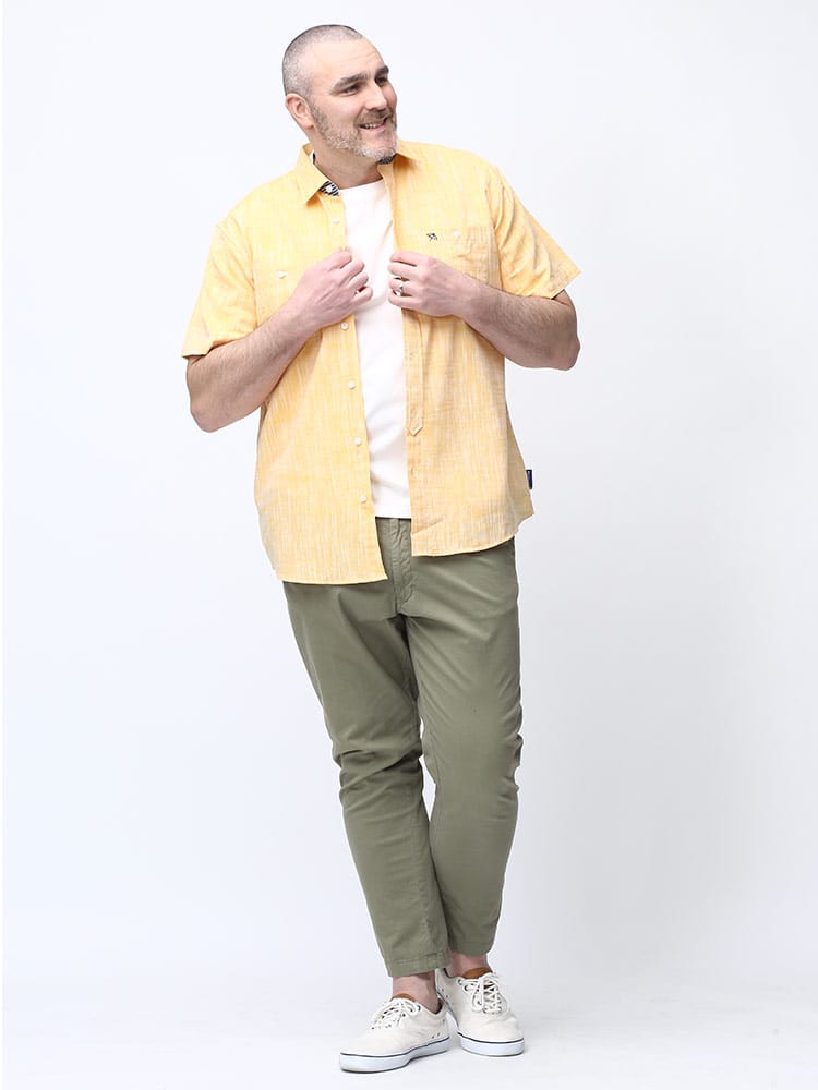 ArnoldPalmerのスラブ シャンブレー レギュラーカラー 半袖 シャツ。左胸ポケットにブランドロゴを刺繍。衿裏のさりげないデザインもポイントです。肌触りの良いコットン生地を使用。左裾にブランドタグ付き。ベーシックなデザインで、大人のカジュアルスタイルにおすすめのアイテム。