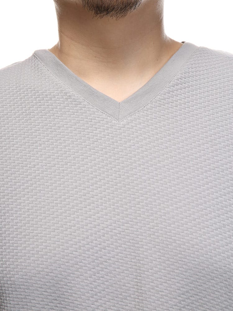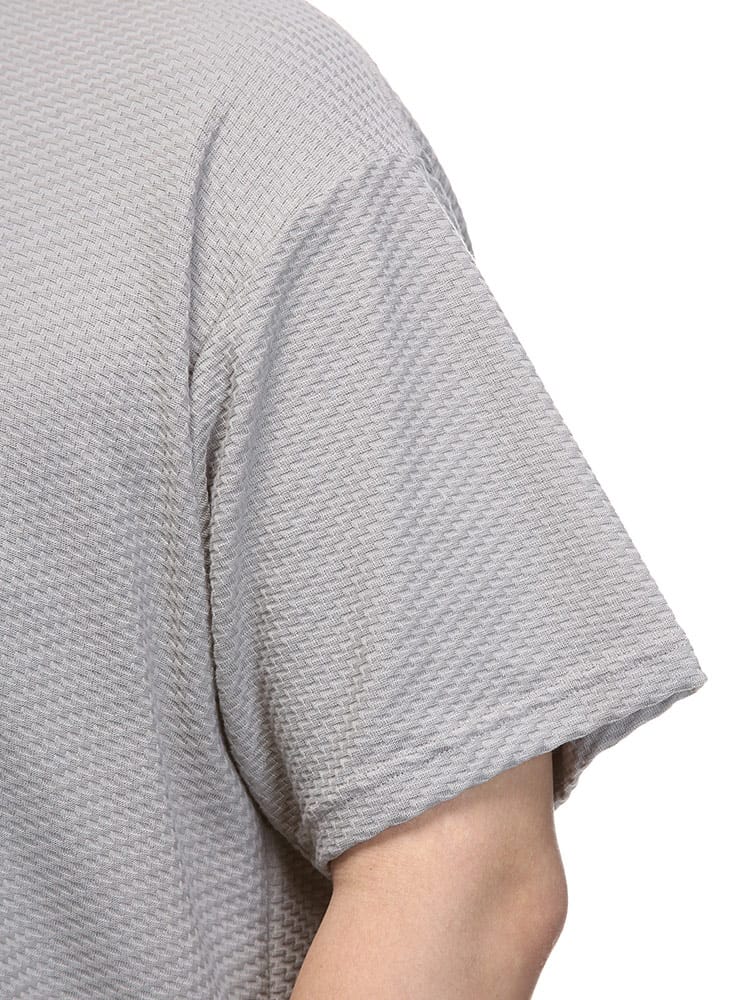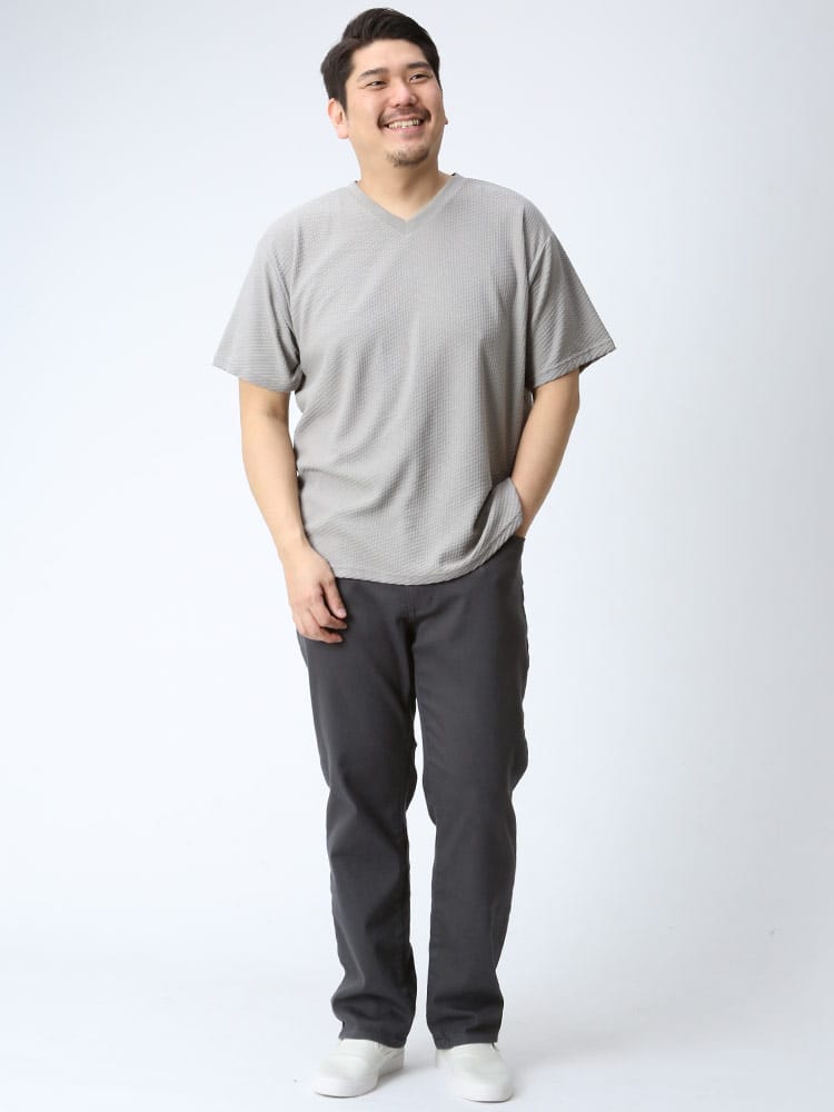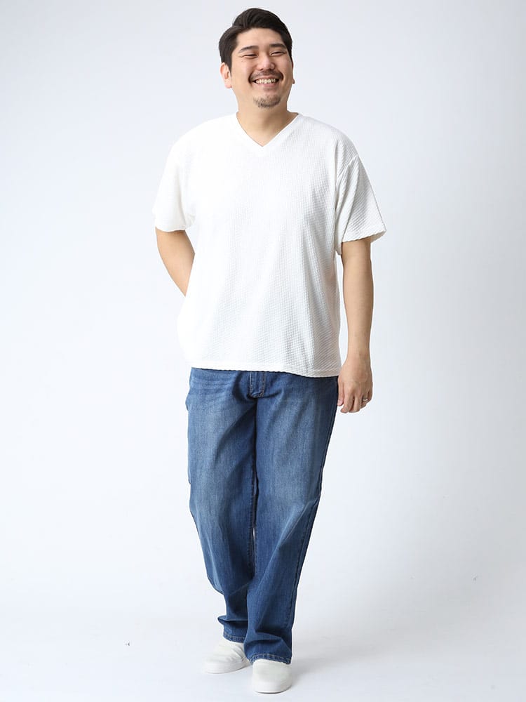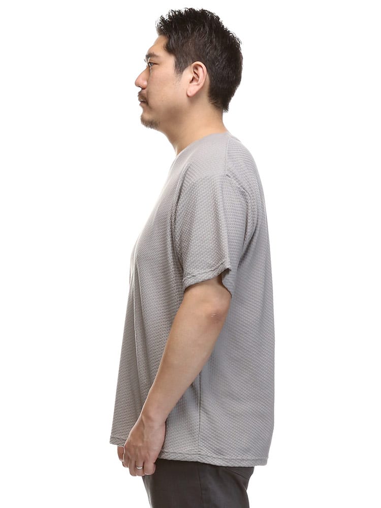 凸凹としたジャガード生地を使用したVネック 半袖 Tシャツです。首元はスッキリとしたVネックデザイン。生地にコットン配合生地を使用し、着心地の良さもポイントです。無地のシンプルデザインで大人のカジュアルスタイルにおすすめしたい一枚です。