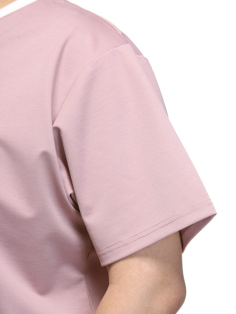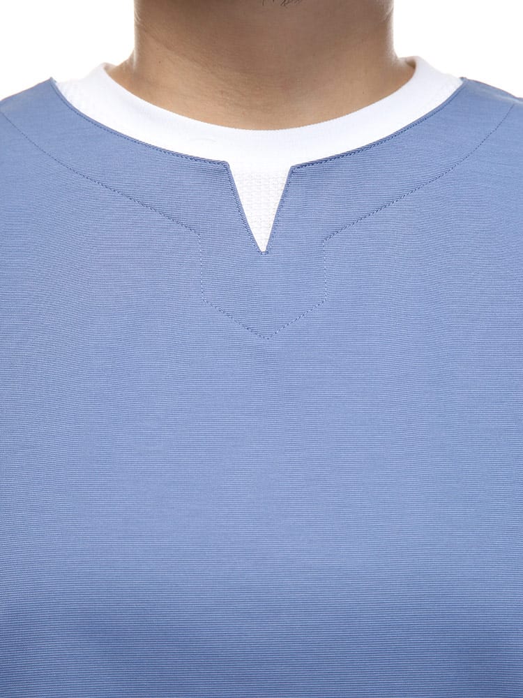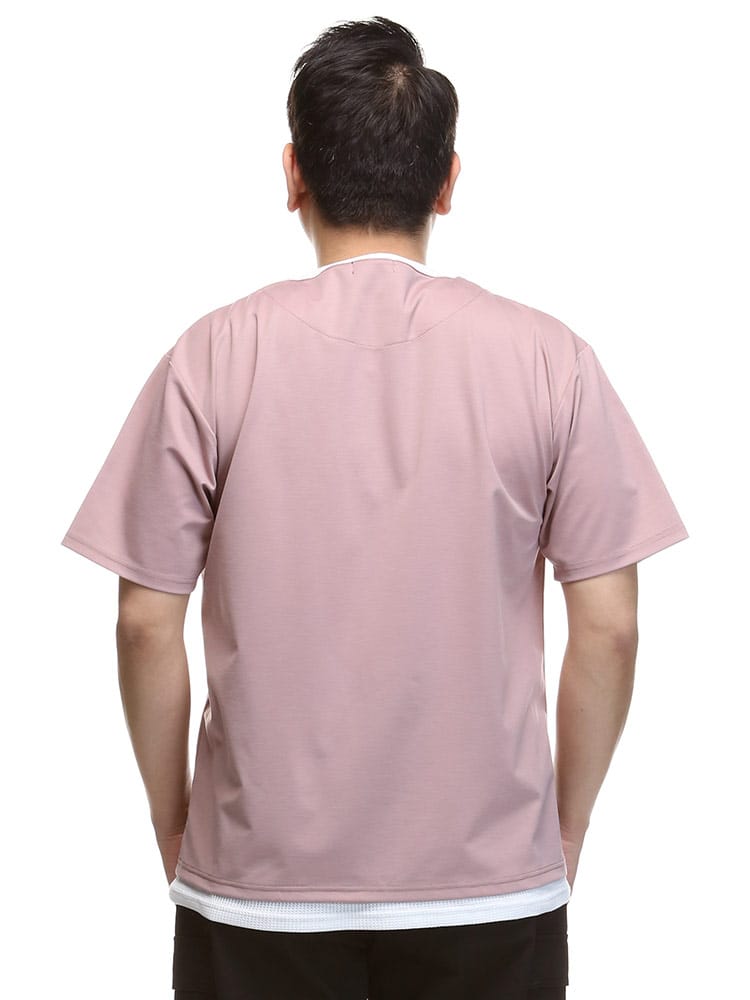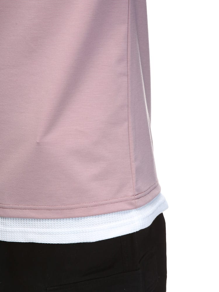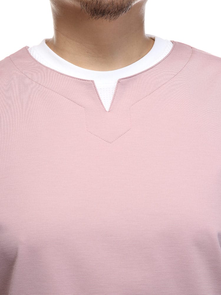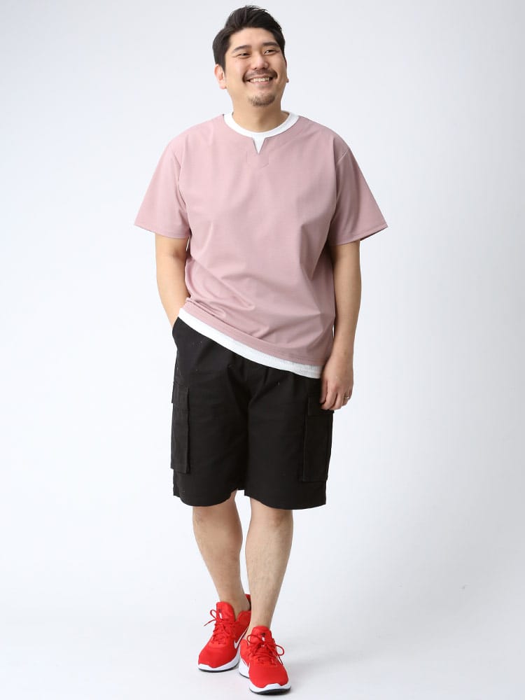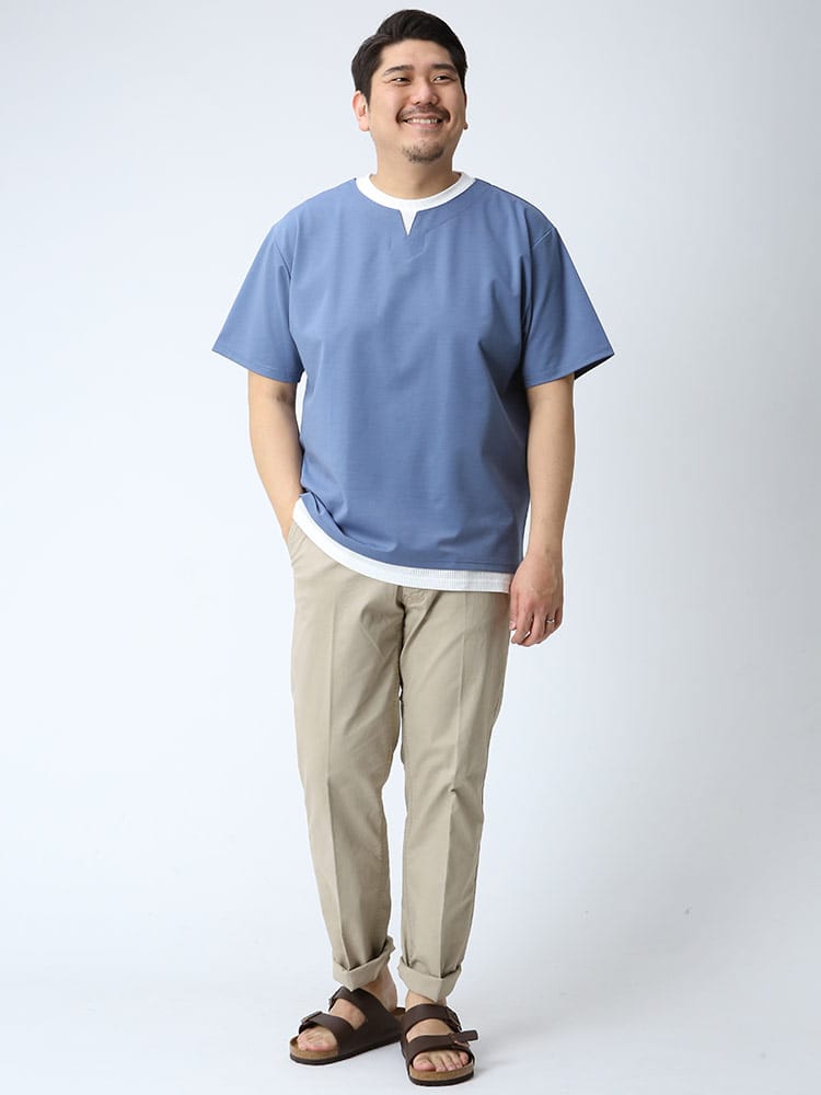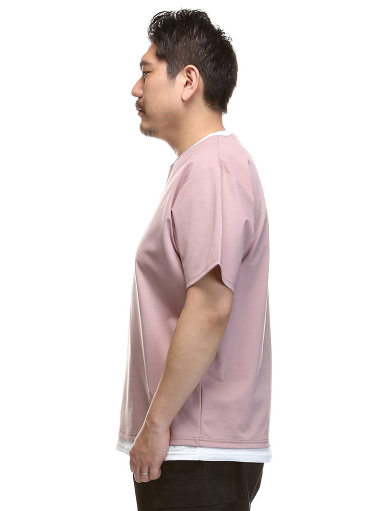ストレッチ性のあるグログランジャージー生地を使用したフェイクレイヤード キーネック 半袖 Tシャツです。首元と裾はフェイクレイヤードデザインでお手軽にレイヤードスタイルをお楽しみいただけます。カジュアルスタイルにマッチする一枚です。
