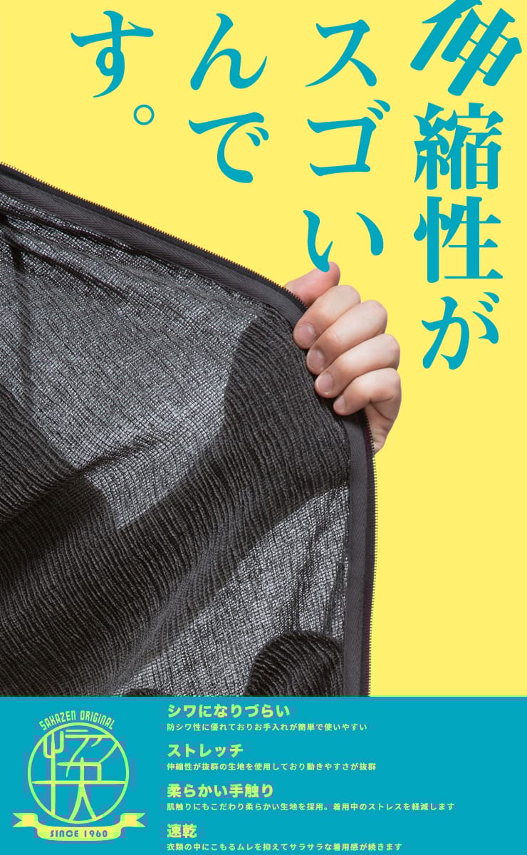 仕様 :外側ポケット数×2つ / シングルジップ / シワになりづらい / ストレッチ / 柔らかい手触り / 速乾