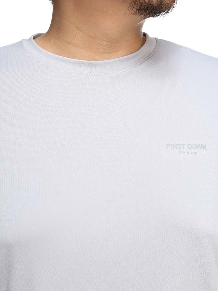 FIRST DOWN BASICのクルーネック 半袖 Tシャツです。超吸水・超速乾の超サラサラDRY。汗を吸い上げ素早く蒸発、サラサラとした快適な着心地のアイテム。首元はベーシックなクルーネックデザイン。UVカット、裏側ドライタッチ、軽量素材、リフレクタープリントとい快適機能満載。アクティブシーンにおすすめの一枚です。