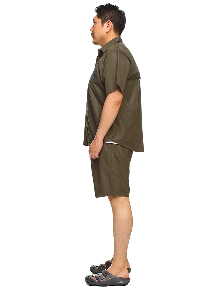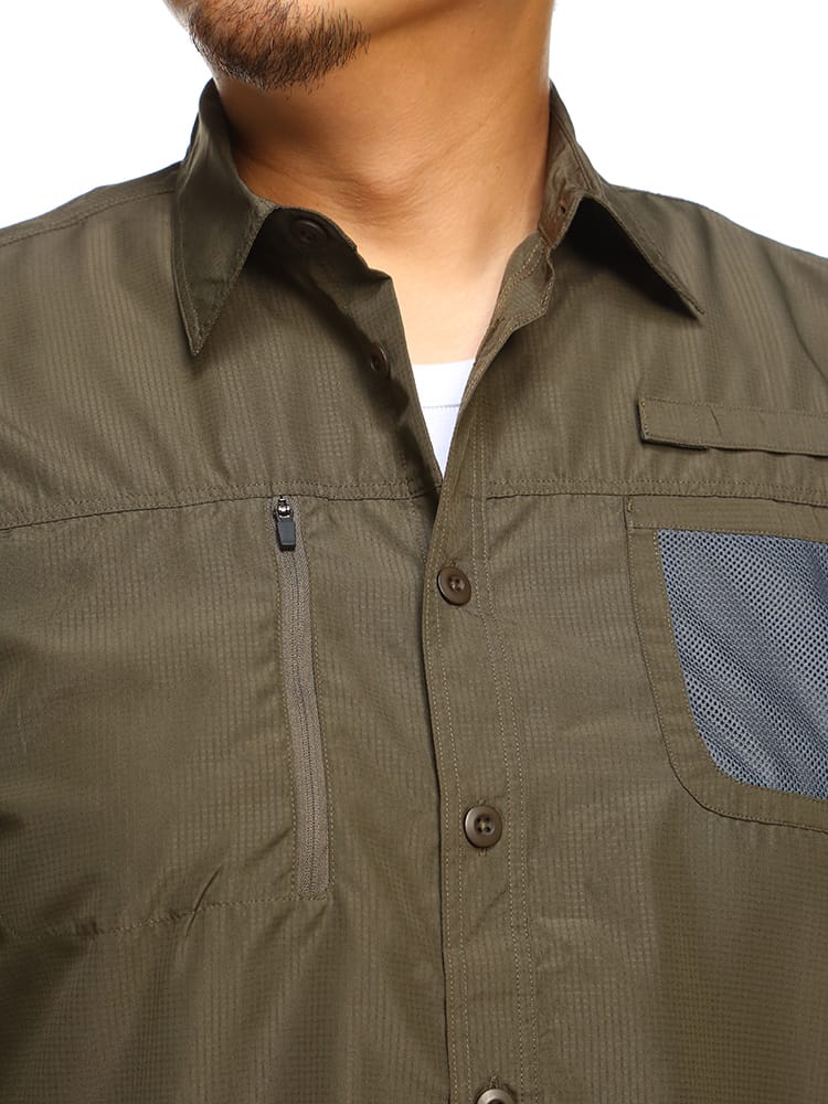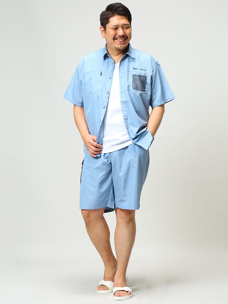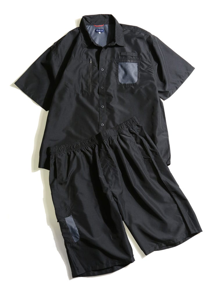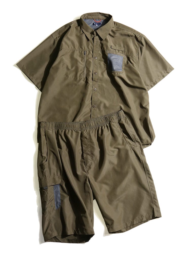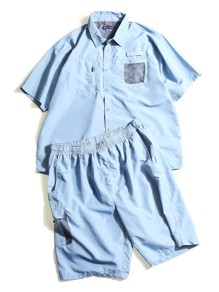 吸汗速乾とUVカット機能が付いたリップストップ 半袖シャツ ショートパンツ セットアップです。リップストップ生地で耐久性に優れています。汗を素早く吸収、拡散し、ウェア内を快適な状態に保つ、吸水速乾機能。軽量&快適で動きやすい。安心の収納ポケットのZIPポケット。ボトムスのウエストはゴムとドロコード付きでサイズ調整出来ます。