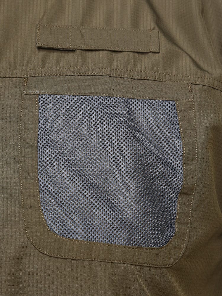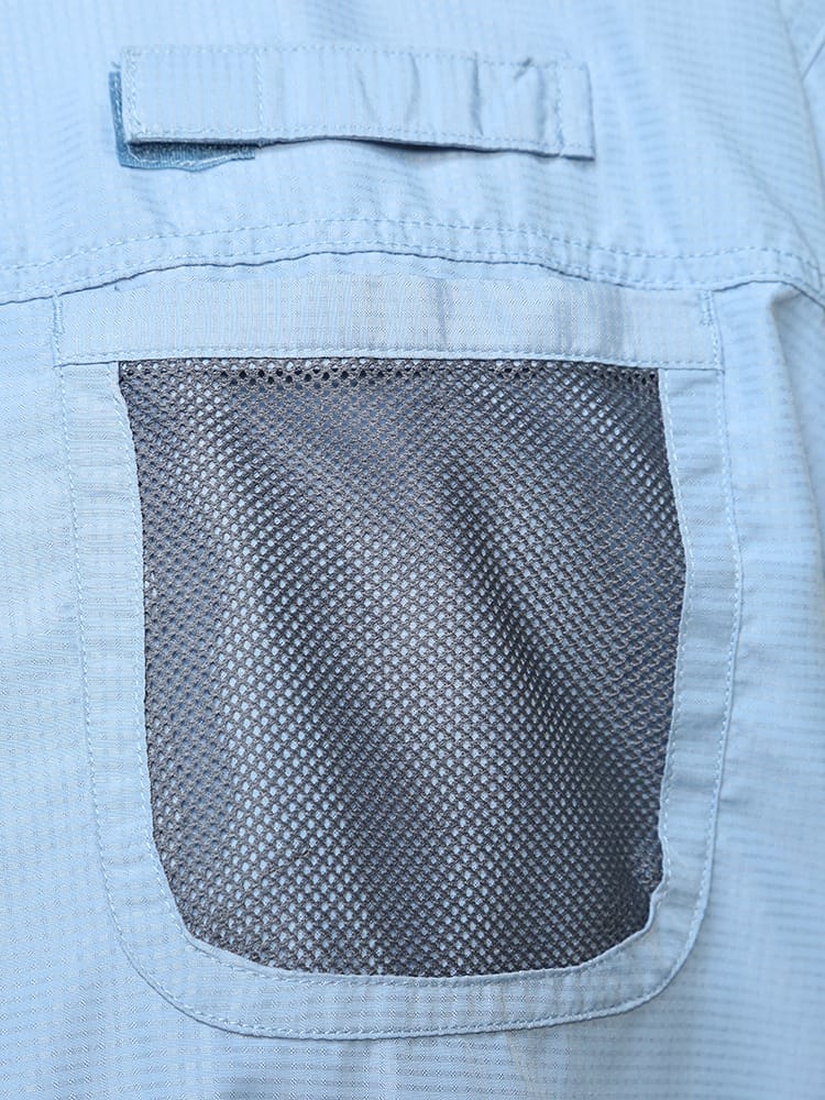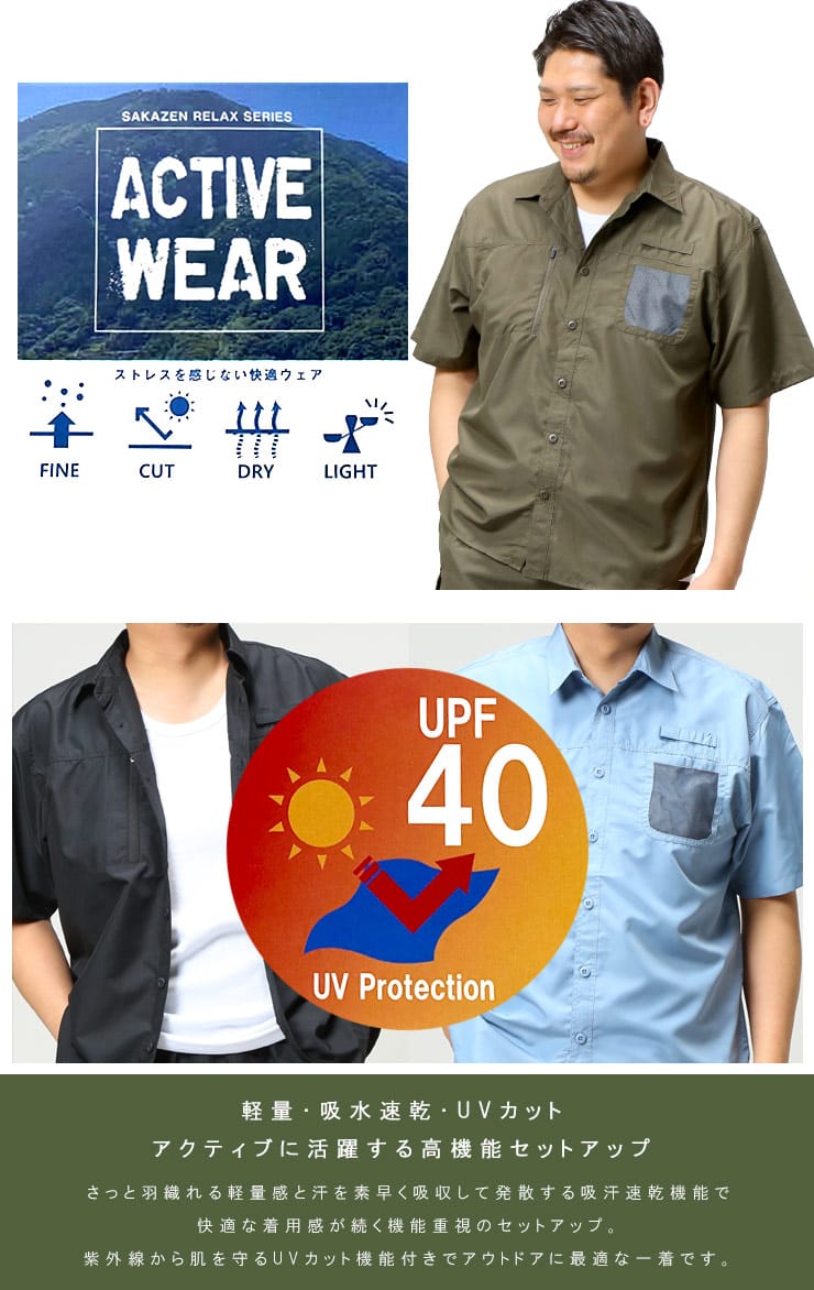 仕様 :セットアップ / トップス外側ポケット数×2つ / ボトムス外側ポケット数×4つ / ウエスト調節ゴム / 前閉じ / UPF40 / 吸水速乾 / 軽量