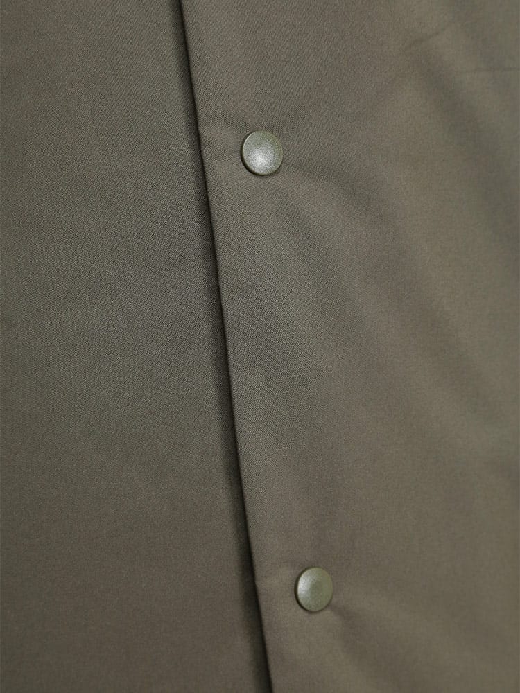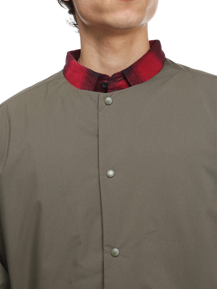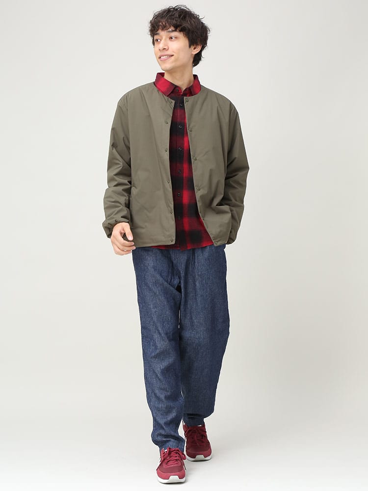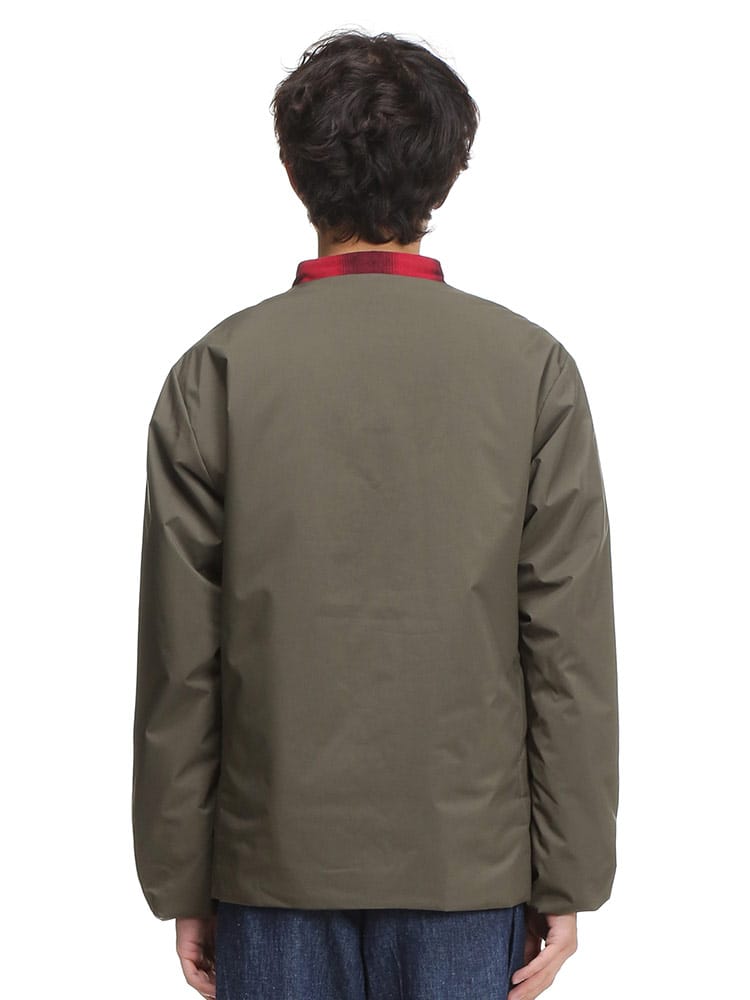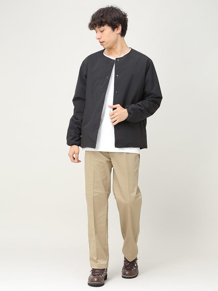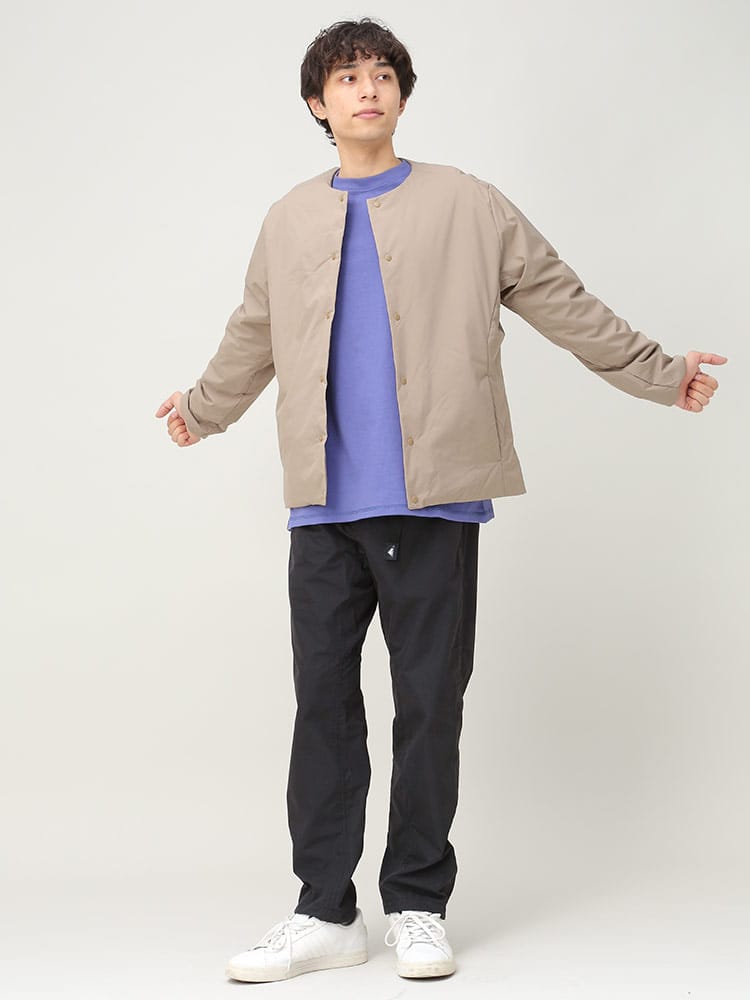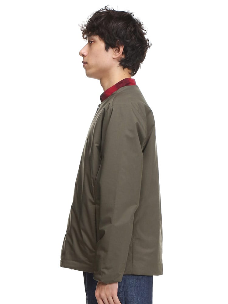 機能性素材が特徴の中綿カーディガンです。ノーカラータイプなので重ね着などの幅が広がるデザイン。撥水加工・UVカット・防風・防花粉などの機能を備えたALL-WEATHER TEXを使用した一着となっています。また、暑いときは吸熱冷却、寒いときは放熱保温をしてくれるので、屋外と屋内の行き来などの温度変化にも対応できる仕様となっているのが嬉しいポイント。