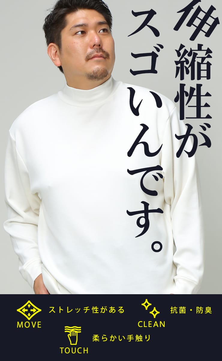 仕様 :ストレッチ性 / 柔らかい手触り / 抗菌防臭 / モックネック