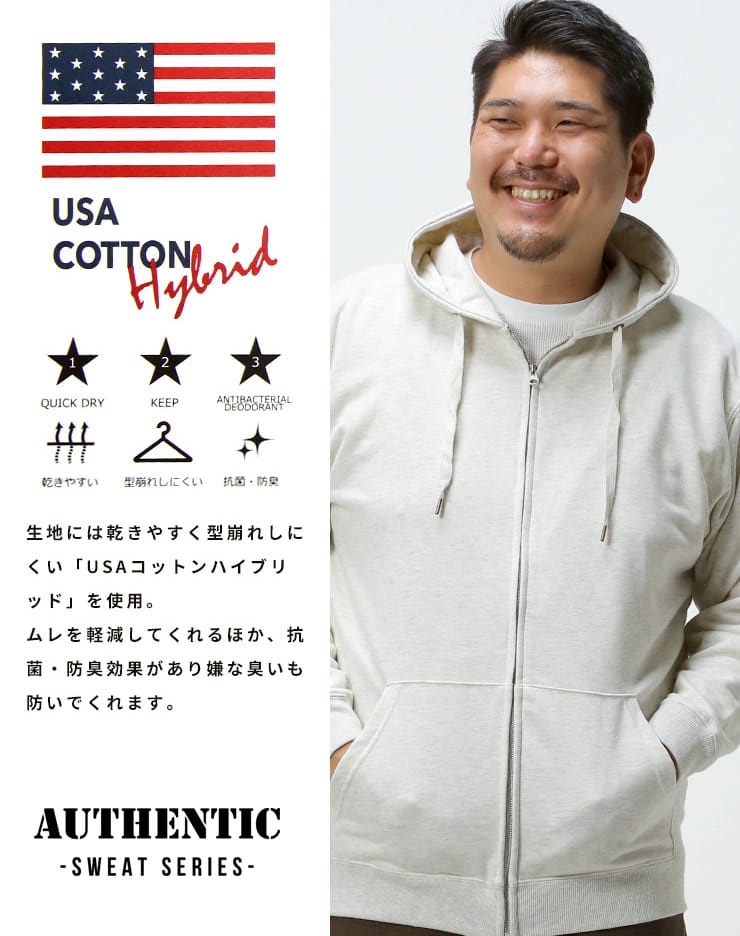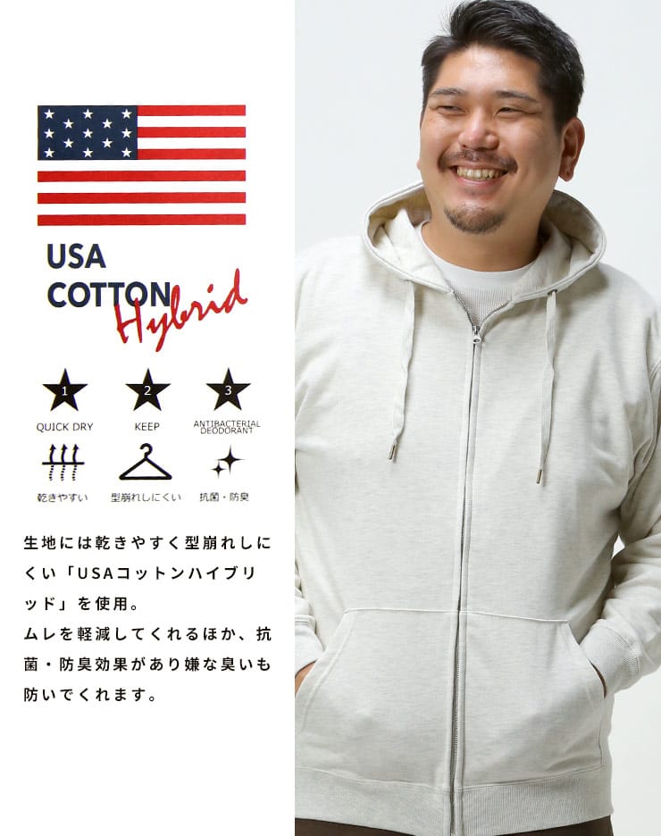 綿にポリエステルを混紡することで、乾きやすく型崩れしにくい「USAコットンハイブリッド」を使用した裏毛フーデッドフルジップスウェットパーカーです。デオドラントテープにより抗菌・防臭機能を備えた、カジュアルスタイルのマストアイテムです。