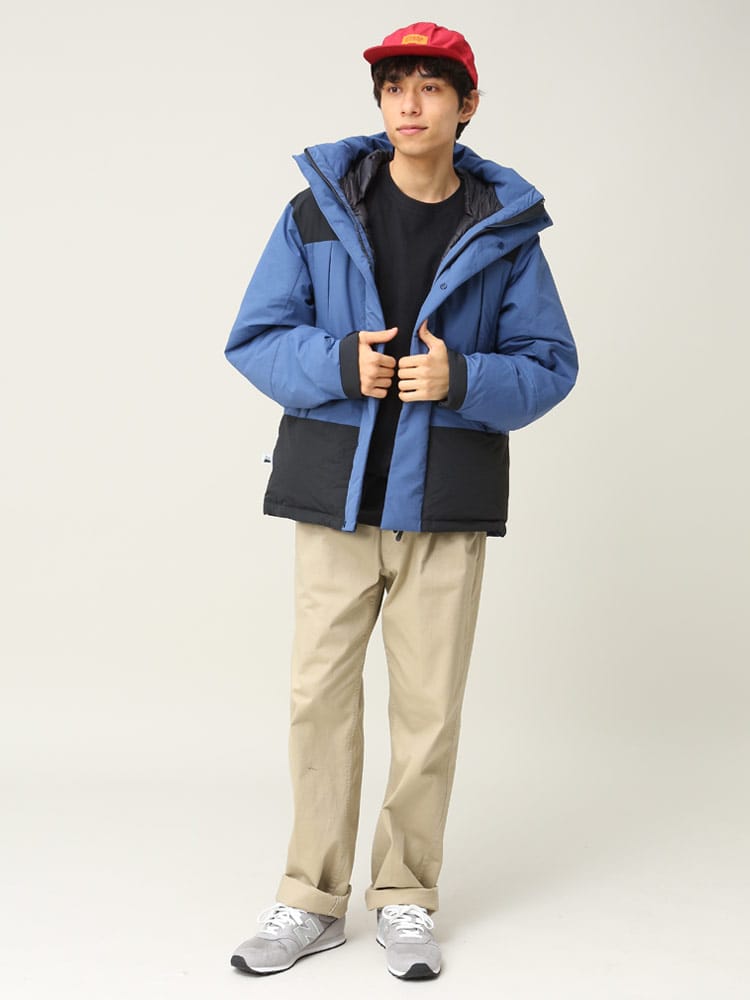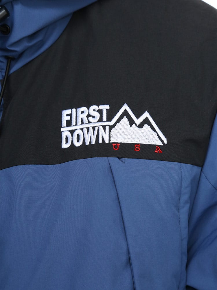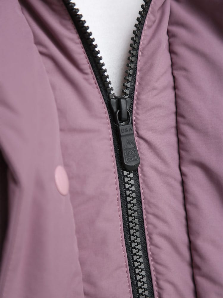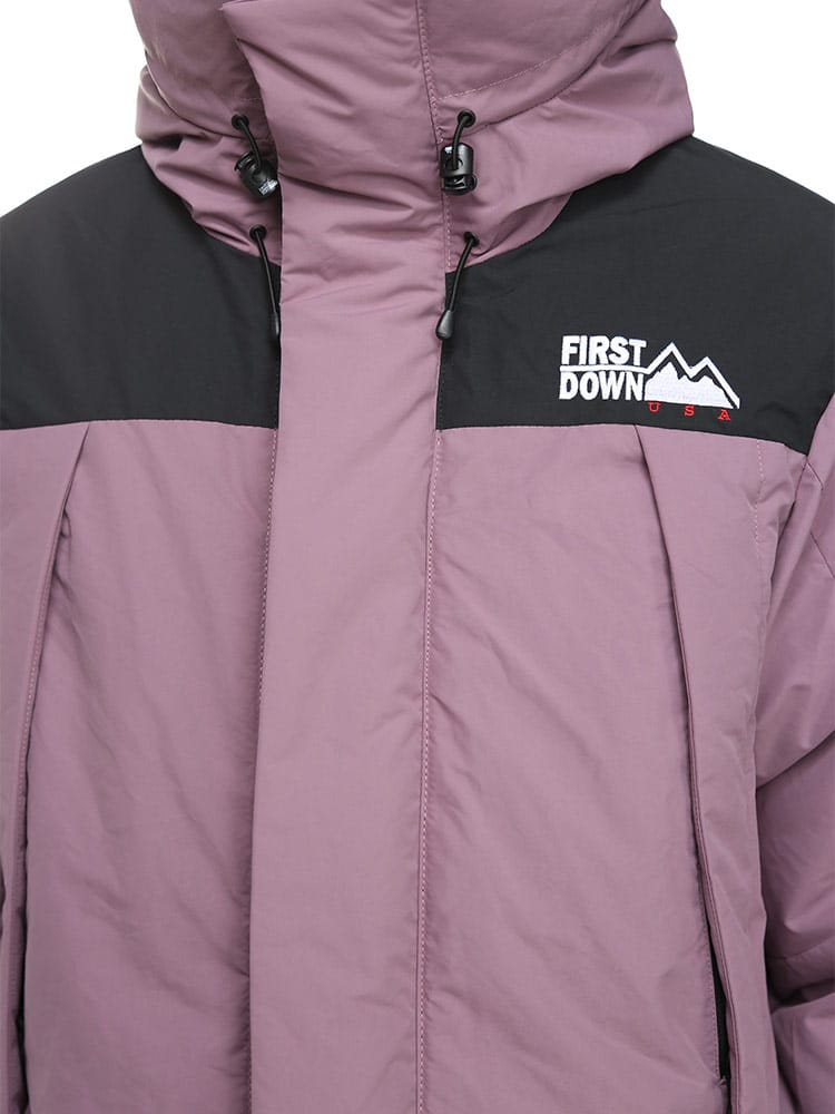 FIRST DOWNを象徴するラップダウンジャケット。今年度はトレンド感のあるニュアンスカラーで切り替えた配色デザイン。大きめのフード&首元まですっぽりと収まる衿高仕様で防寒能力も高い。前立てはW仕様でアウトドアにも問題ない本格仕様。スナップ釦で開閉も容易。90年代のオリジナルタイベックネームを再現しており現代でも魅力的なデザイン。
