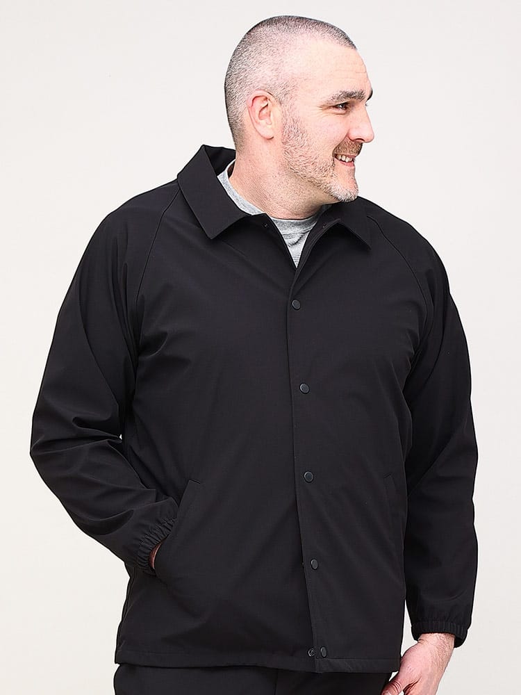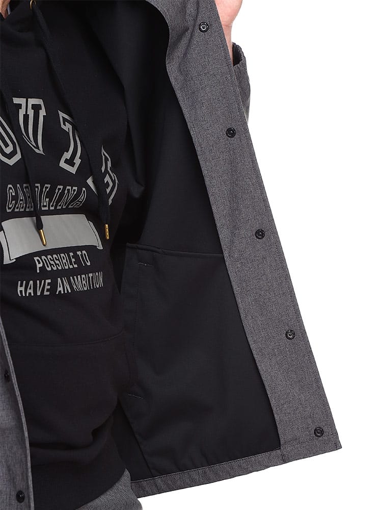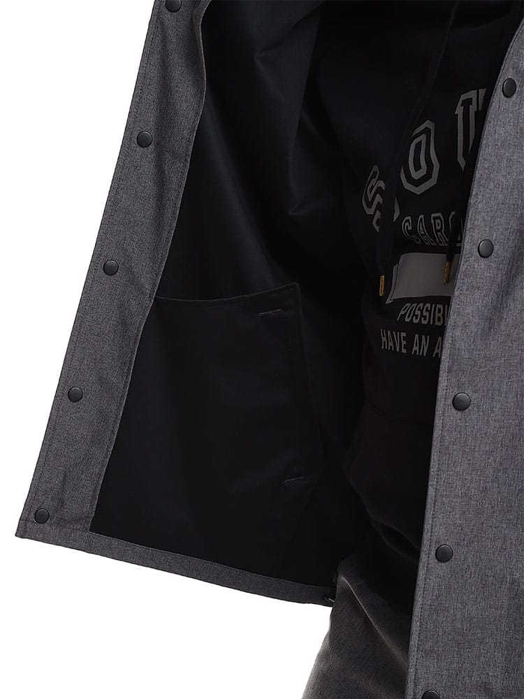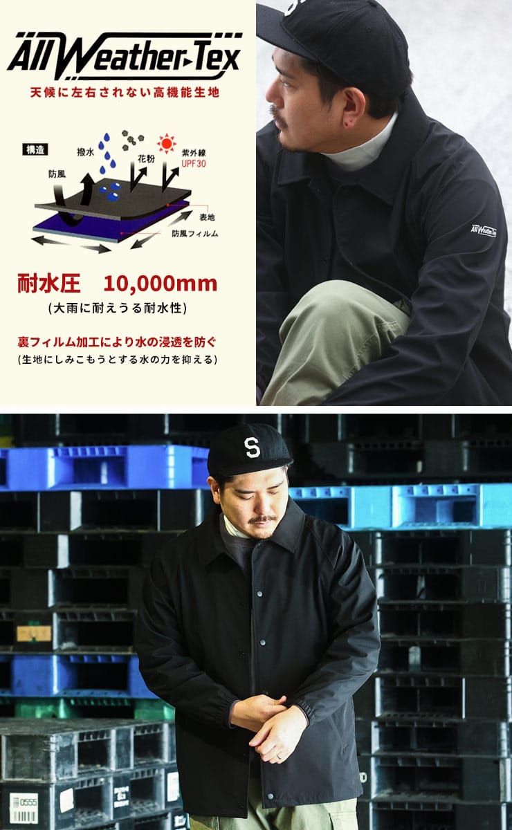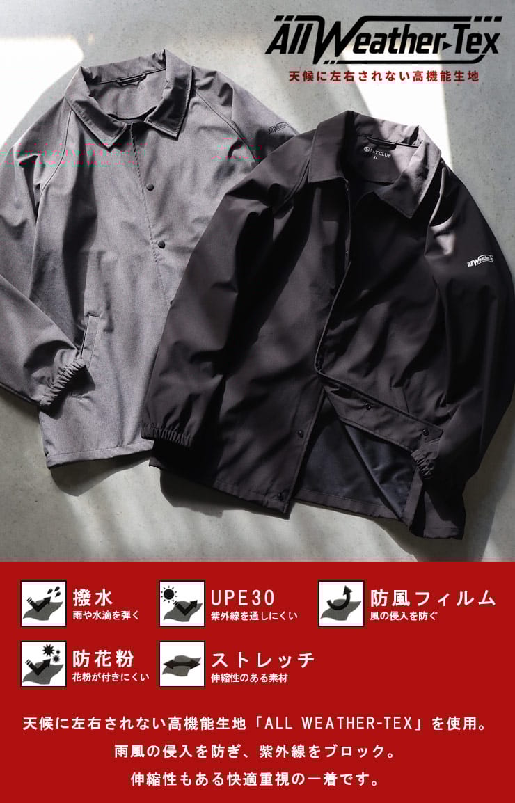 天候に左右されない高機能生地「ALL-WEATHER TEX」を使用したボンディングコーチジャケットです。カジュアルスタイル定番のコーチジャケット。ボンディング加工が施されているのでハリのある上品なシルエットとなっています。裾にはドローコードが入っています。カジュアルコーデはもちろんビジネススタイルにもマッチするアイテム。ALL-WEATHER TEXを使用しているので撥水性、防風、防花粉に加え、紫外線を防ぐUPF30の高機能が魅力。ストレッチ性もあるので非常に動きやすい一着となっています。