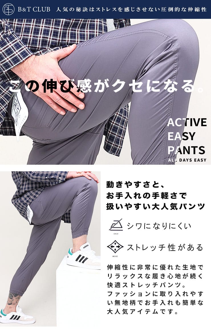 ストレッチ素材で楽な履き心地のアクティブイージージョガーパンツです。薄手の生地感が軽量なパンツ。ストレッチ機能でアクティブなシーンにぴったりな一本です。ウエストゴムとドローコードで細かな調整が可能となっています。