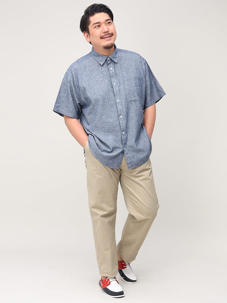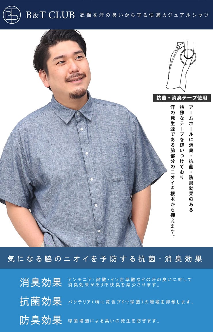 B&T CLUBの綿麻 無地 半袖 シャツです。暑い季節の定番の麻シャツ。綿の滑らかさと麻の涼感がミックスされ、非常にバランスの良い着心地の一着となっています。脇部分に消臭テープを使用しているので、抗菌・防臭効果があり暑い季節でも清潔なままでいられます。
