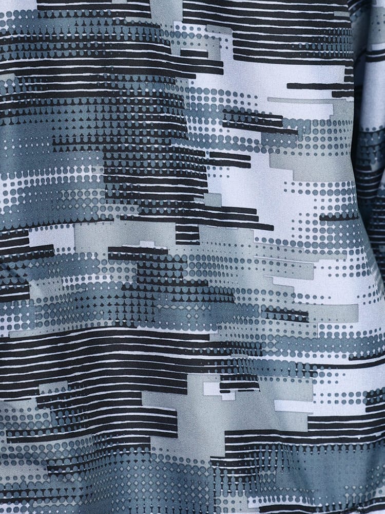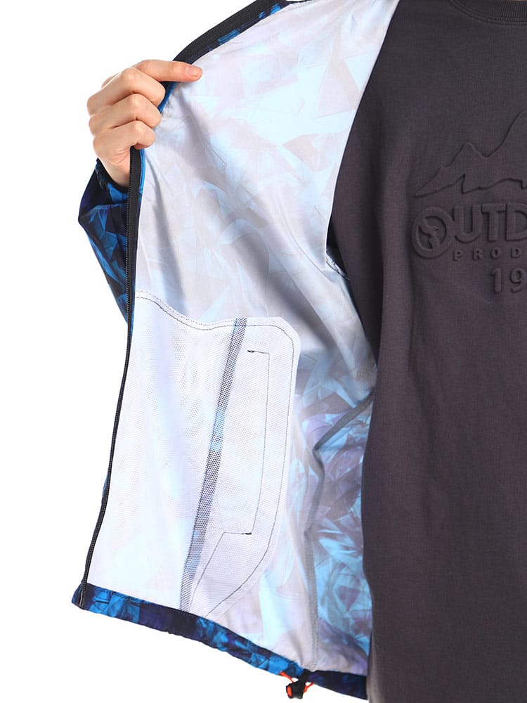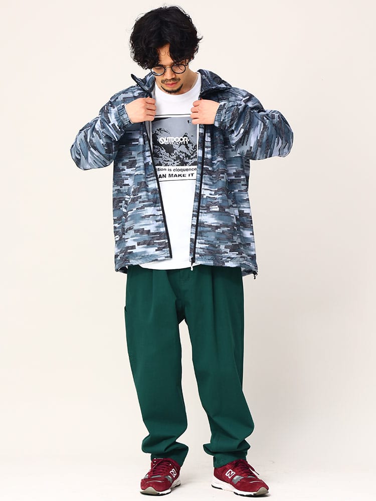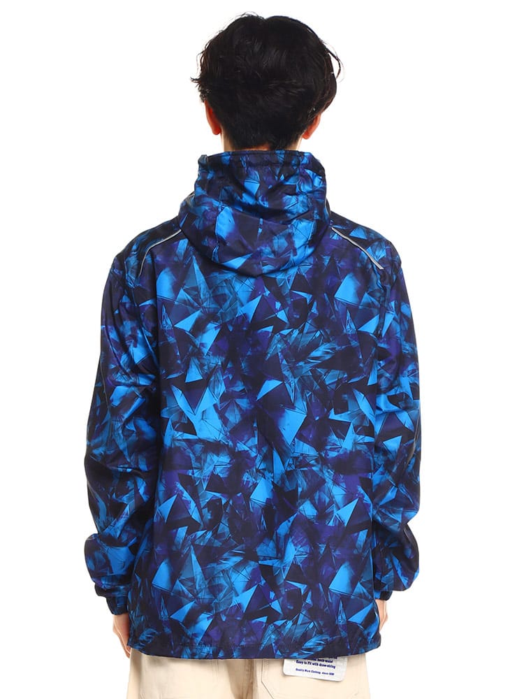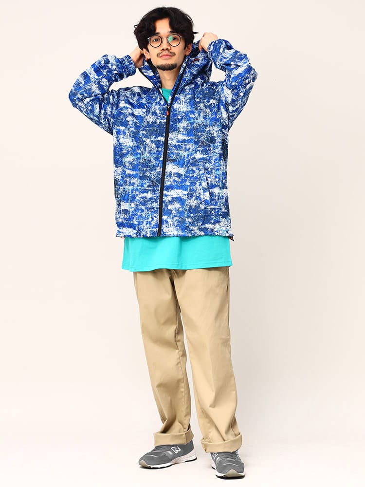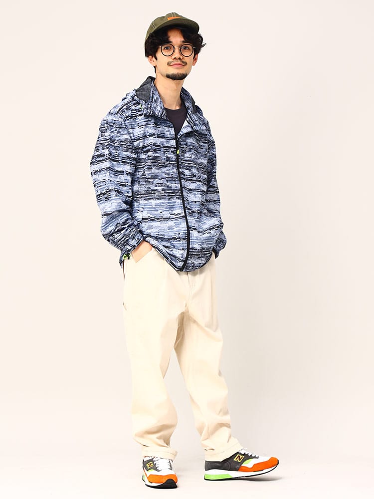 FIRST DOWN BASICの撥水 ポケッタブル 総柄プリント フルジップ ウィンドブレーカーです。ソフトタッチポリエステル「楽tive」を使用した機能性ウェア。防水・透湿・防風・防花粉・紫外線対策などの多機能な一着。リフレクター素材を使用しているので夜道などでも安心なつくりとなっています。小さくたたんで袋に収納しておけるポケッタブルタイプなのも嬉しいポイント。