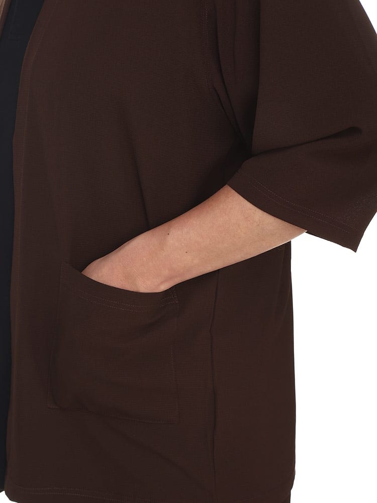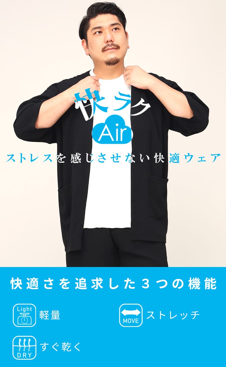 ストレスを感じさせない快適ウェアとして大人気!サカゼンオリジナルの快ラクAIRの ドライ ストレッチ 7分袖 トッパーカーディガンです。リラックスしたトッパ―カーディガンのシルエット、ストレッチ素材によるストレスフリーな着心地が特徴的です。薄手で軽量感があり、すぐ乾きやすいドライ素材を使用しています。アームホールには抗菌防臭テープを配しているので、清潔な着心地が楽しめます。