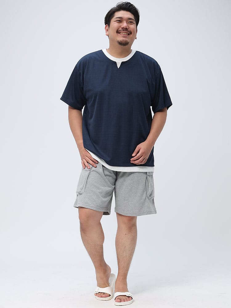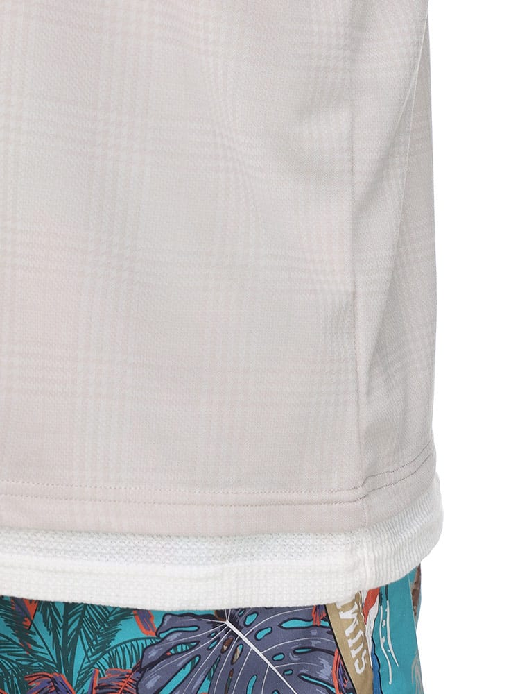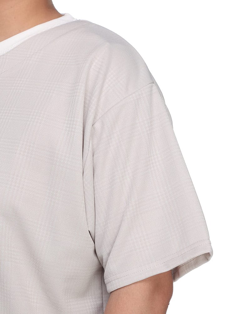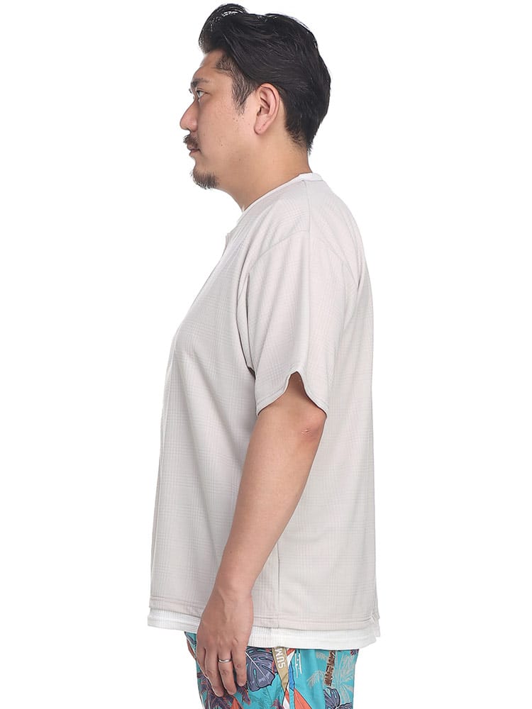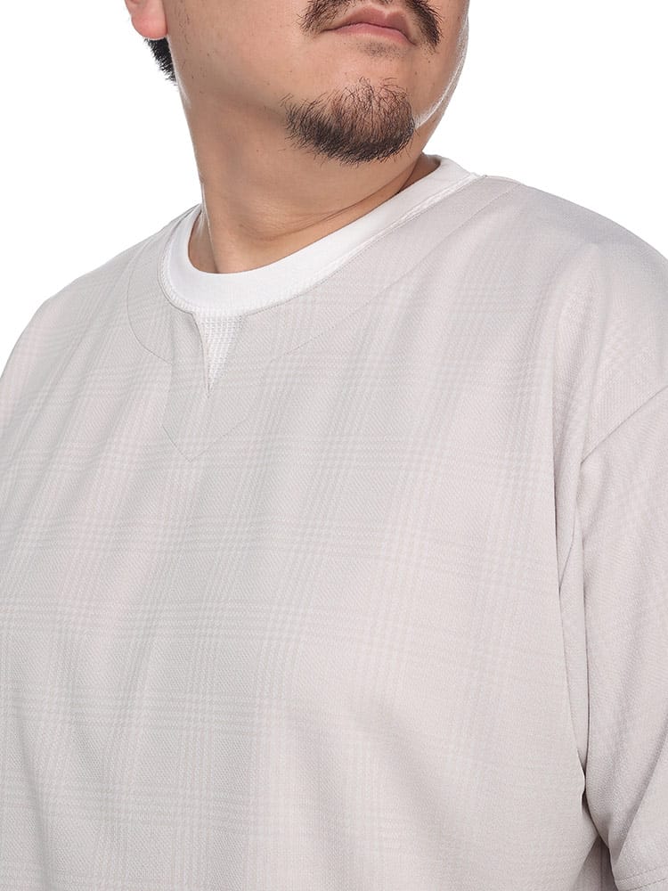 B&T CLUBのチェックジャガード フェイクキーネック 半袖 Tシャツ。落ち着いた雰囲気のチェックジャガードのボディとワッフル素材をインナーに見立てたフェイクレイヤードデザイン。キーネックとなっていて非常にリラックスしたシルエットをつくりだしてくれます。大人らしさのあるカジュアルスタイルに最適な一枚です。