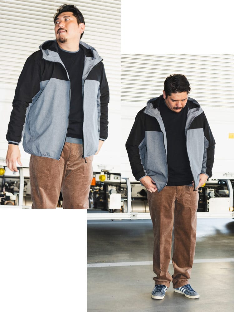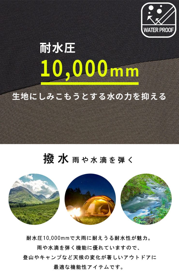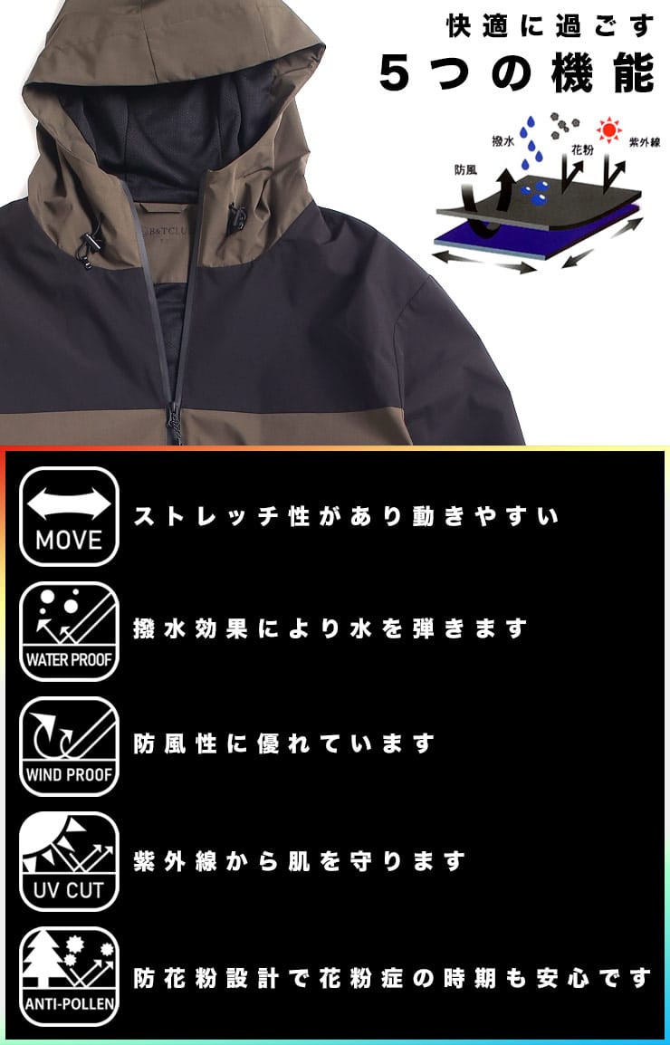 仕様 :外側ポケット数×2つ / シングルジップ(止水ファスナー) / 防花粉 / 撥水加工 / 防風性 / ストレッチ / UVケア / 生地に染み込む水を抑える