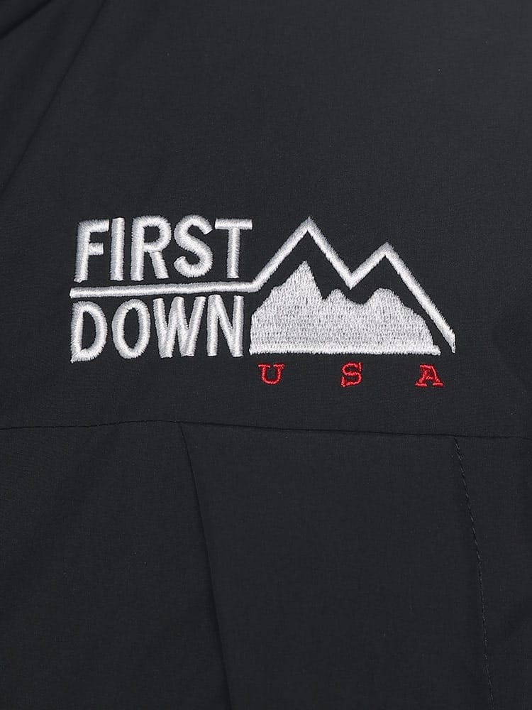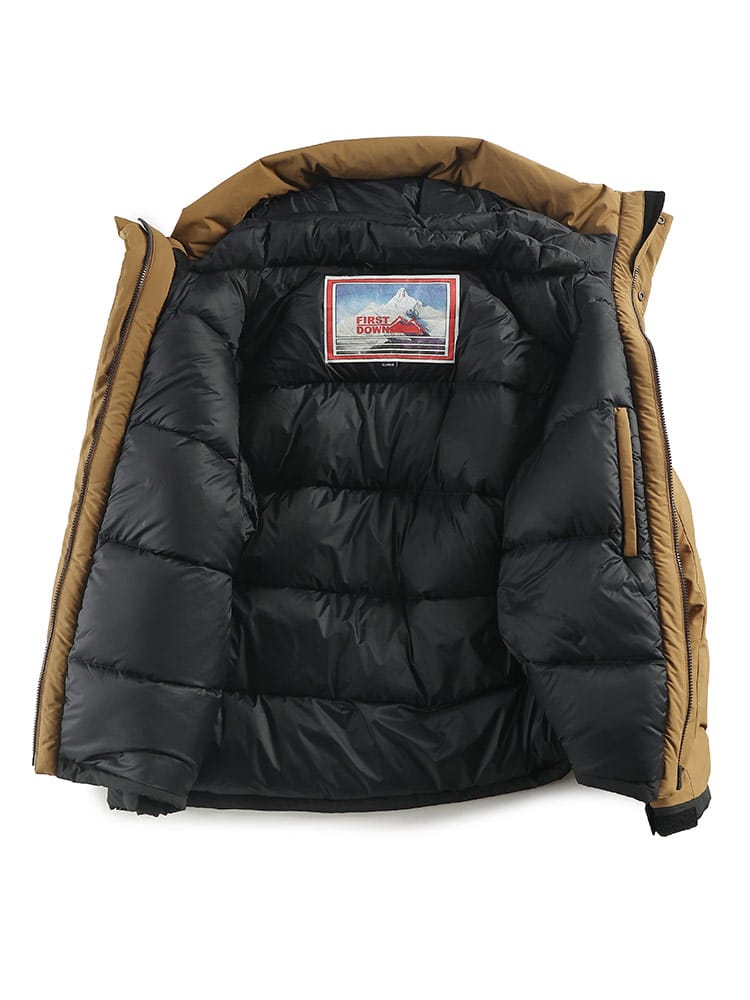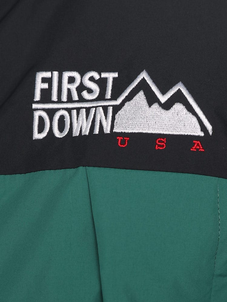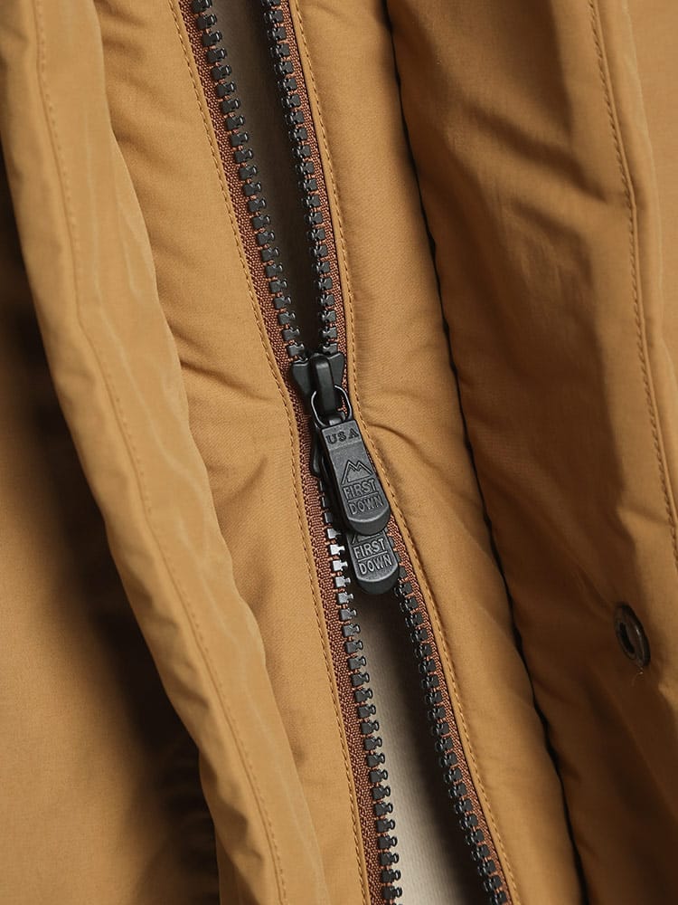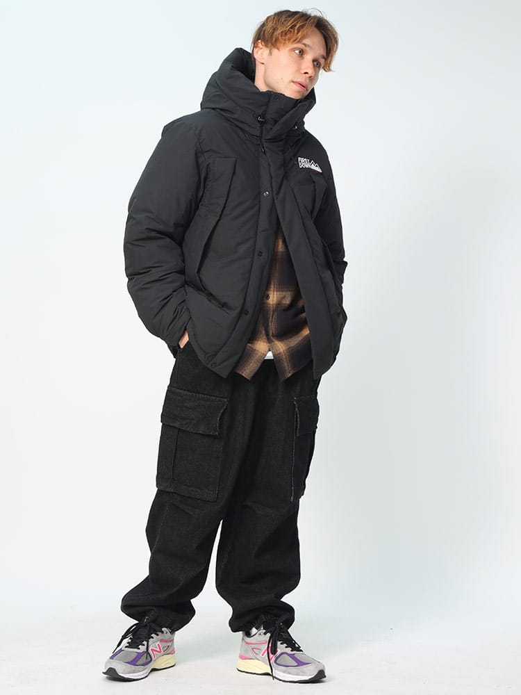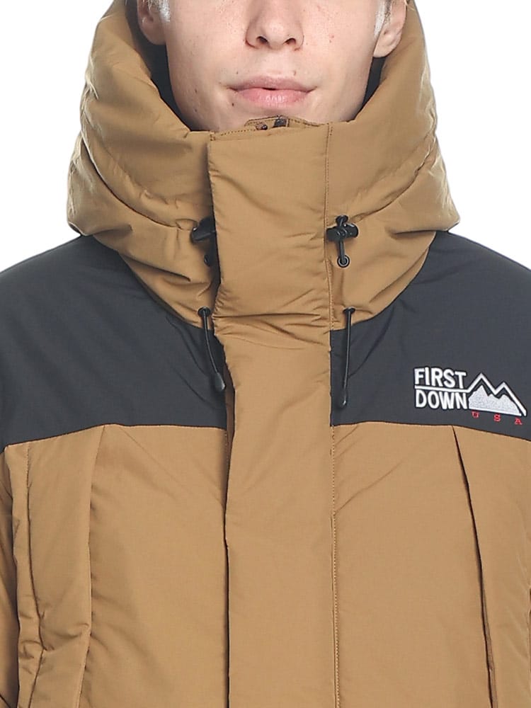 FIRST DOWNを象徴するラップダウンジャケット。大きめのフード&首元まですっぽりと収まる衿高仕様で防寒能力も高い。前立てはW仕様でアウトドアにも問題ない本格仕様。スナップ釦で開閉も容易。90年代のオリジナルタイベックネームを再現しており現代でも魅力的なデザイン。