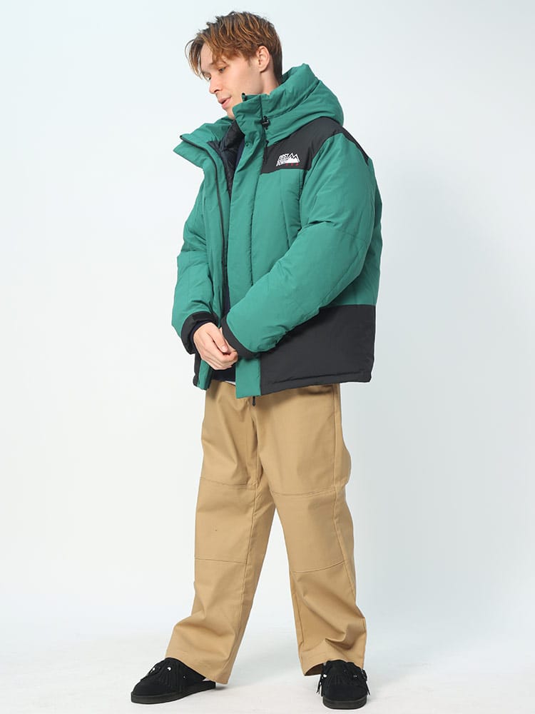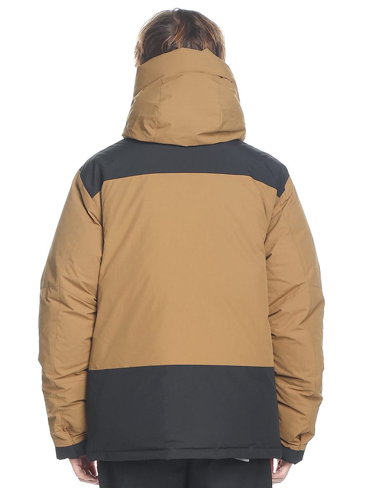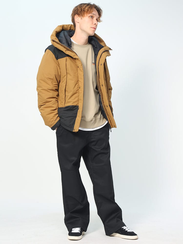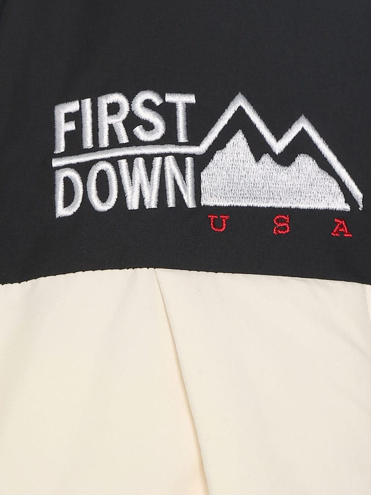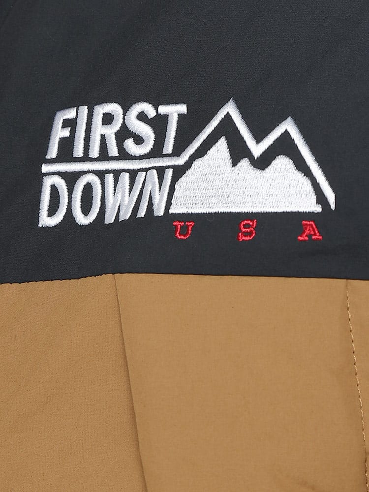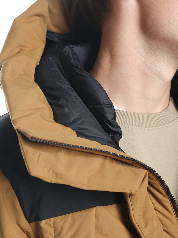 FIRST DOWNを象徴するラップダウンジャケット。大きめのフード&首元まですっぽりと収まる衿高仕様で防寒能力も高い。前立てはW仕様でアウトドアにも問題ない本格仕様。スナップ釦で開閉も容易。90年代のオリジナルタイベックネームを再現しており現代でも魅力的なデザイン。