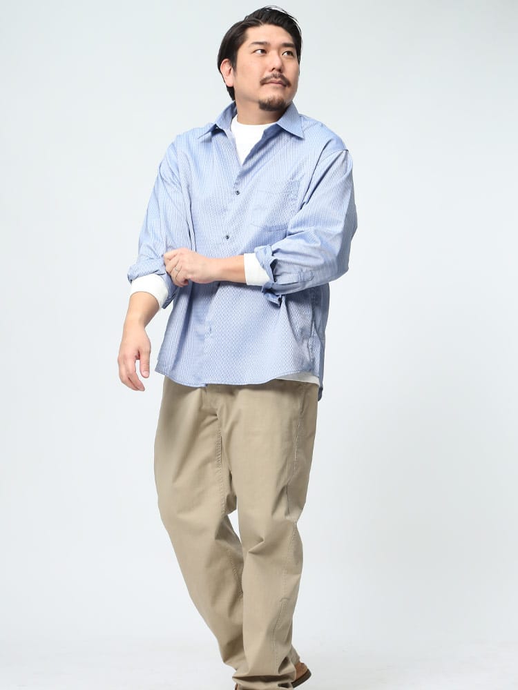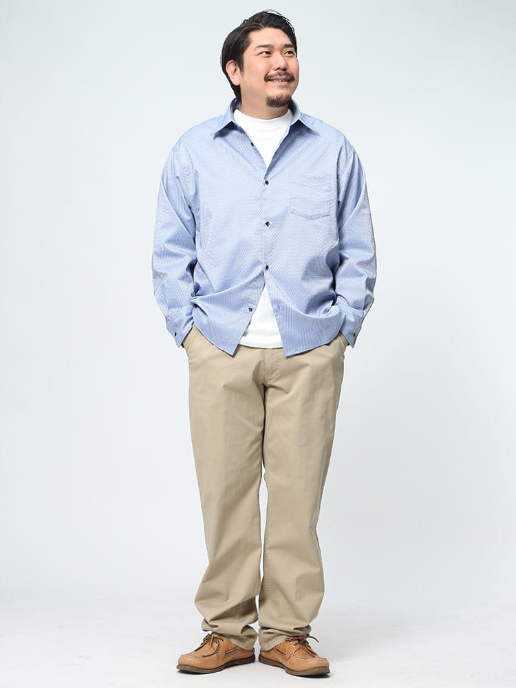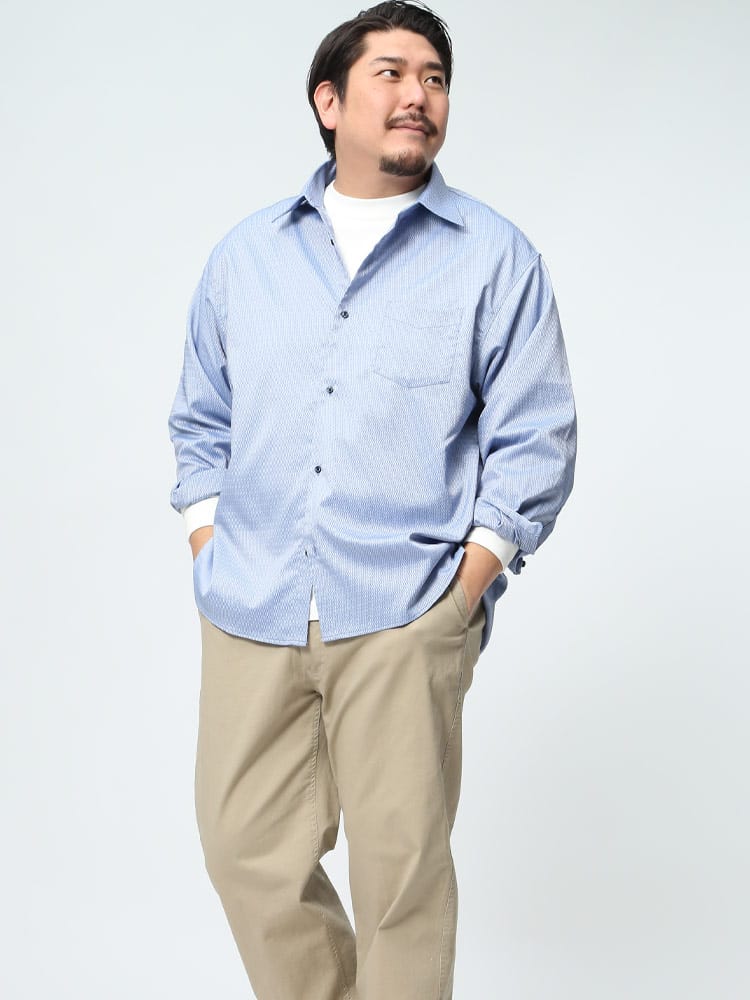 オールシーズン着用可能なカジュアルなビジネスカジュアルスタイルにぴったりのストレッチ性のあるヘリンボーン長袖シャツ。そのストレッチ性により、動きやすさと快適な着心地を提供します。シンプルながらも上品なヘリンボーン柄が、洗練された雰囲気を演出します。仕事や休日、様々なシーンで活躍する汎用性の高い一着です。