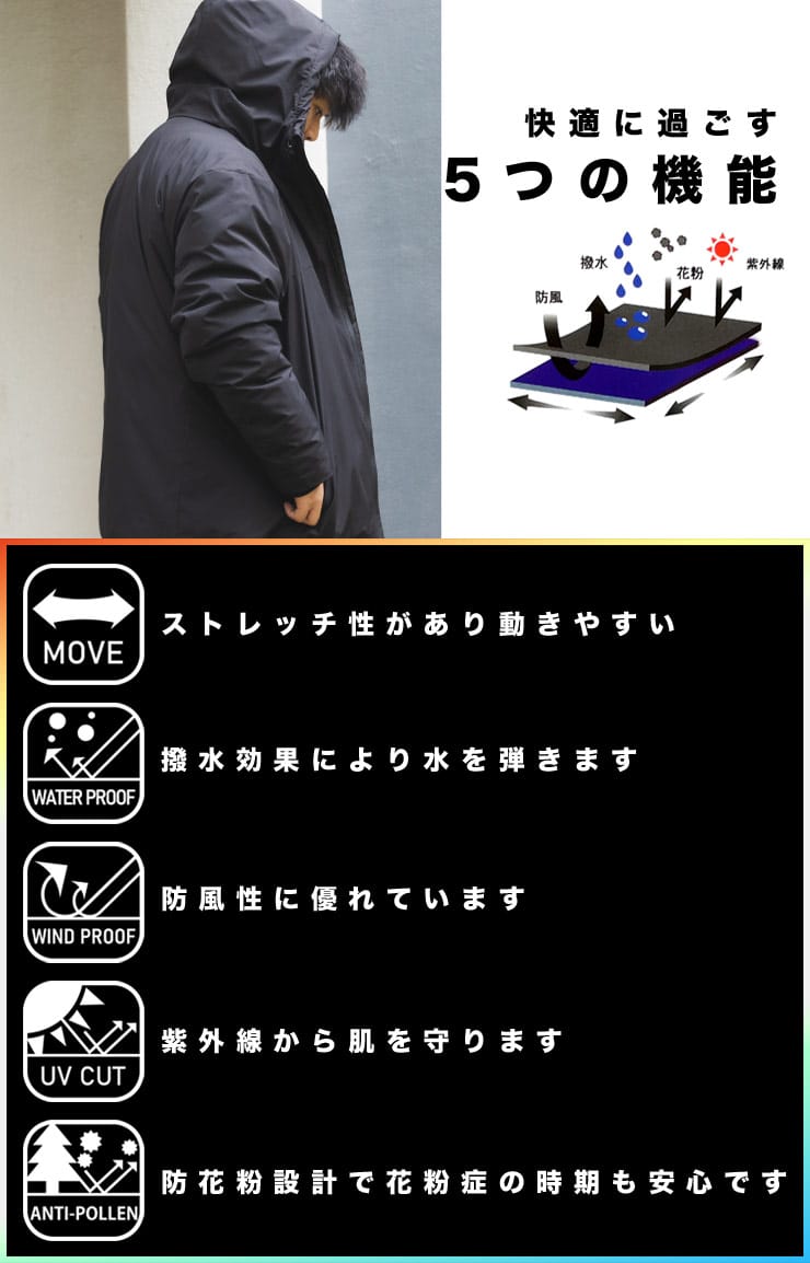 仕様 :外側ポケット数×2つ / 内側ポケット数×1つ / シングルジップ(止水ファスナー) / 撥水加工 / 防花粉 / UVカット / 防風性 / ストレッチ
