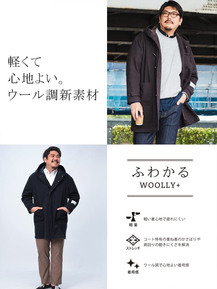 「ふわっと軽くて心地よい」長時間着ても疲れない軽量さとラクに動けるストレッチ素材に加え、ウール調素材を使用した「WOOLLY+」。
