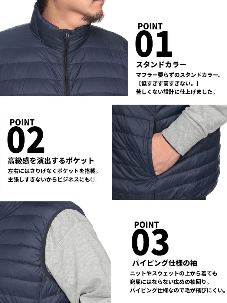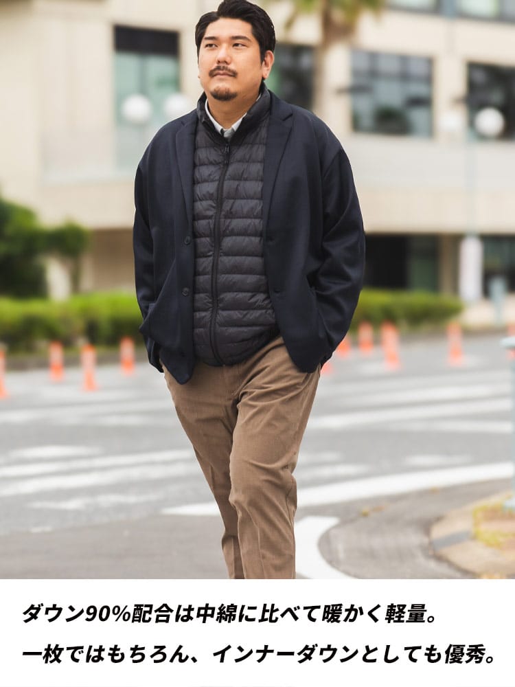 ダウン90%配合した、暖かく軽量の高級感があるライトダウンです。