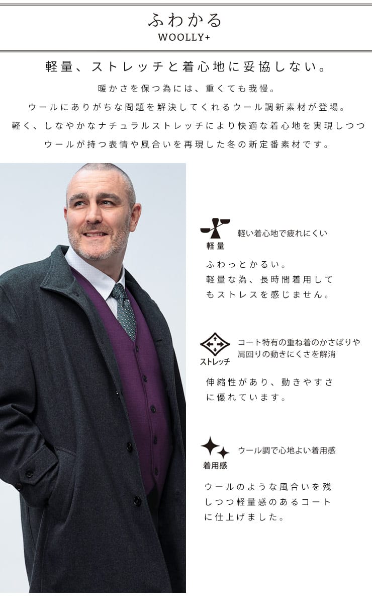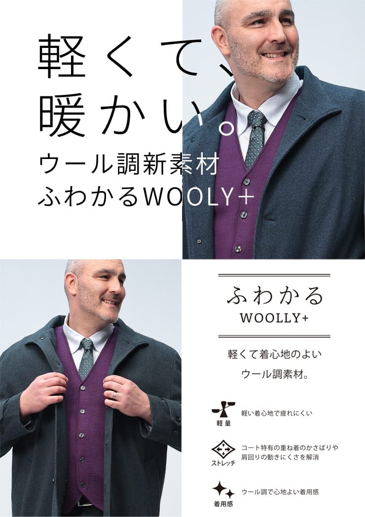長時間着ても疲れない軽量さとラクに動けるストレッチ素材に加え、ウール調素材を使用した「WOOLLY+」。
