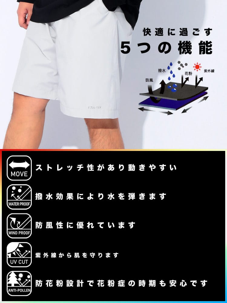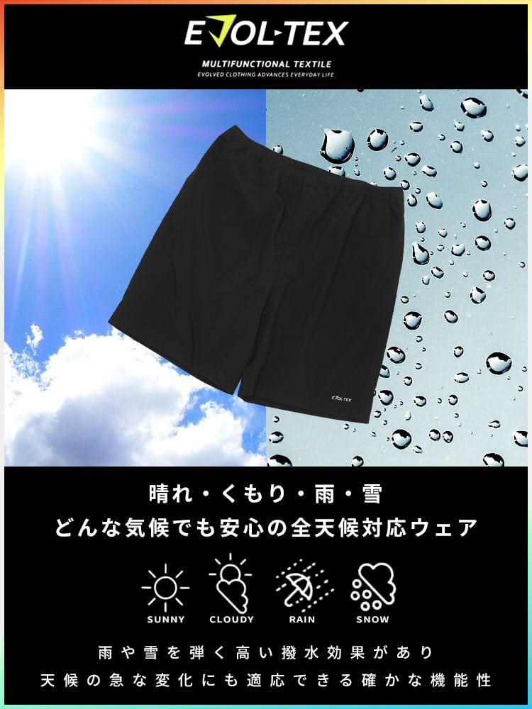 2025 SS COLLECTIONアクティブな毎日を快適にサポートする、高機能ショーツ。表地には、撥水性・防風性・透湿性に優れたEVOL-TEX素材を採用。汗をかいても肌に張り付きにくく、快適な着心地をキープします。裏地には通気性の高いメッシュ素材を使用し、ムレを軽減。汗をかいてもさらっとした肌触りを保ちます。ストレッチ素材を使用することで、動きやすさを向上。アクティブな動きにも対応できます。外側に4つのポケットを備え、スマートフォンや小物を収納できます。ウエストサイズを調整できるコード付きで、フィット感を高めます。様々なコーディネートに合わせやすいシンプルなデザイン。3L~10L相当と、幅広いサイズ展開なので、自分にぴったりのサイズが見つかります。スポーツやアウトドアはもちろん、タウンユースやレジャーなど、様々なシーンで活躍します。Tシャツやポロシャツと合わせて、カジュアルなスタイルを楽しめます。