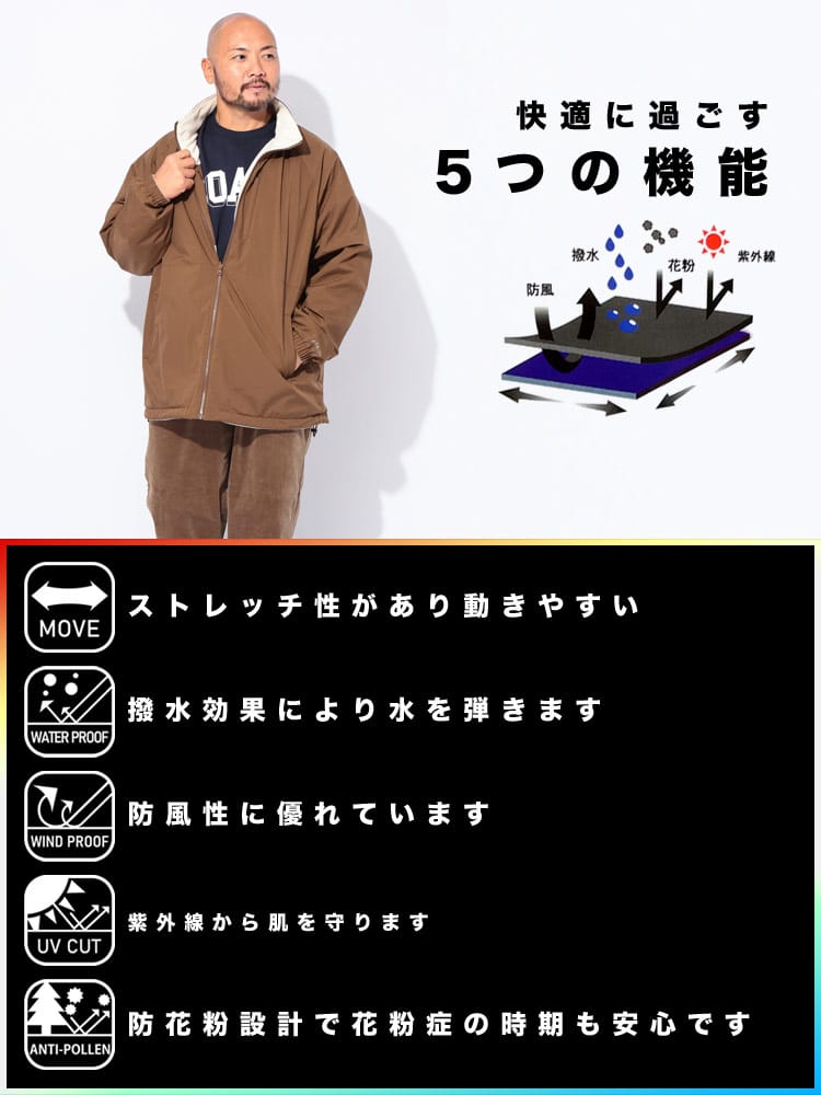 仕様 :[表]外側ポケット数×3/内側ポケット数×3/裾ドローコード/ストレッチ/撥水/防風/防紫外線/防花粉/リバーシブル