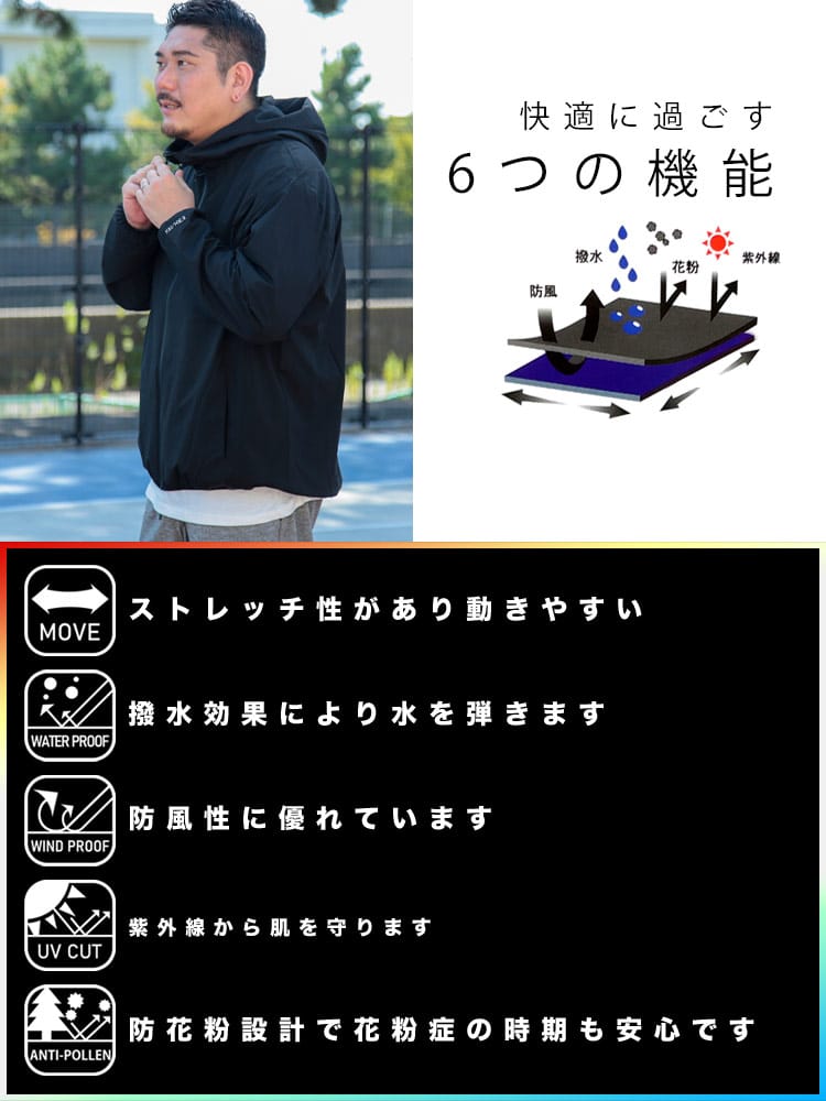 仕様 :外側ポケット数×2つ / 裏地メッシュ / 撥水 / 透湿 / 防花粉 / 防風 / ストレッチ / シングルジップ
